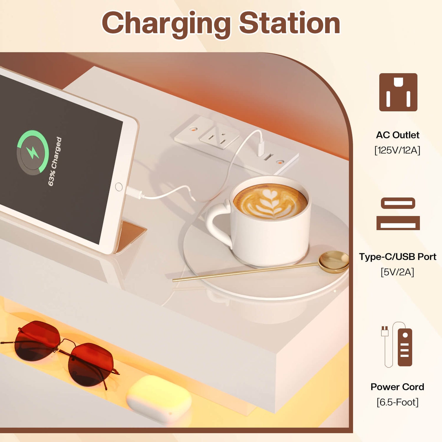 Each side table has 1 power outlet, 1 USB port, and 1 Type C port, plus 2 layers of storage space and controllable LED light strips.