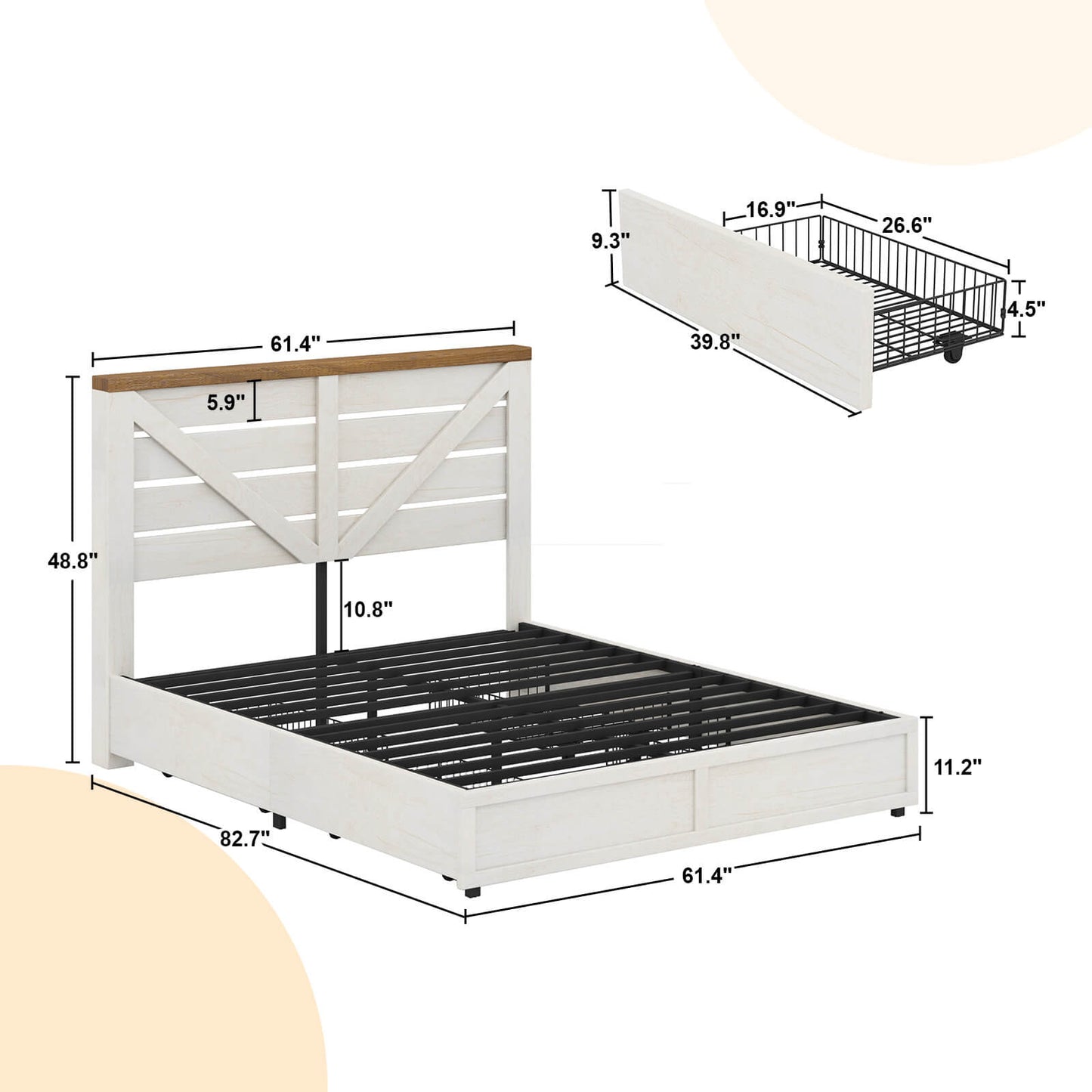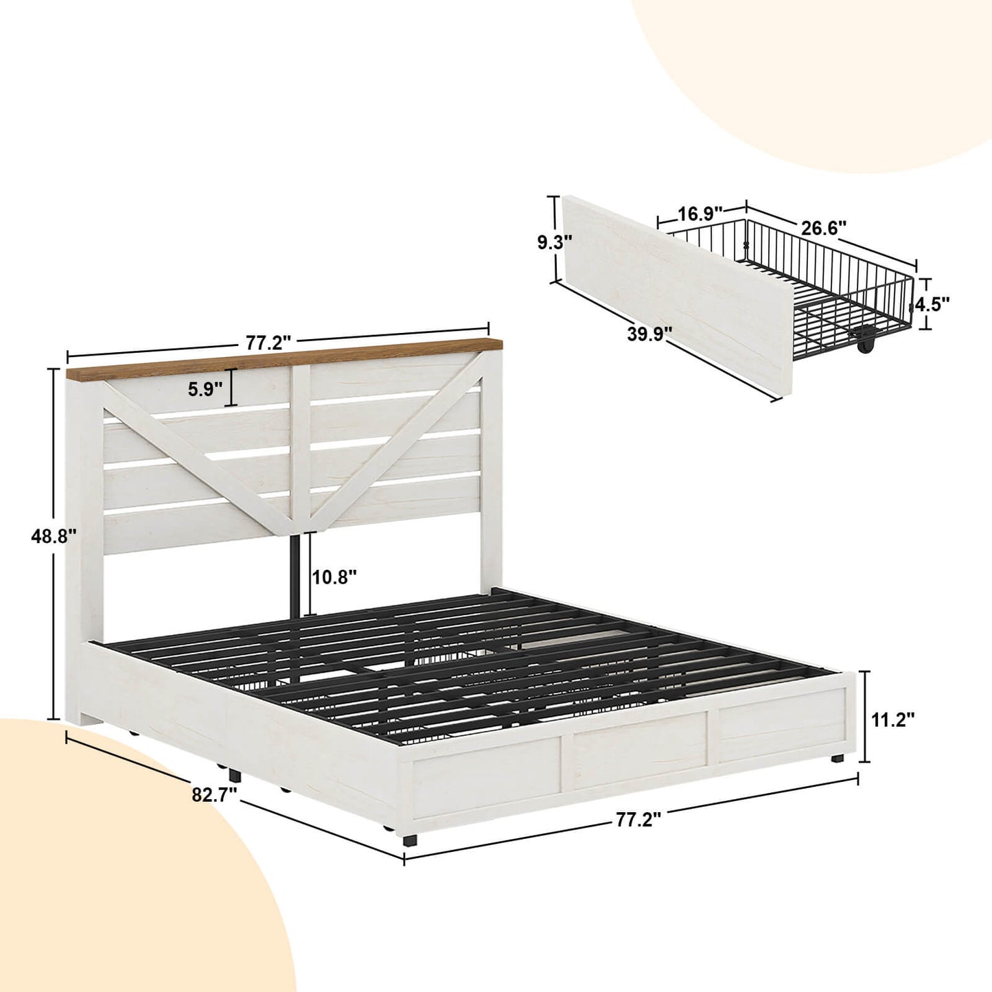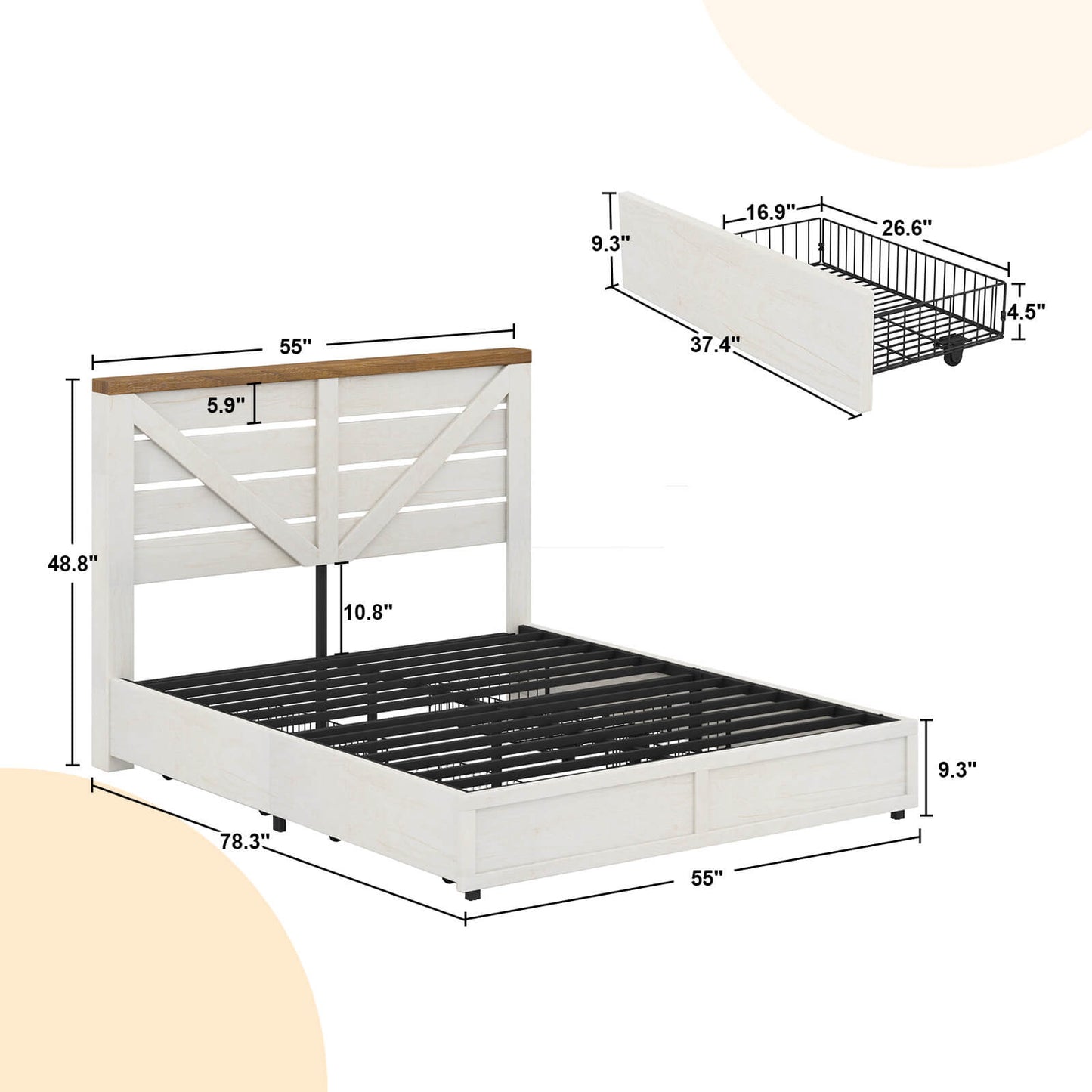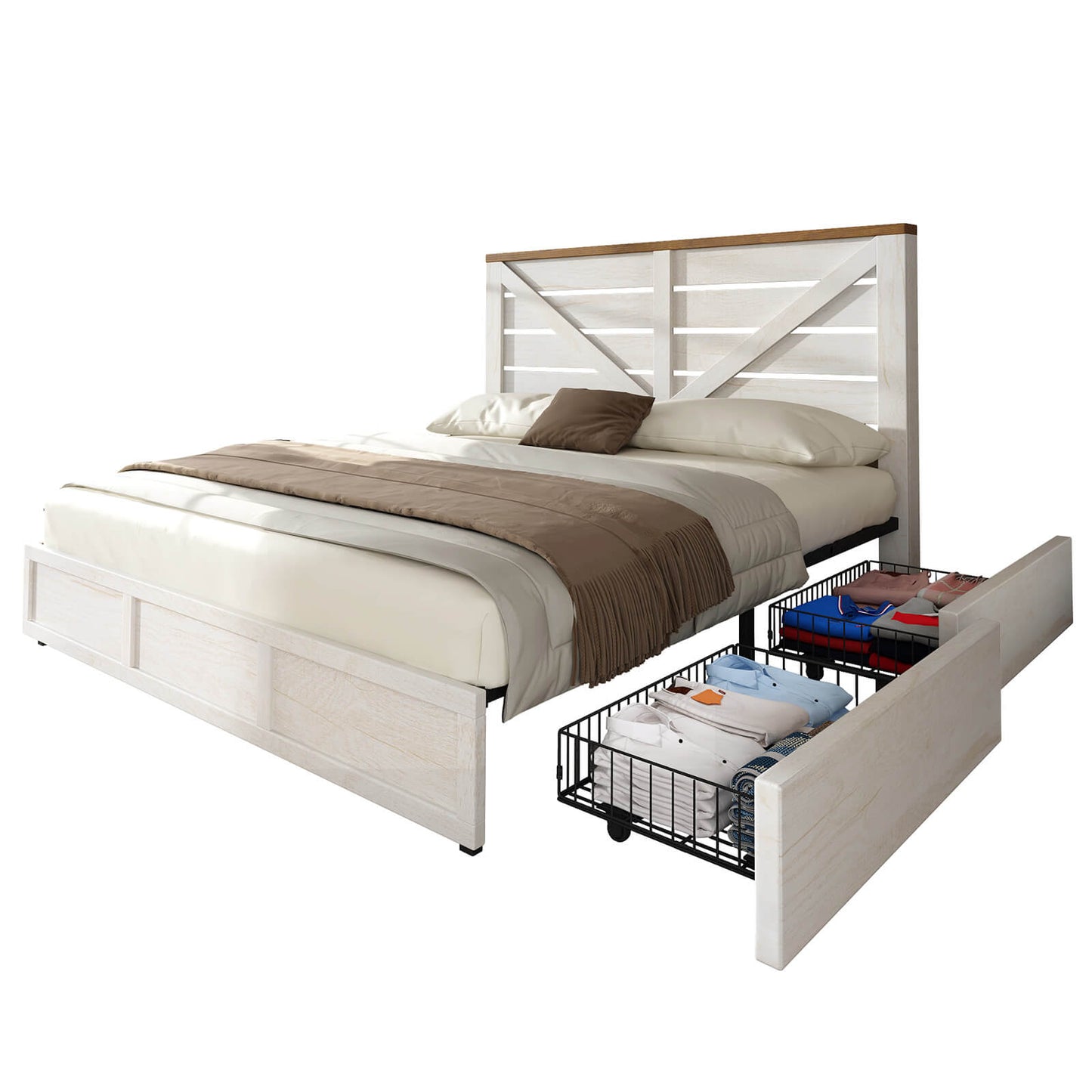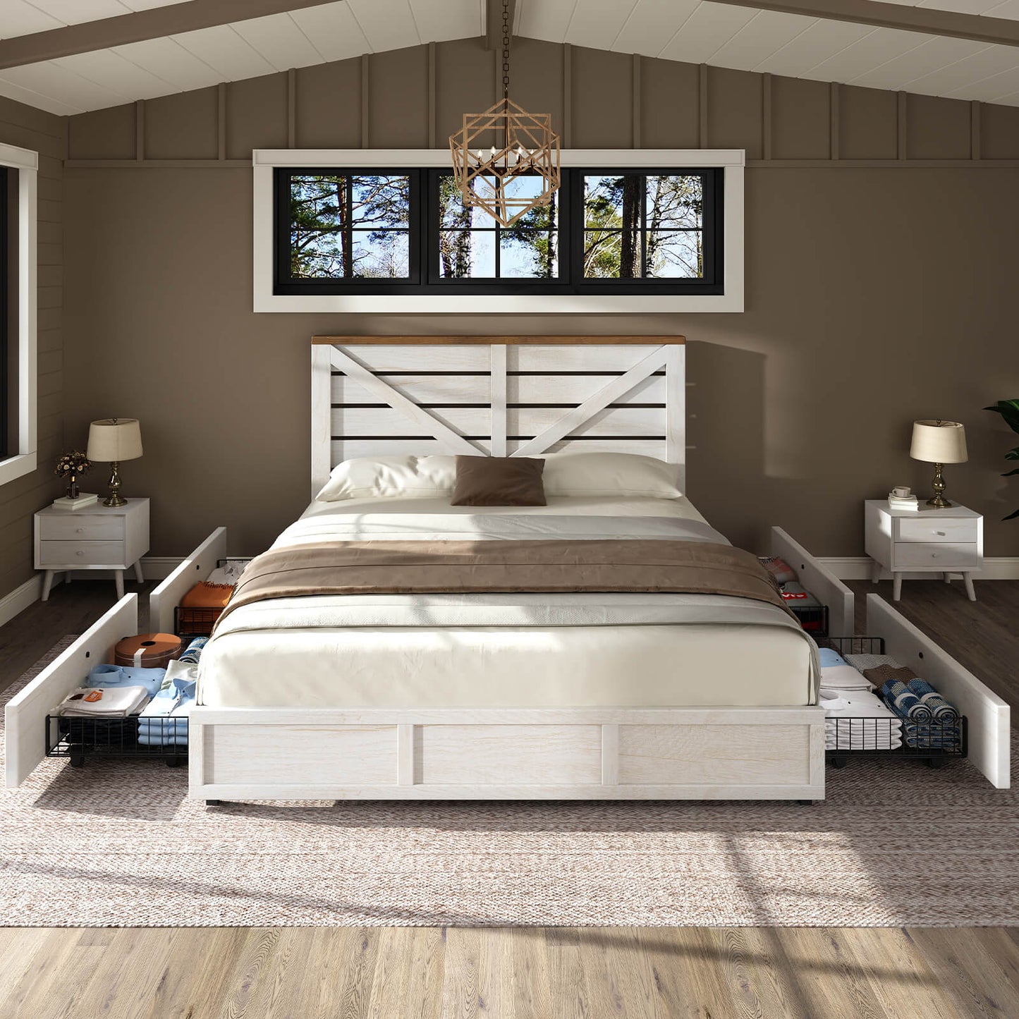 The Bandera Bed Frame with 4 Drawers combines rustic charm with modern functionality, featuring a natural wood grain finish and a barn-style headboard with a striking arrow design. This platform bed offers extra storage with 4 large lockable drawers, perfect for organizing clothes, bedding, and more. Each drawer is equipped with 4 wheels for smooth sliding, making it easy to access your stored items. Built for durability and stability, the bed supports up to 1,000 lbs without the need for a spring box, ensuring a comfortable and secure sleep environment. With easy assembly and a dedicated 24-hour customer service team, the Bandera Bed Frame is a practical and stylish addition to any bedroom.