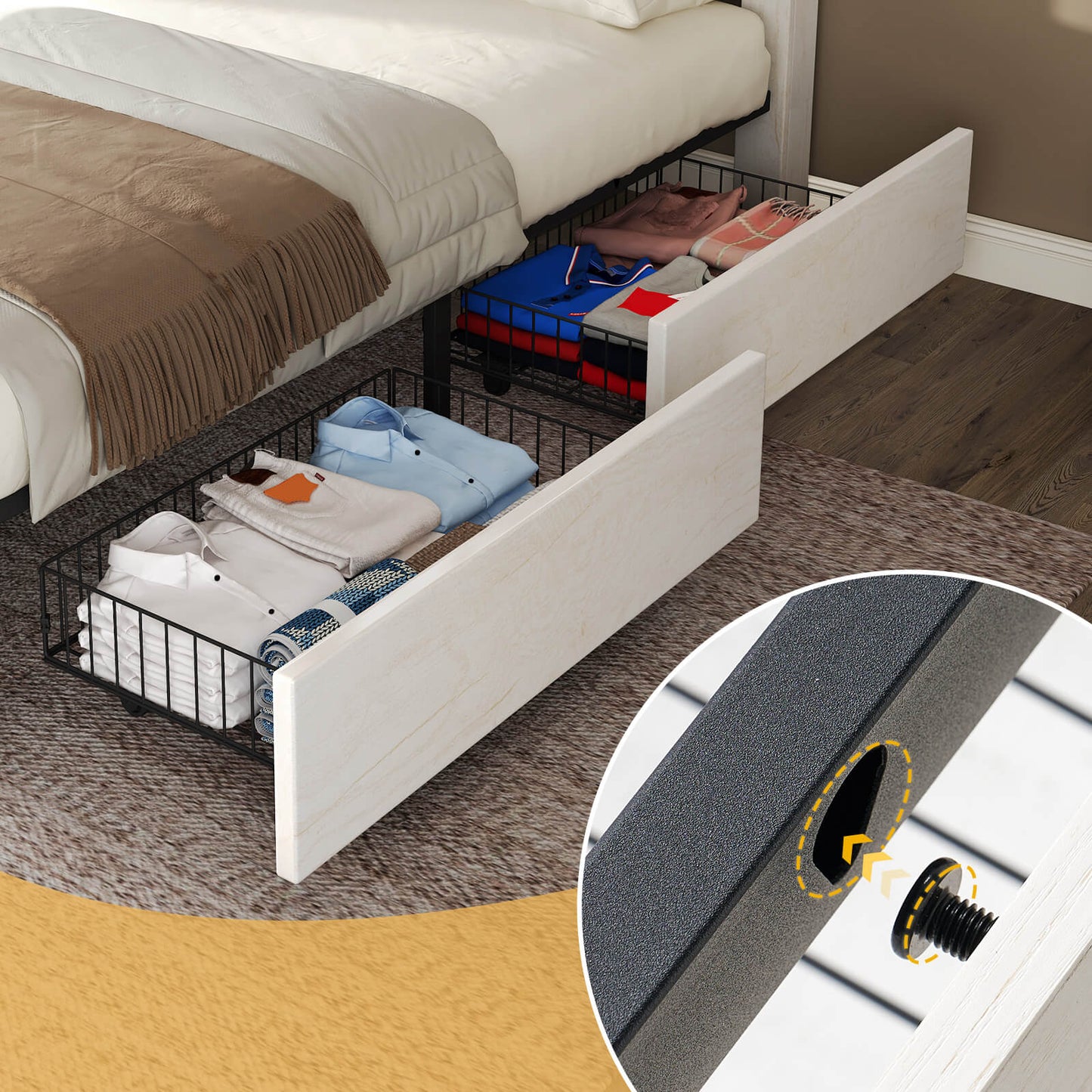 4 large lockable drawers offer ample storage for clothes, bedding, etc to make room clean and organized. Each drawer has 4 wheels for easy sliding.