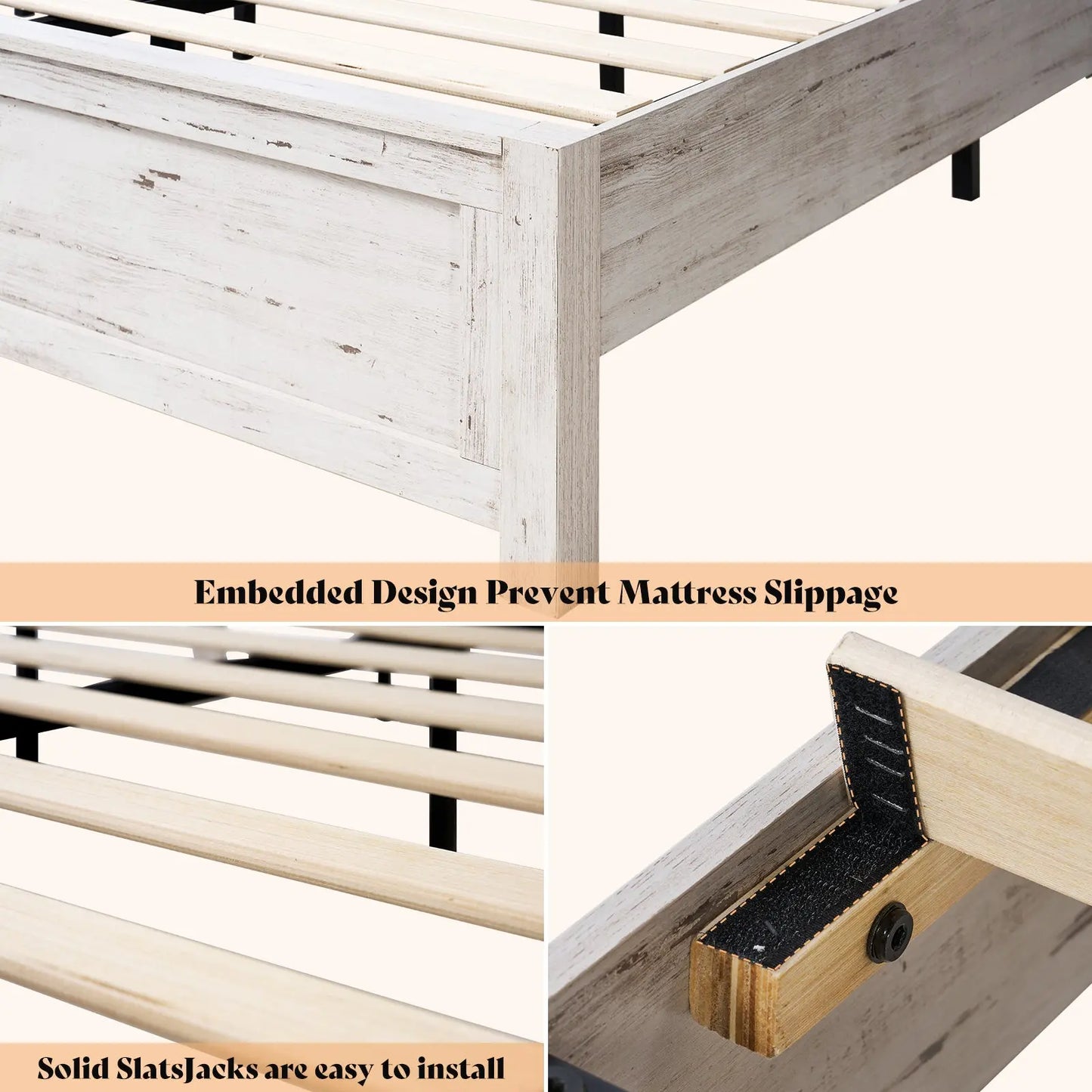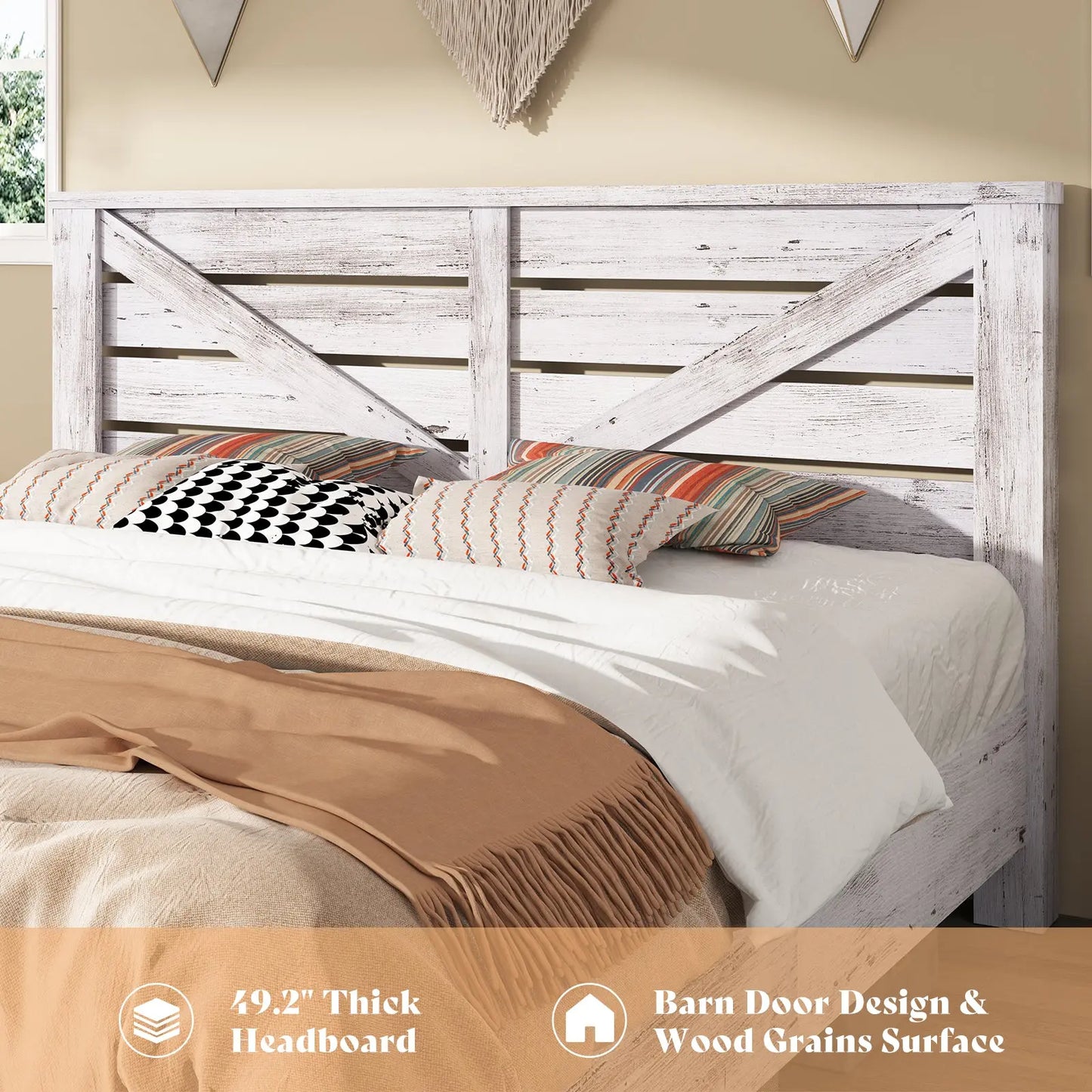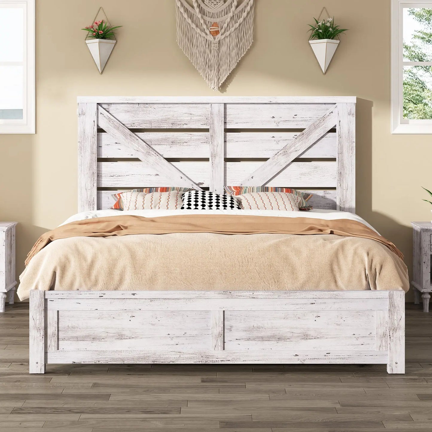 Introducing our Farmhouse & Classic bed frame, designed to bring timeless charm and functionality to your bedroom. Featuring a simple yet elegant barn door headboard and footboard, the exquisite wood grain surface adds a touch of rustic allure, making it a perfect match for any decor. Built to last, this bed frame offers ample under-bed storage space, ideal for storing items or accommodating a robot vacuum cleaner. The 49.2" high headboard supports 9-16" mattresses, catering to diverse needs. Its sturdy construction, with robust bed legs and a central metal frame, ensures superior stability and a safe sleeping environment. Enjoy a noise-free sleep with the silent cotton padding, ensuring you wake up refreshed and rejuvenated. Assembly is hassle-free with a convenient template strip and detailed instructions, including all necessary parts and accessories for a seamless setup.