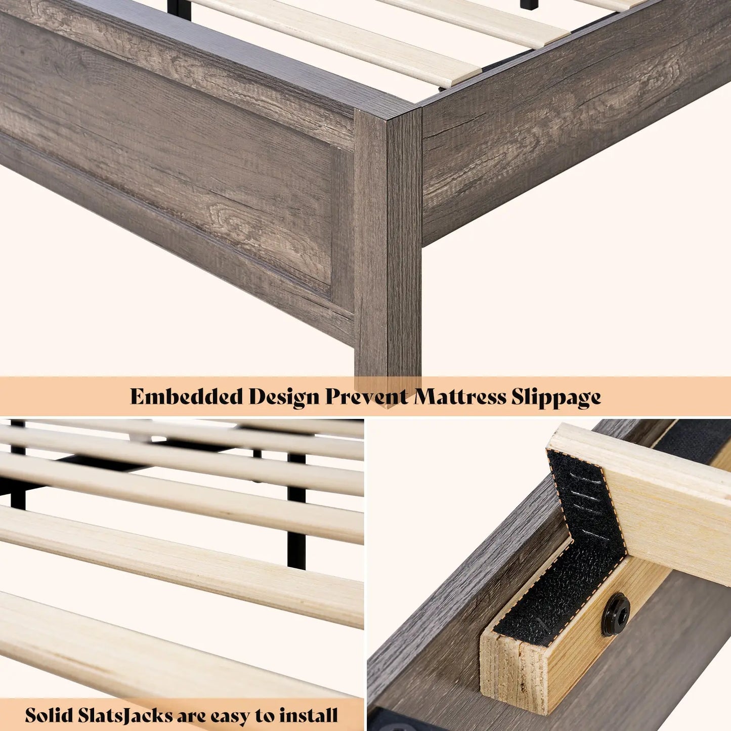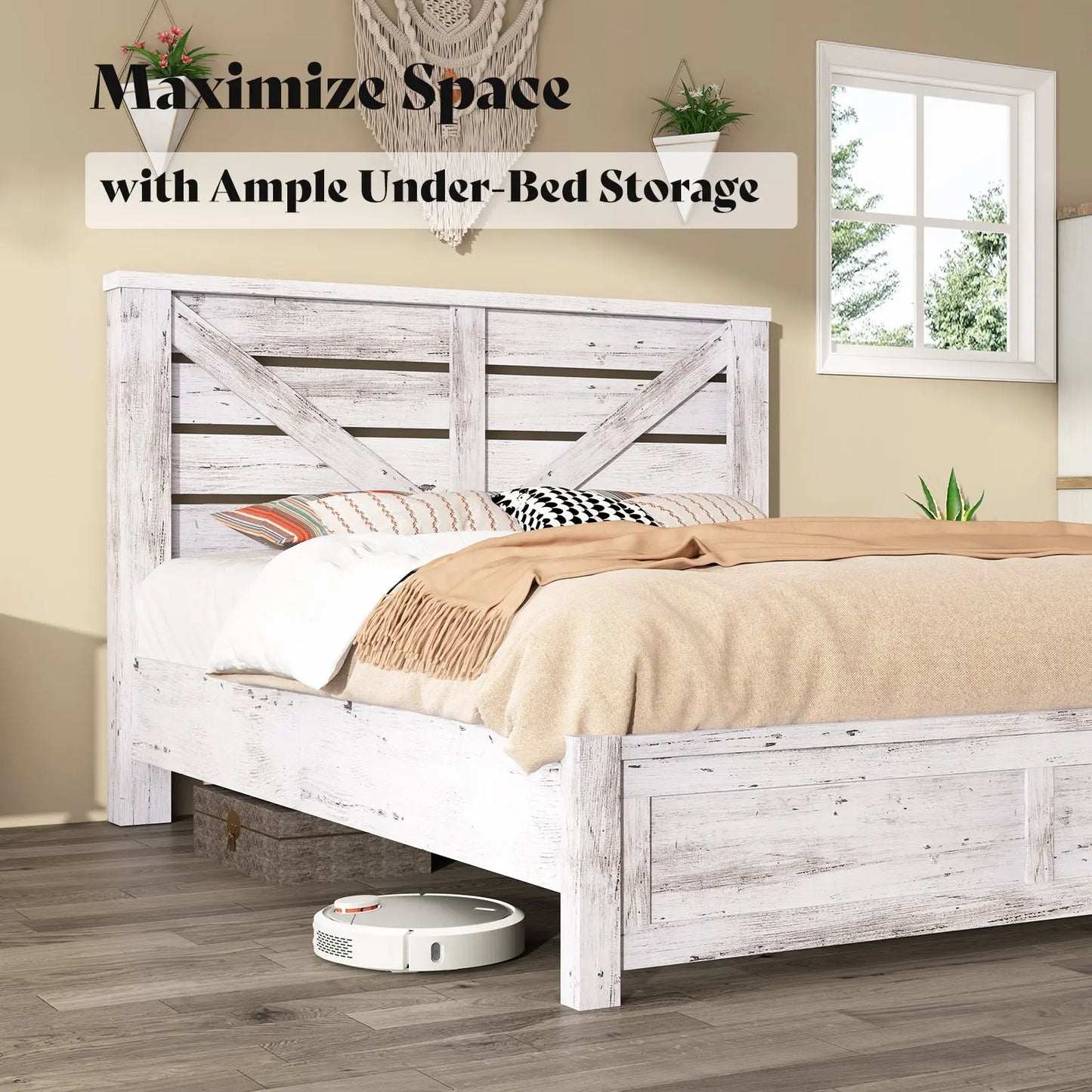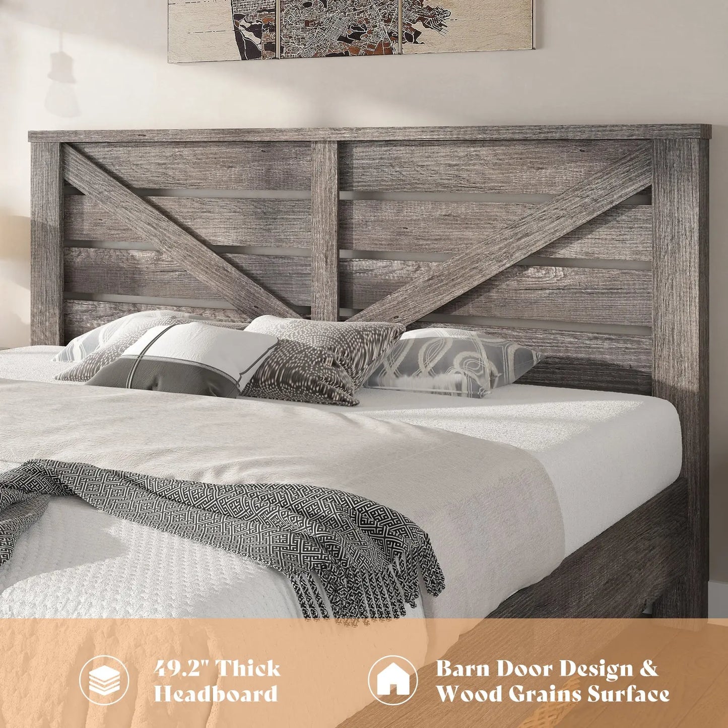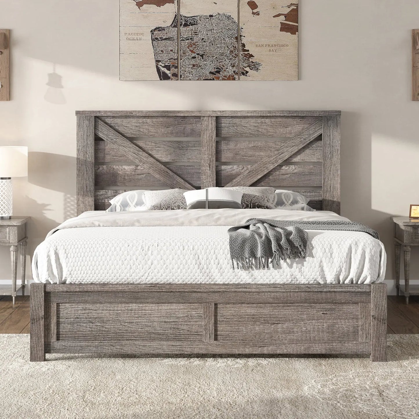 Introducing our Farmhouse & Classic bed frame, designed to bring timeless charm and functionality to your bedroom. Featuring a simple yet elegant barn door headboard and footboard, the exquisite wood grain surface adds a touch of rustic allure, making it a perfect match for any decor. Built to last, this bed frame offers ample under-bed storage space, ideal for storing items or accommodating a robot vacuum cleaner. The 49.2" high headboard supports 9-16" mattresses, catering to diverse needs. Its sturdy construction, with robust bed legs and a central metal frame, ensures superior stability and a safe sleeping environment. Enjoy a noise-free sleep with the silent cotton padding, ensuring you wake up refreshed and rejuvenated. Assembly is hassle-free with a convenient template strip and detailed instructions, including all necessary parts and accessories for a seamless setup.