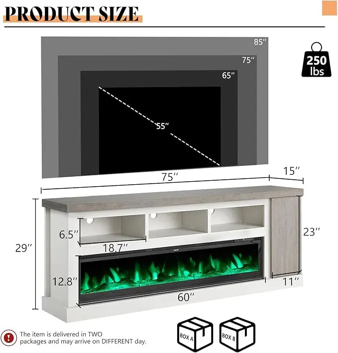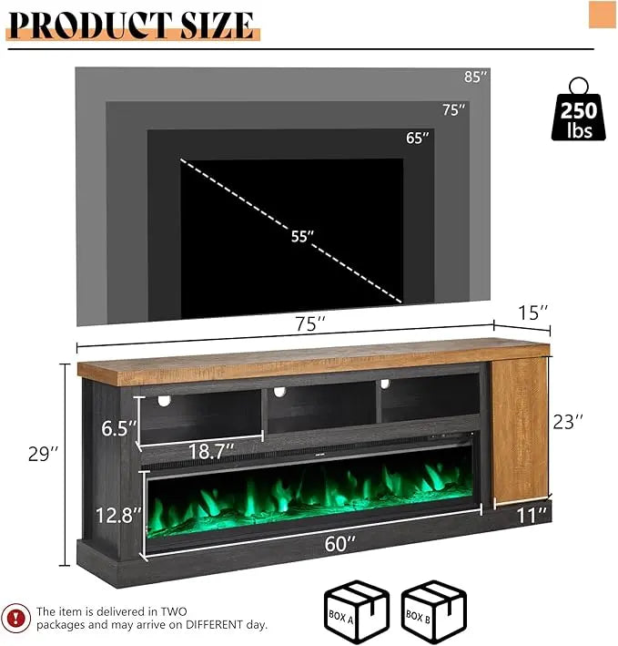 General Dimensions Fireplace Size: 60"W x 5.5" D x 12.8"H, TV Cabinet Size: 75"W x 15.3"D x 29" H