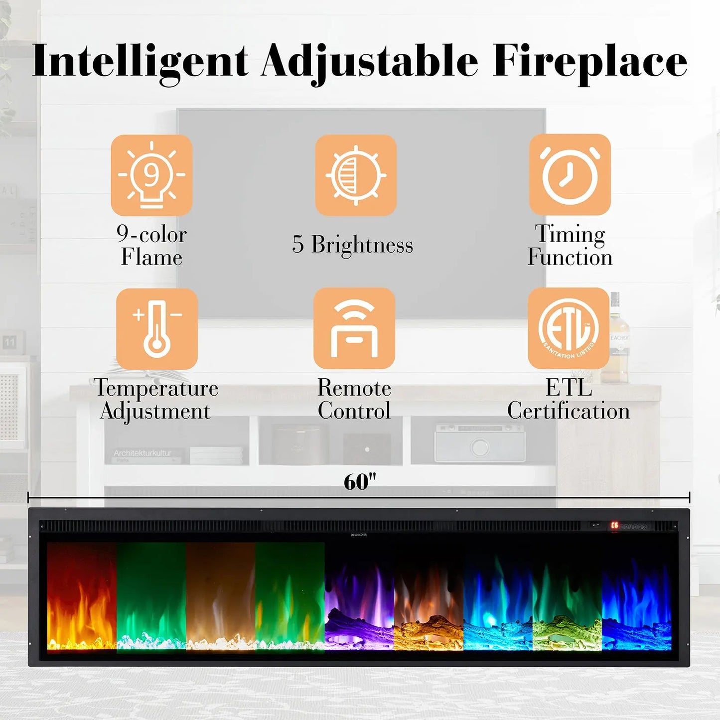 60" electric fireplace adds both warmth and ambiance with 9 flame color options and interchangeable crystal and log decorations. Whether used with or without heat, this fireplace brings customizable comfort and style.