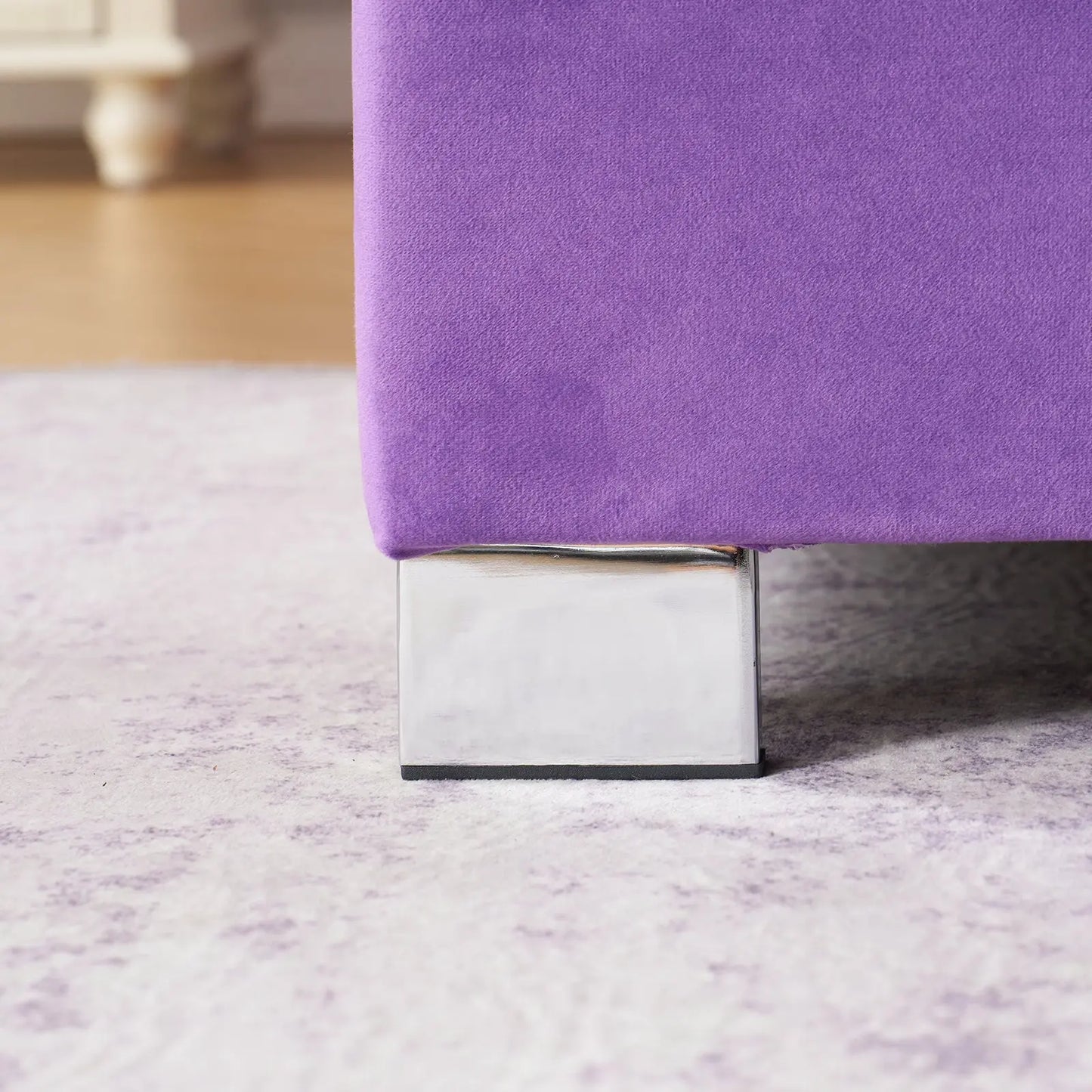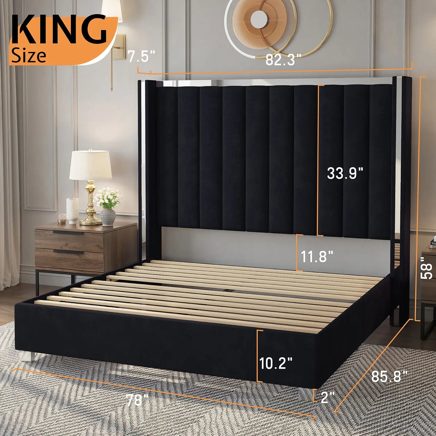 Soft velvet upholstered bed with Channel Tufted Wingback Headboard, stylish galvanized strip trim and wingback design make it a standout piece.