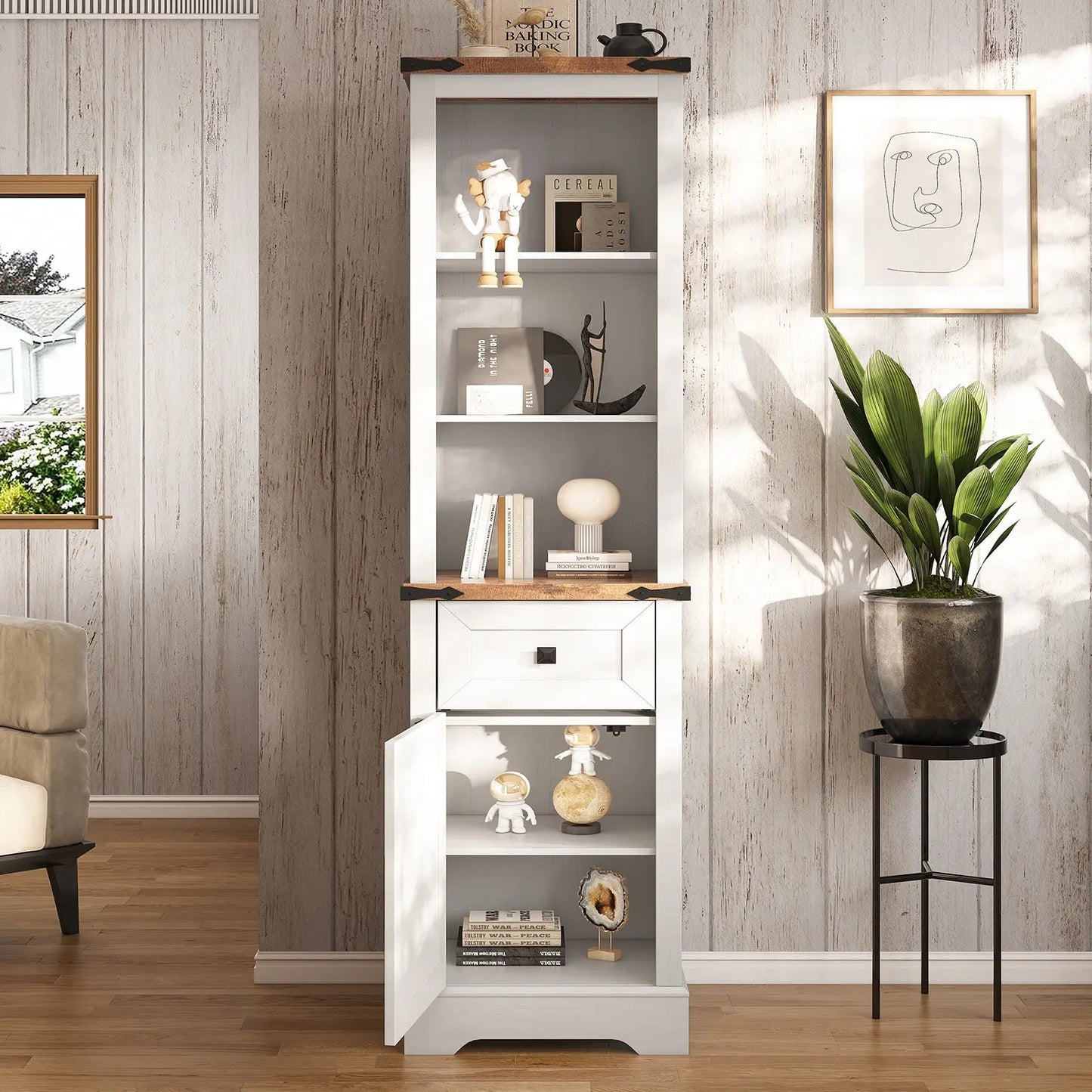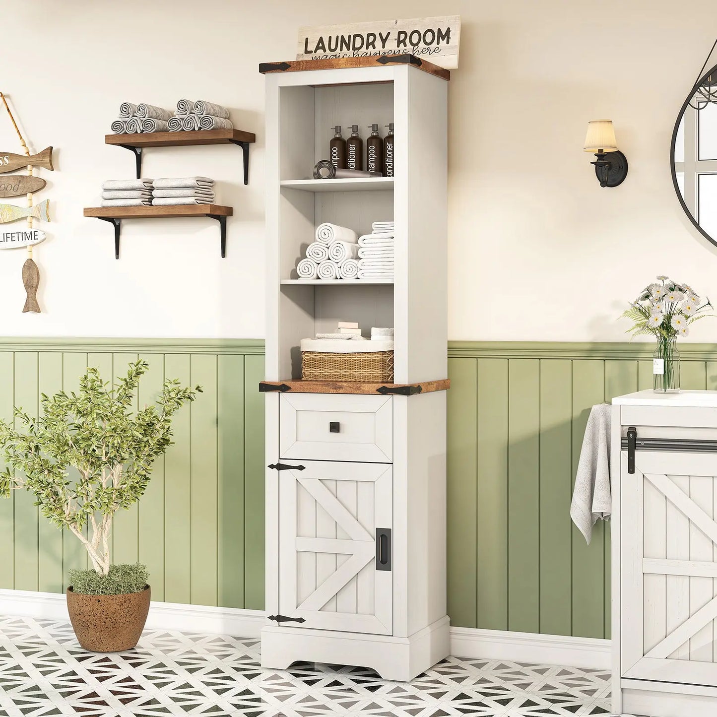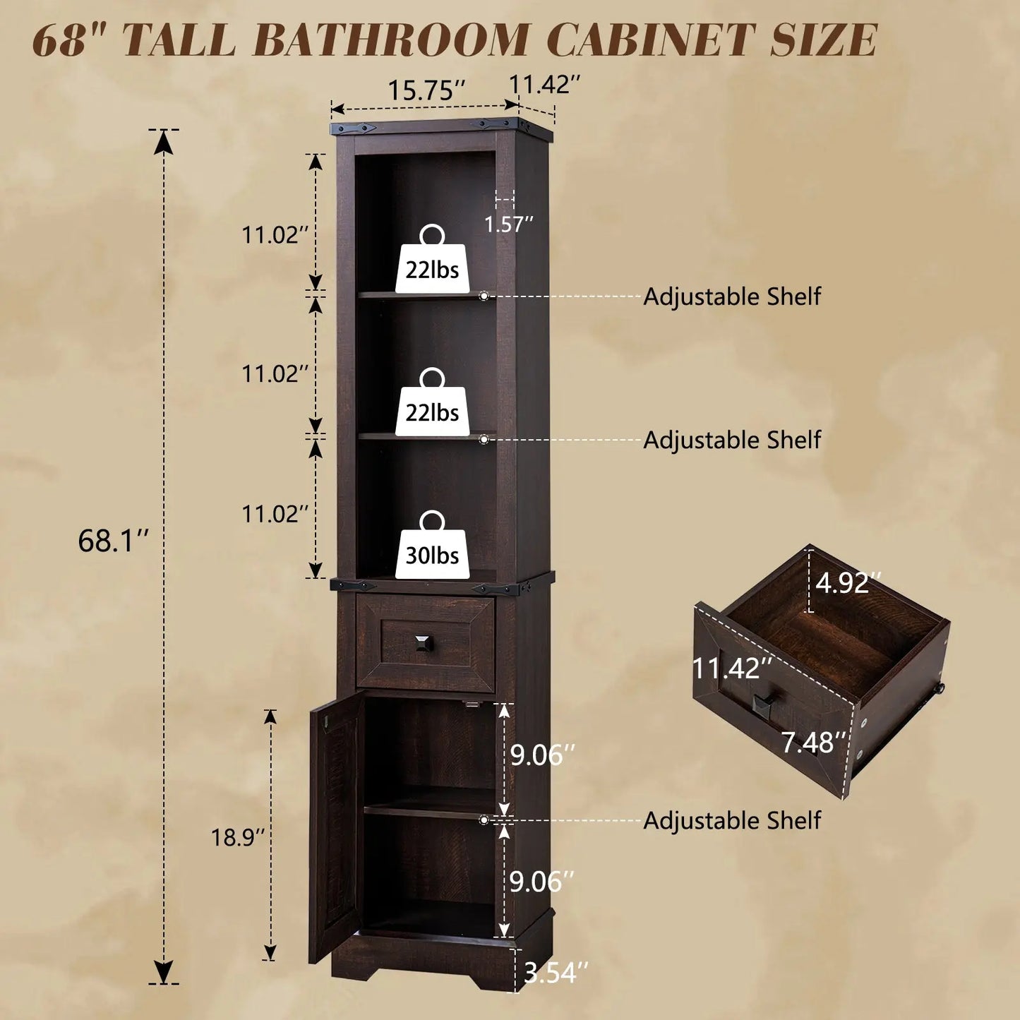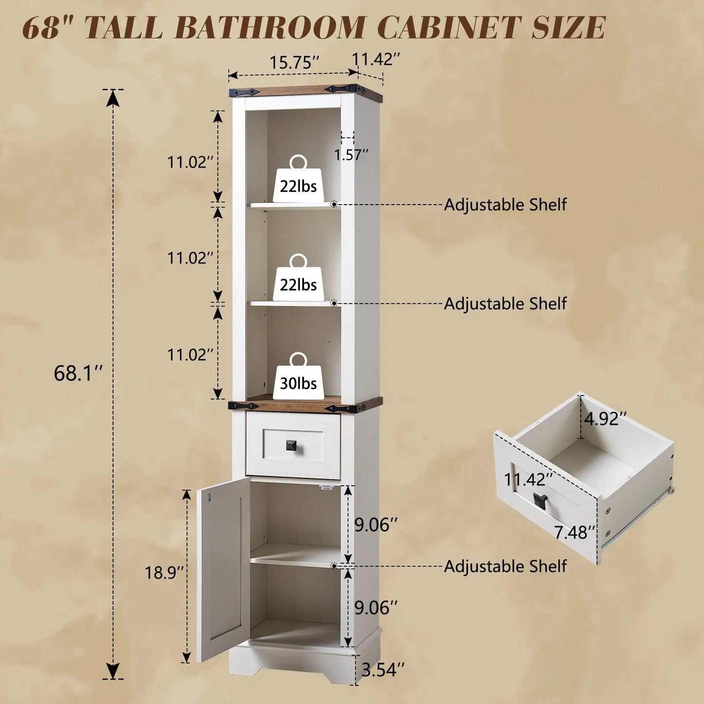 68" Tall storage cabinet has 3 open shelves for grabbing towels or toilet paper, drawer and cabinet with door for personal items. All shelves can be adjusted for different height items.