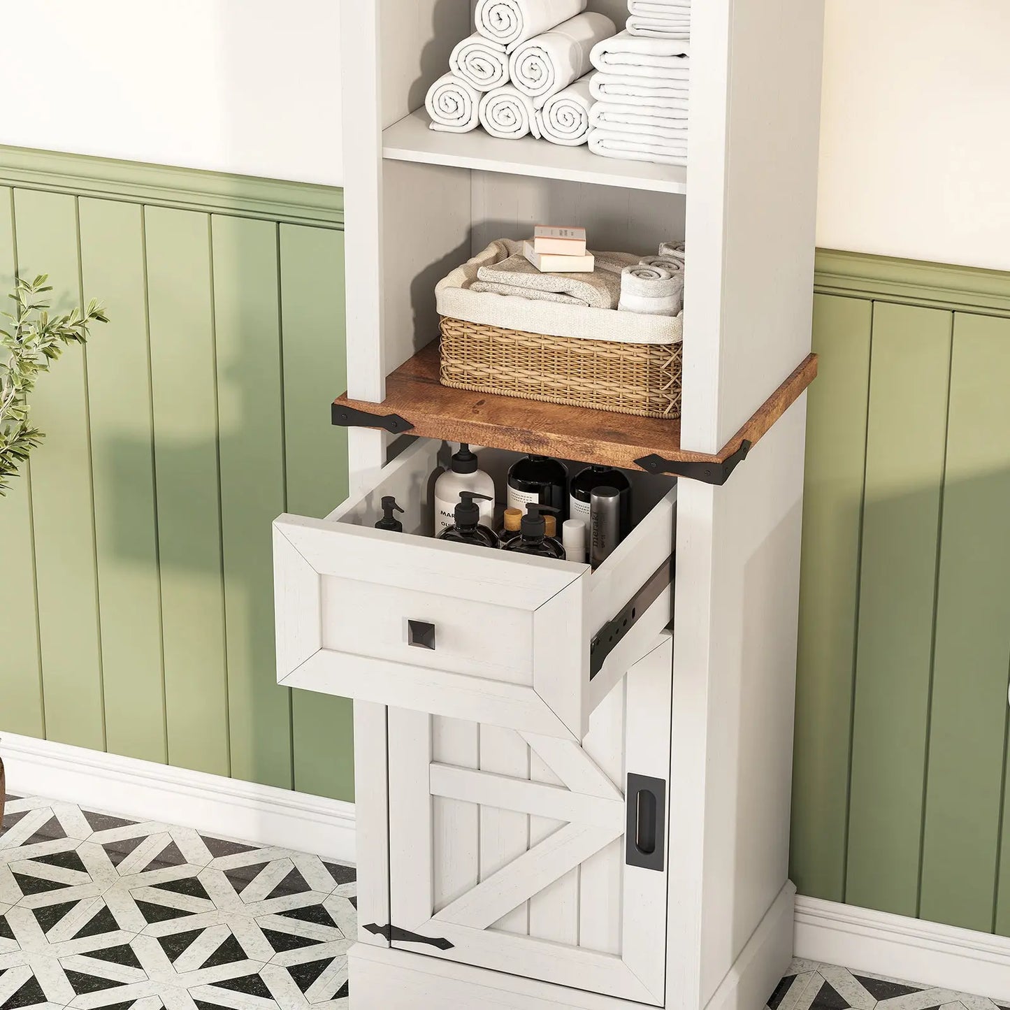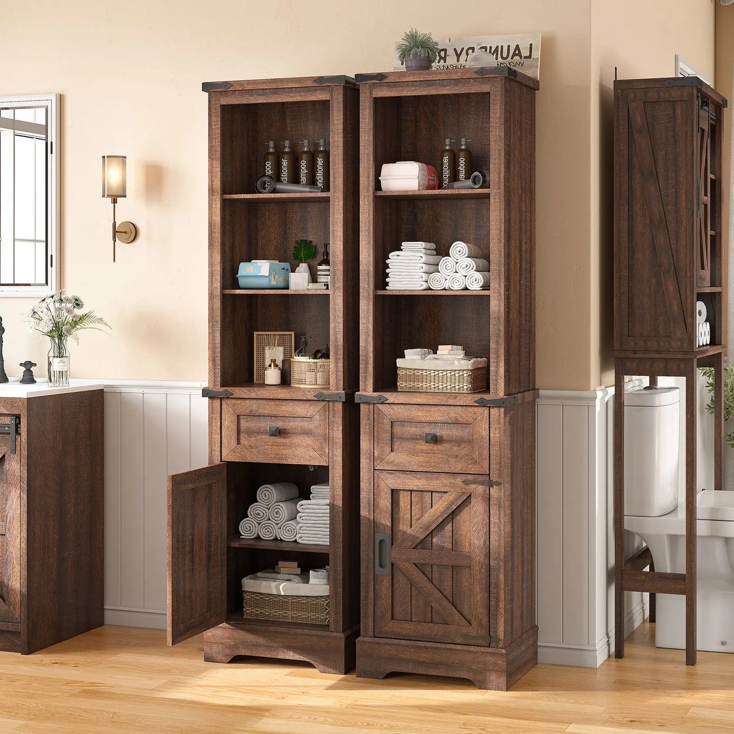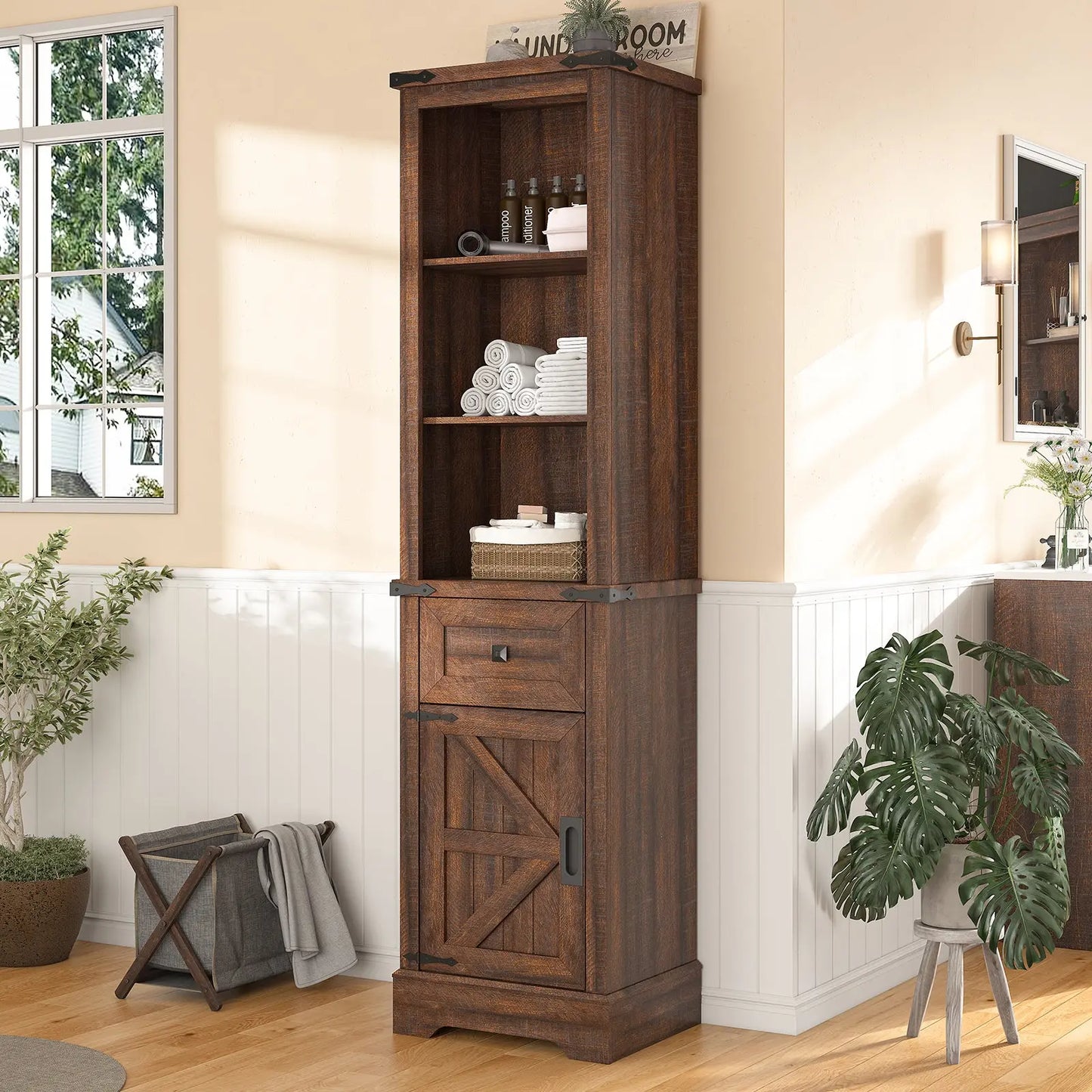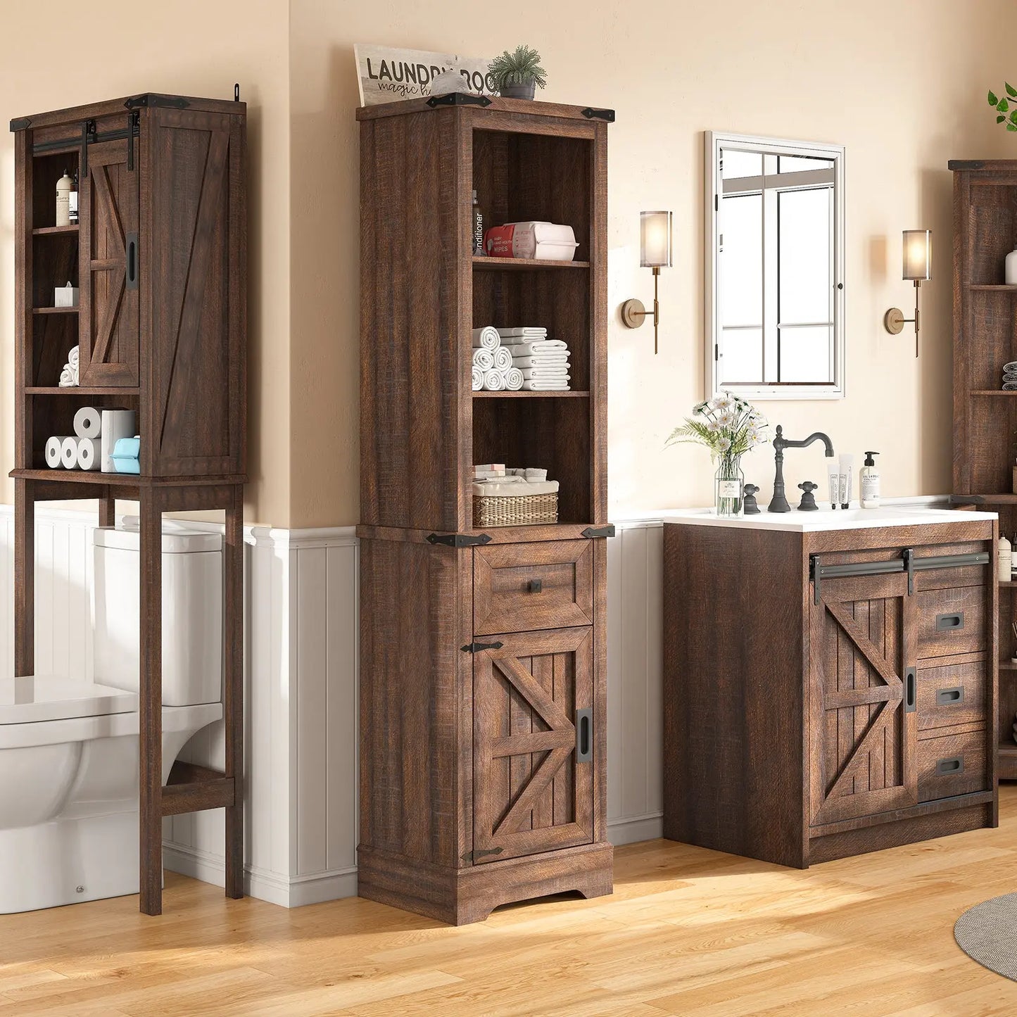 Bourbon tall bathroom storage cabinet has unique barn door, combining modern and rustic elements for an elegant look for ideal use next to toilet and bathtub, complements any furniture decor.