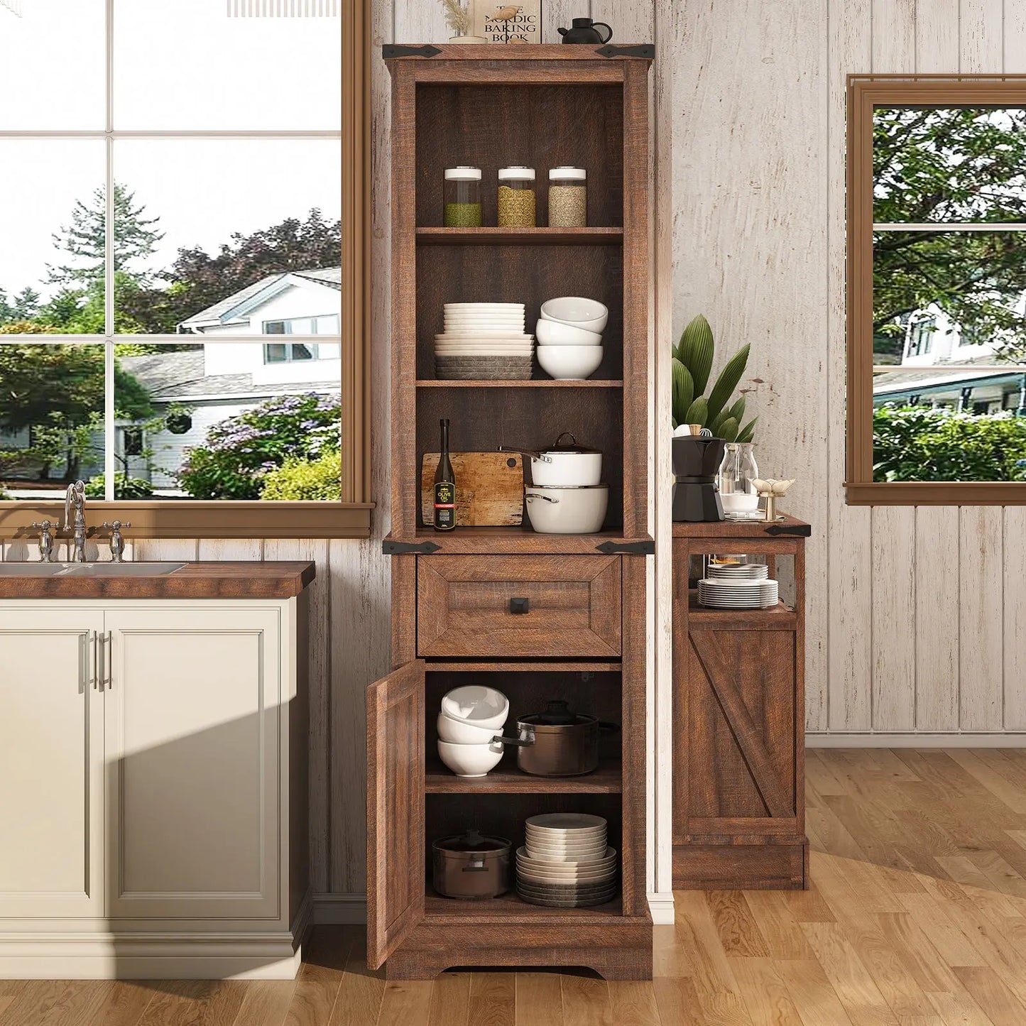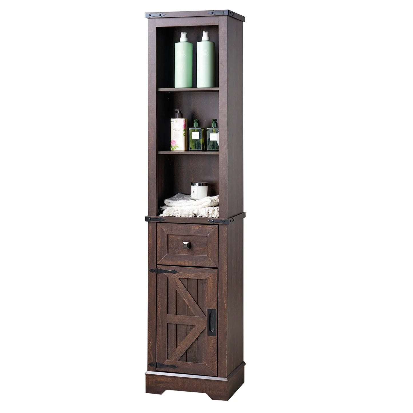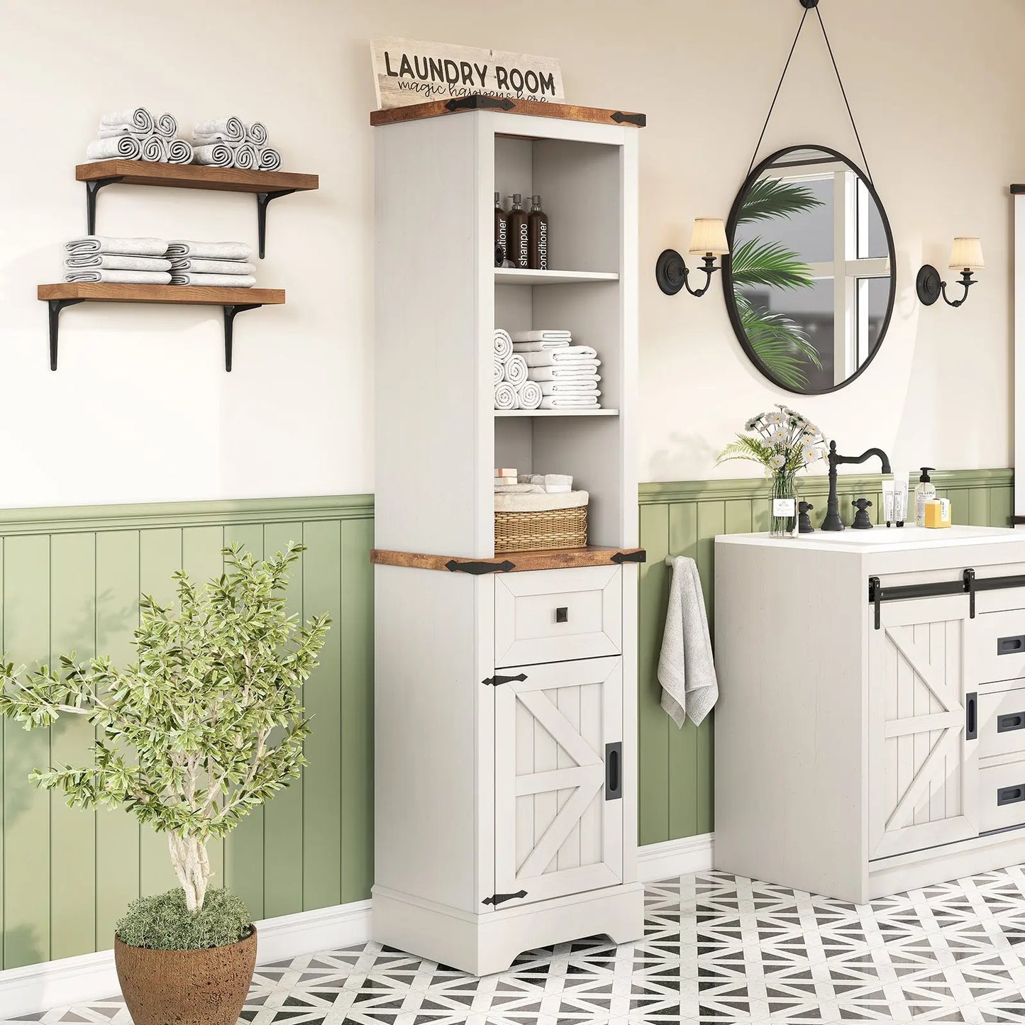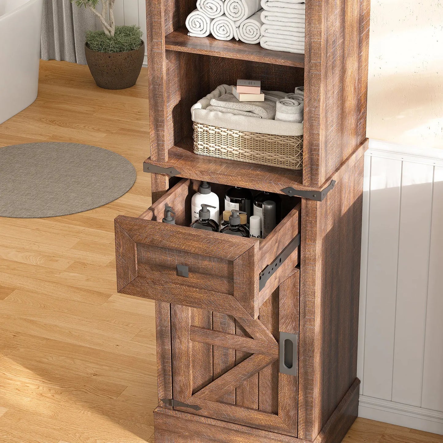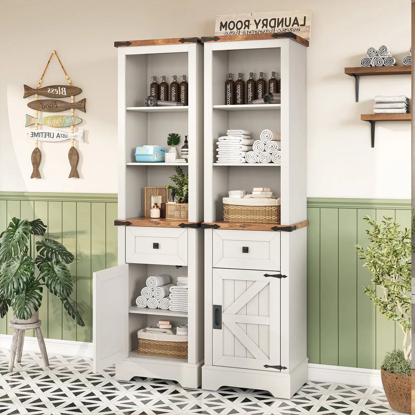 Bourbon tall bathroom storage cabinet has unique barn door, combining modern and rustic elements for an elegant look for ideal use next to toilet and bathtub, complements any furniture decor.
