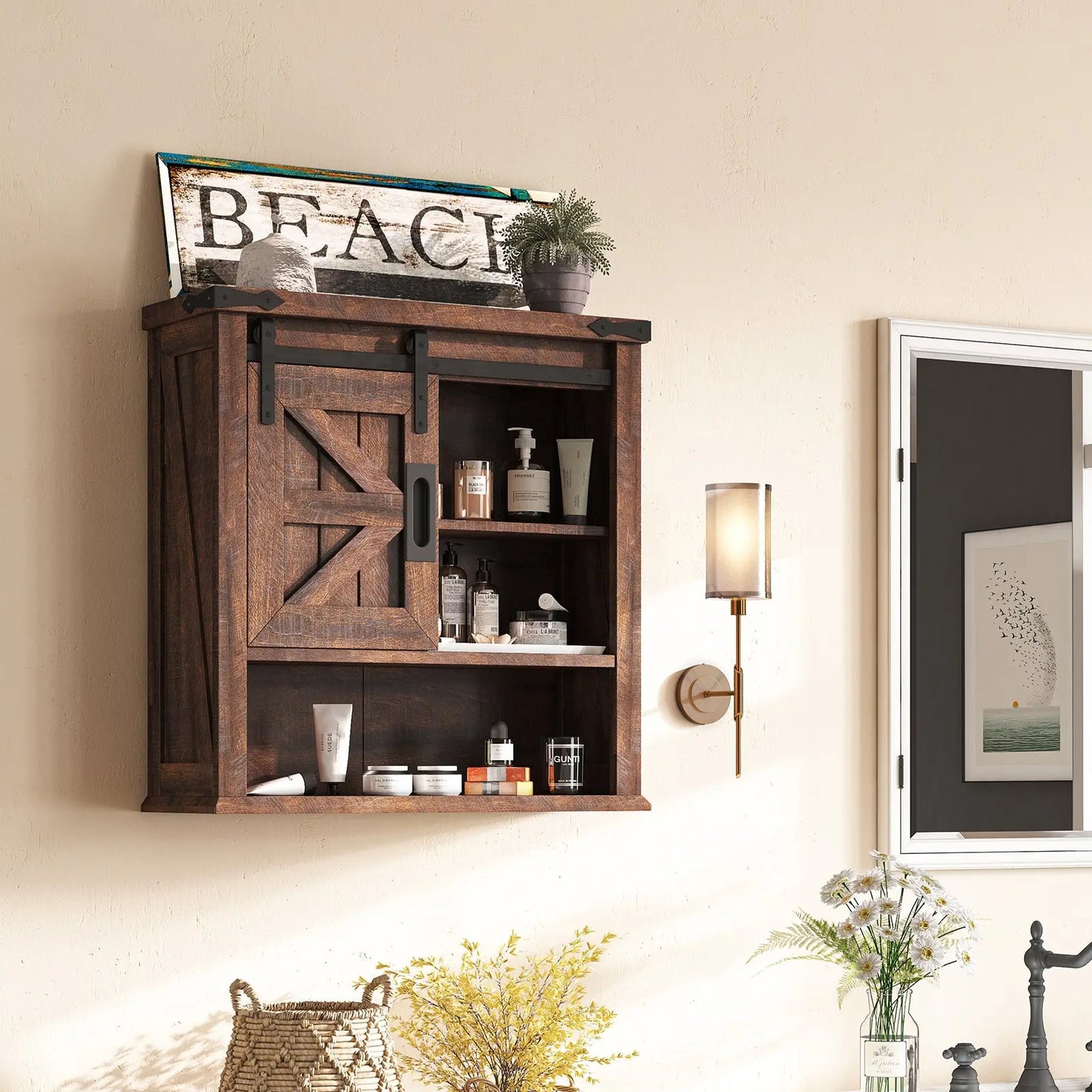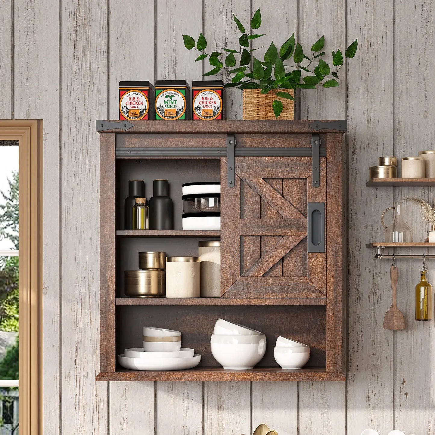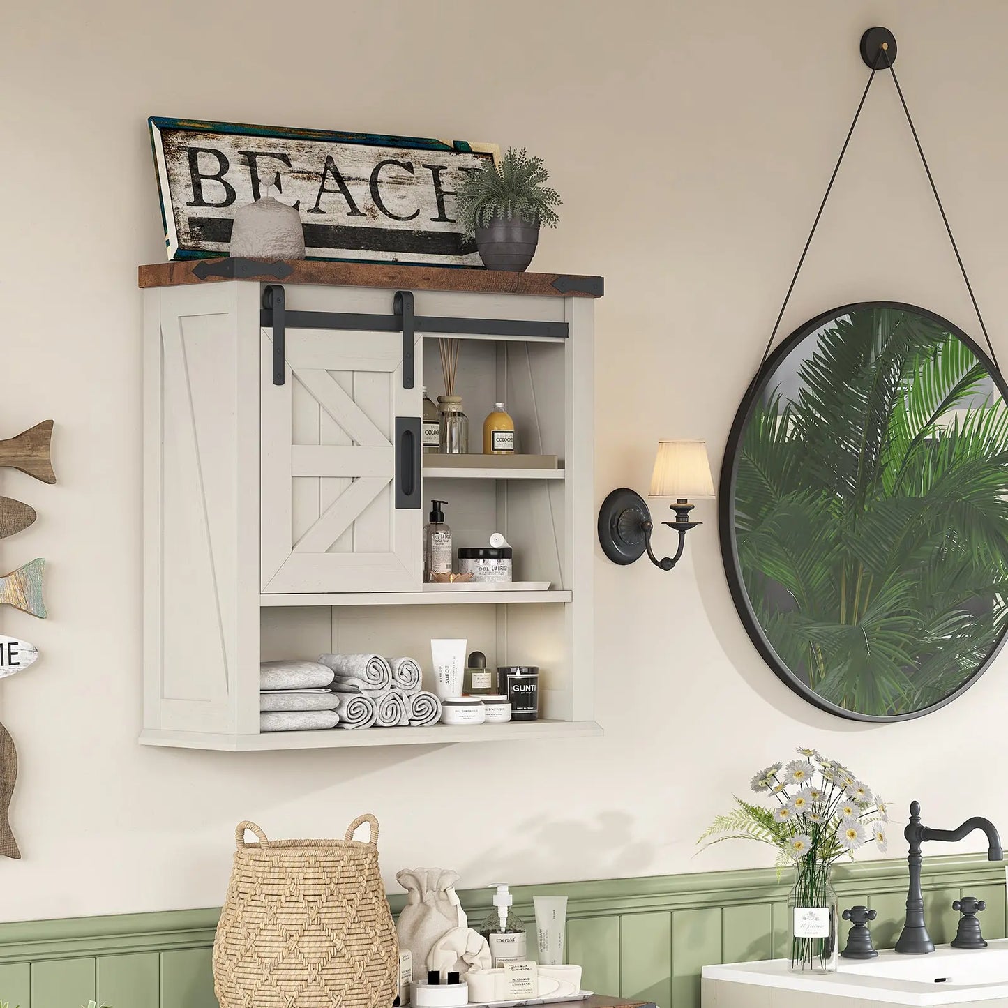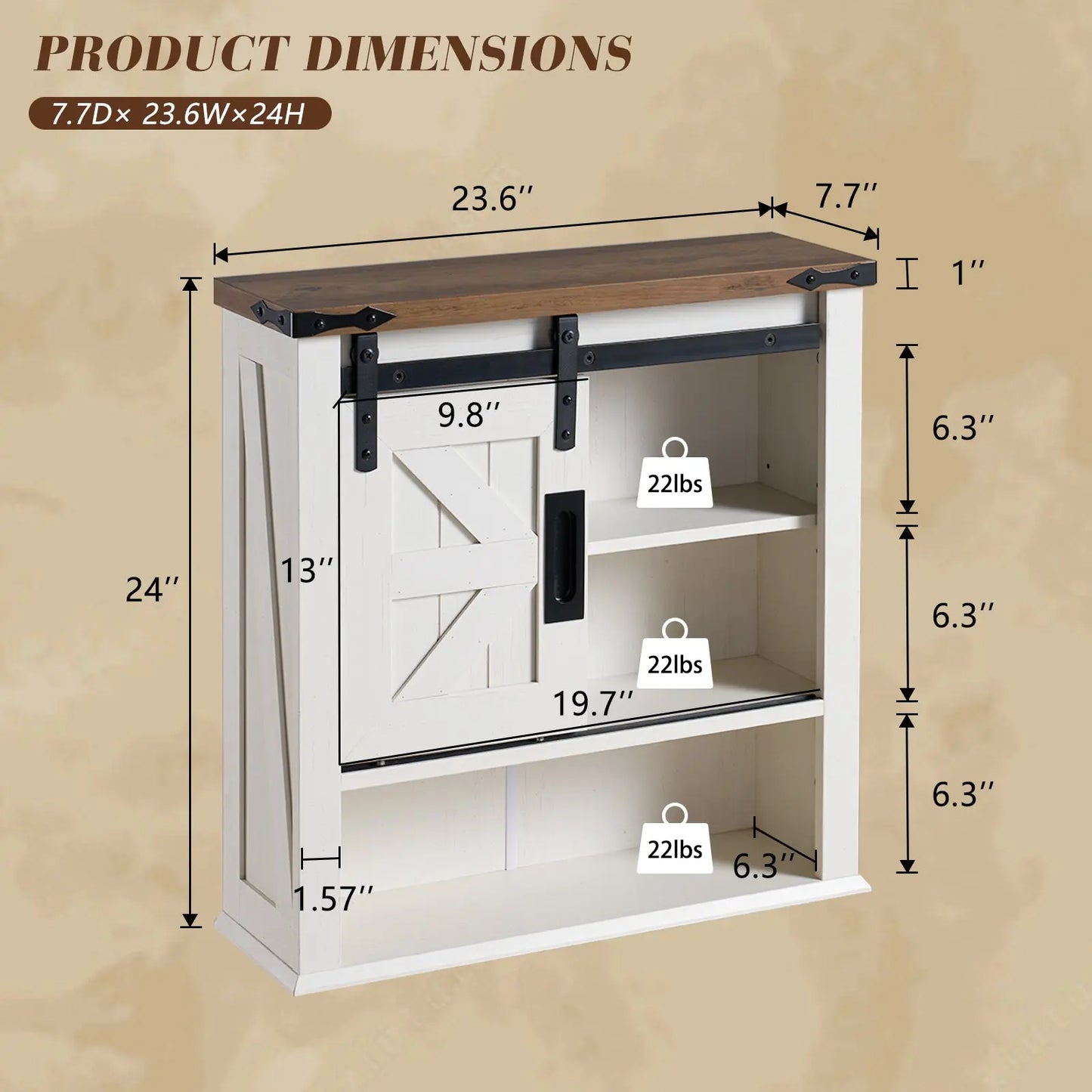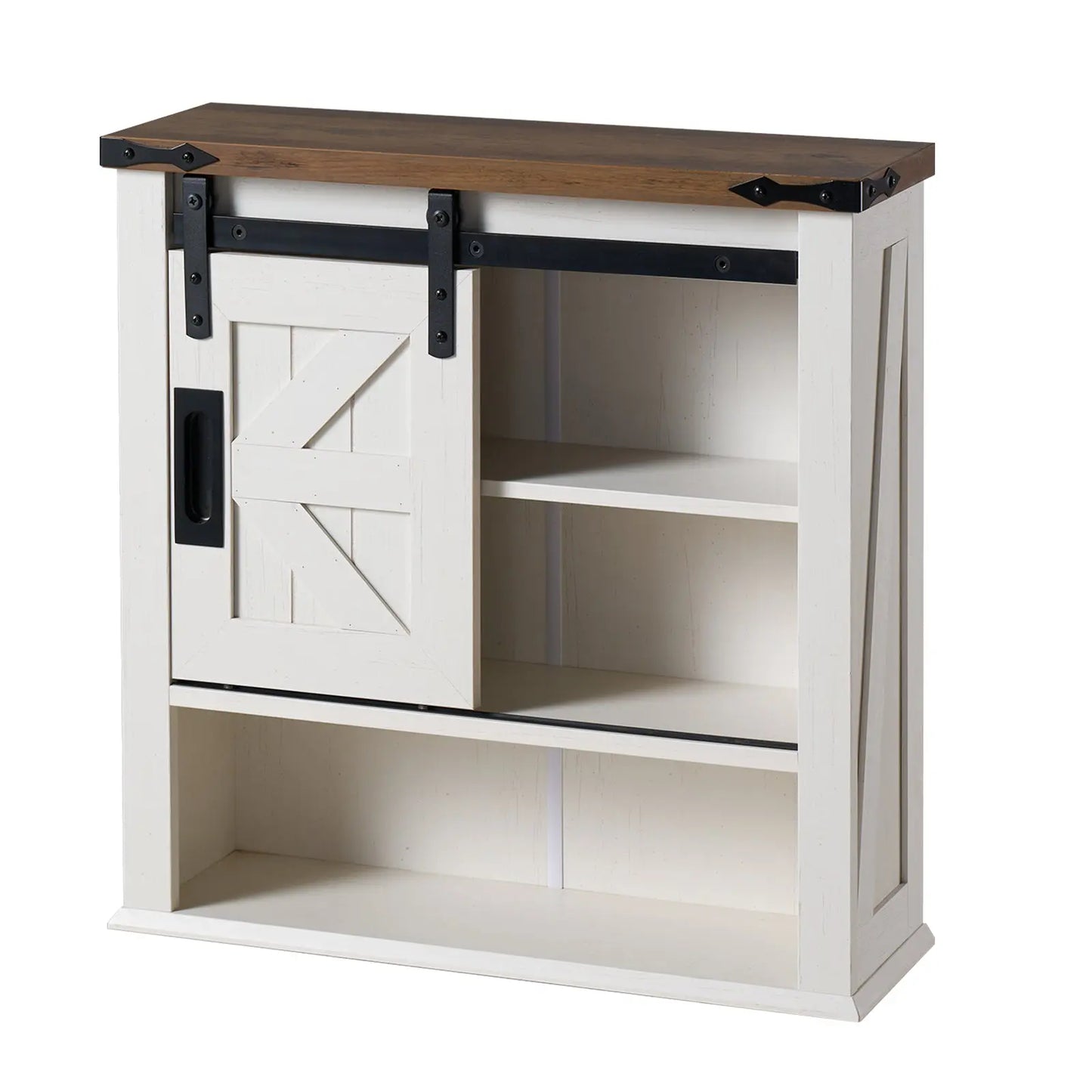 Bourbon wall-mounted storage cabinet featutes smooth sliding barn door offering useful storage, which is suitable for various scenes such as a bathroom, kitchen, living room, entryway, and laundry room.