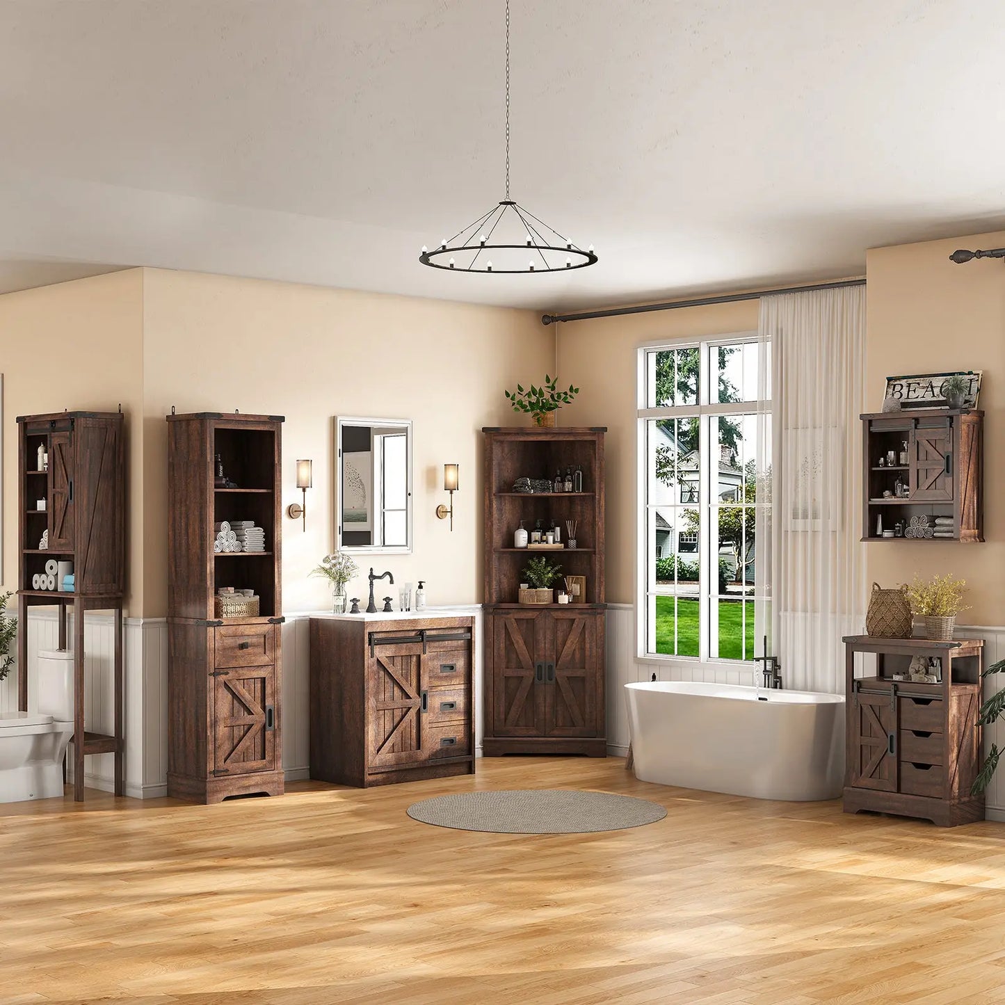 Barnyard-style sliding doors, smoothly glides from both left & right sides using steel sliding rail. Rustic wood grain finish adds a modern farmhouse style to your bathroom!