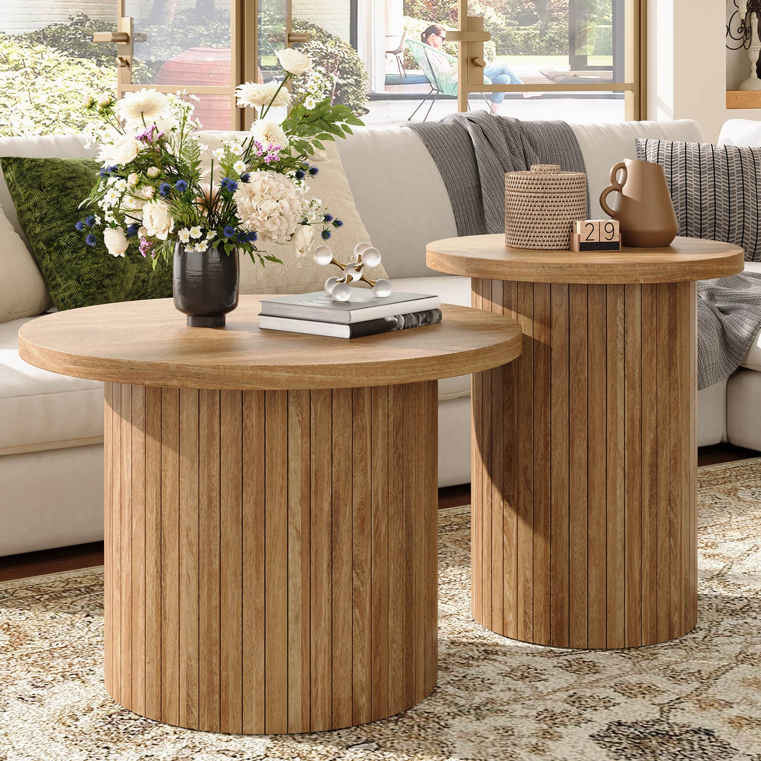 Add timeless style and modern versatility to your home with the Briar Mid-Century Coffee Table Set. Featuring two round nesting tables with elegant vertical slat details and a warm natural wood finish, this set brings a cozy yet refined feel to any space. The spacious 23.6" and 16.5" tabletops offer ample room for drinks, books, or d¨¦cor, while the flexible nesting design allows for compact storage or expanded surface area. Perfect for living rooms, bedrooms, or offices, the innovative magic-tape column design ensures easy, tool-free assembly in minutes.