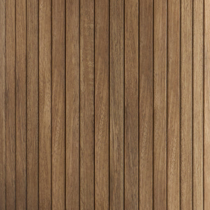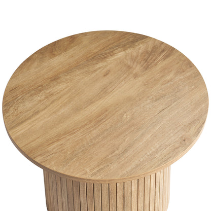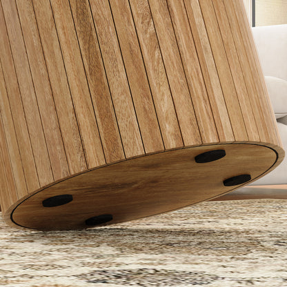 This round coffee table features a sleek mid-century modern style. Vertical slats create a visually appealing texture, making it a perfect statement piece for any living room