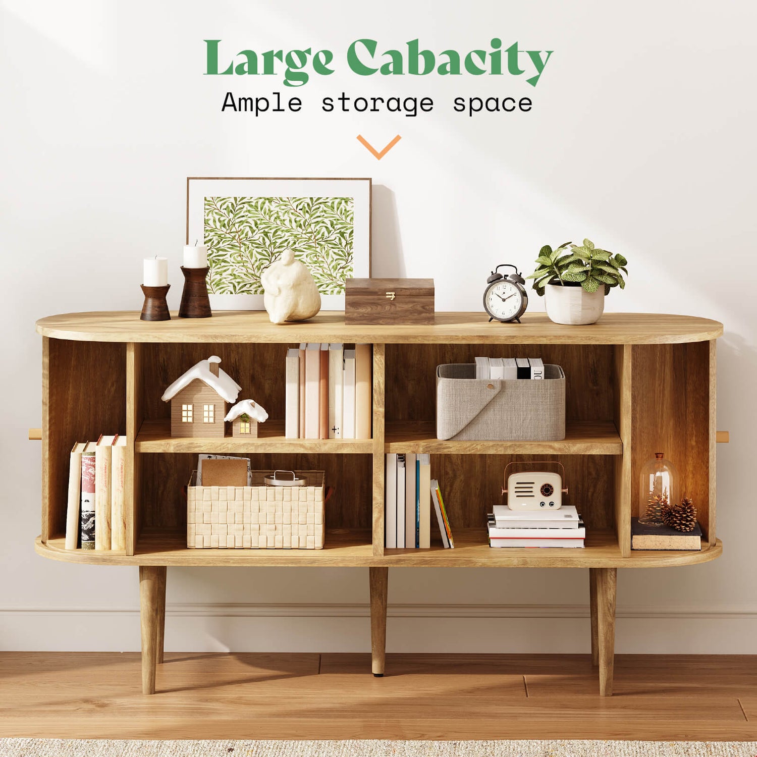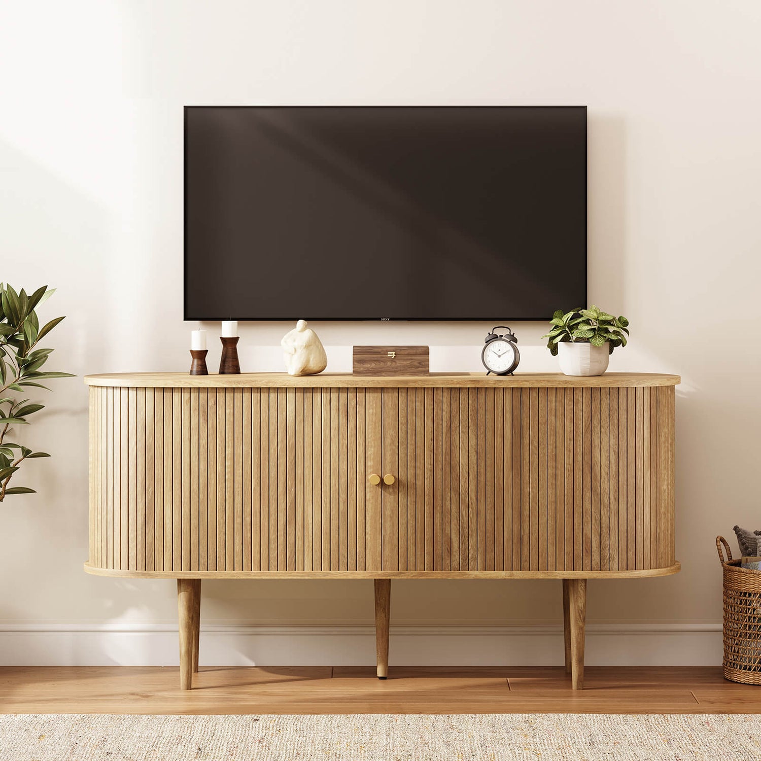Designed with a smooth oval shape and gracefully tapered wooden legs, this TV stand captures the essence of mid-century elegance, bringing a retro-inspired charm to your living space.