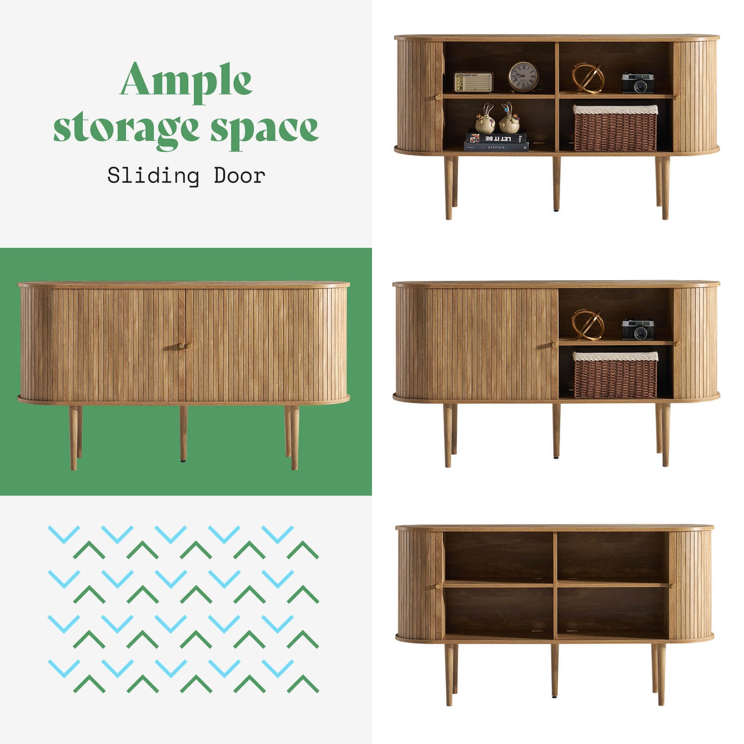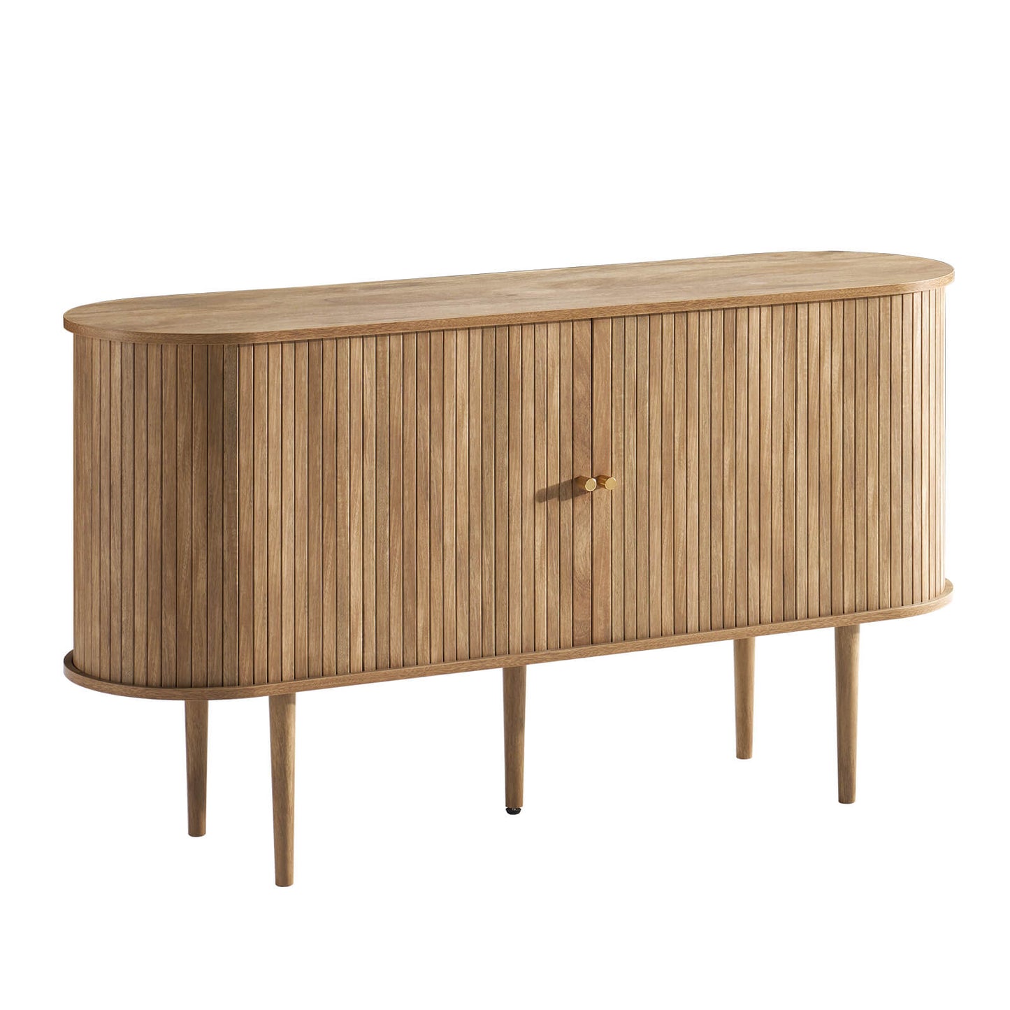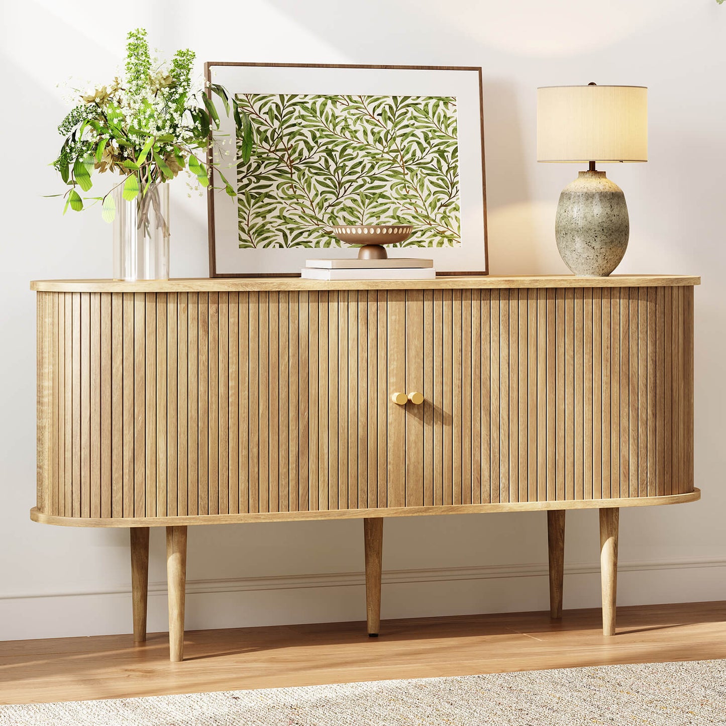 Bring timeless elegance to your home with the Briar Sideboard 55" Mid-Century. Featuring a smooth oval profile, solid wood tapered legs, and signature sliding tambour doors, this piece blends classic mid-century design with modern functionality. Multiple storage compartments offer ample room for media devices, books, and d¨¦cor, while the dust-proof sliding doors keep your space organized. Easy to assemble in just 20 minutes and equipped with an anti-tip device for added safety, it¡¯s perfect for your living room, office, or entryway.