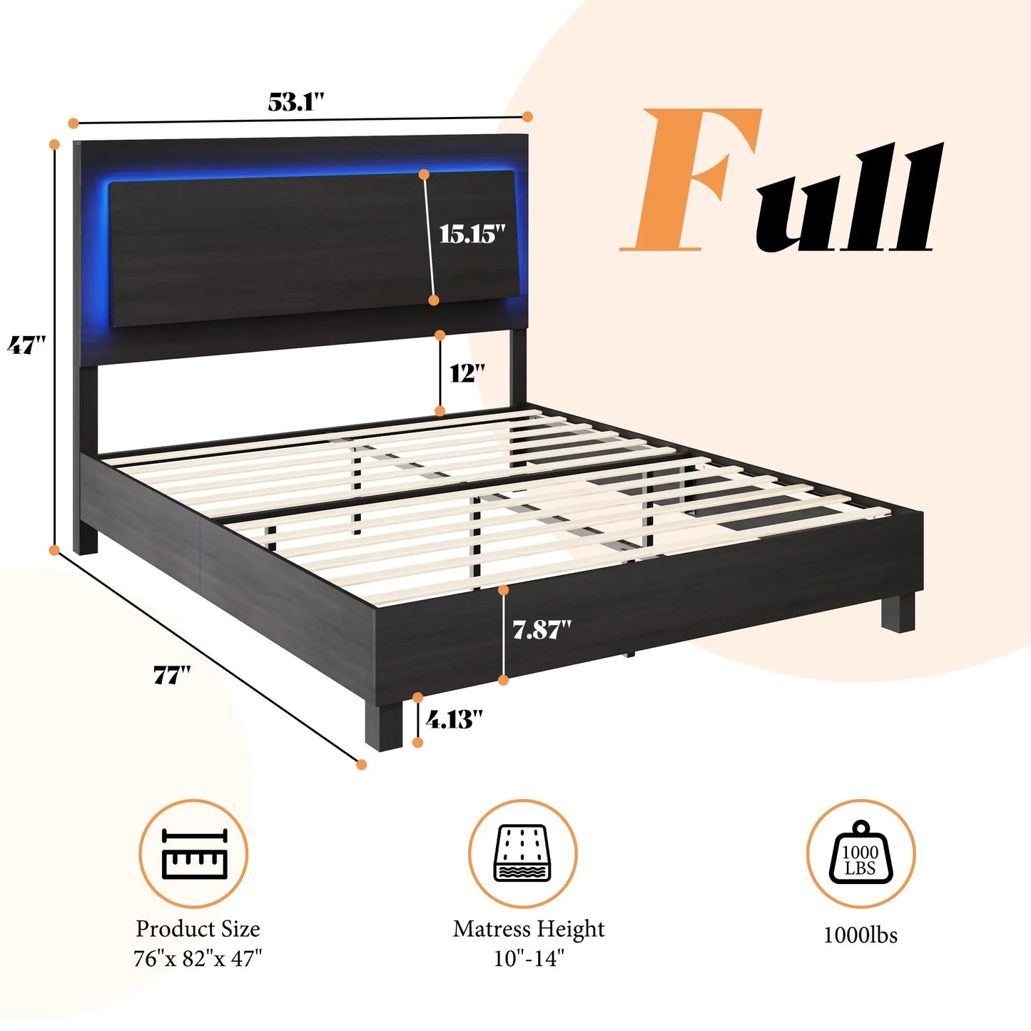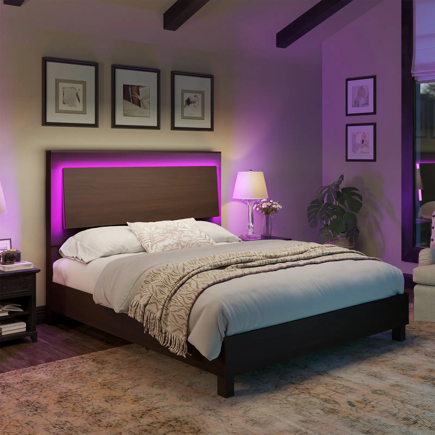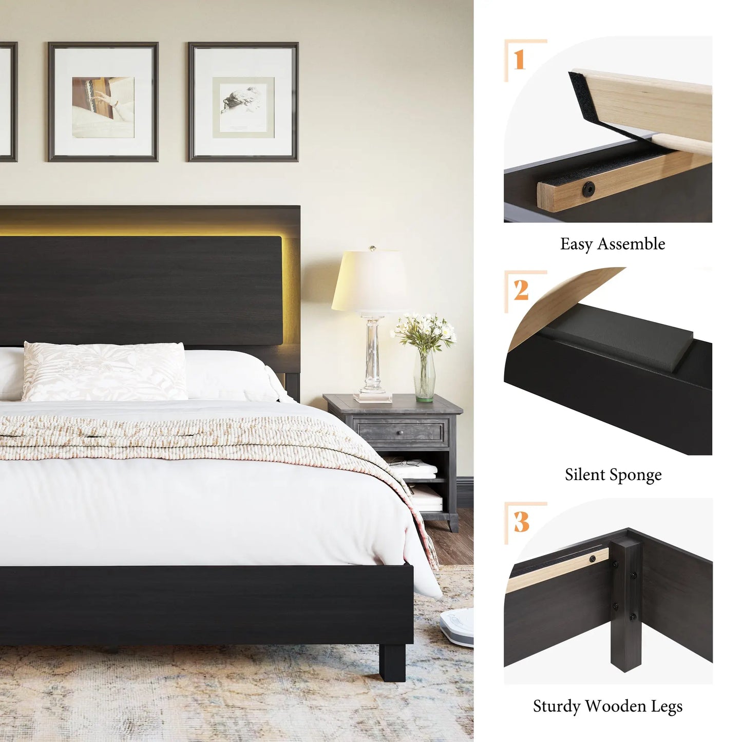 This Carson bed frame features a sophisticated wood grain design and an LED light headboard, enhancing the overall ambiance of any space. The unique headboard boasts a dual-layered construction with an 85° angled sloping block for optimal head support, ensuring comfort and relaxation. The LED lights can be effortlessly adjusted via remote or app, offering 21 dynamic modes and various static colors to match your mood. The solid structure of the platform bed frame, supported by a combination of wooden legs, iron legs, and wood slats, guarantees stability and a comfortable night's sleep. Additionally, all components are clearly identified for easy assembly, allowing two adults to complete the setup in about one hour.