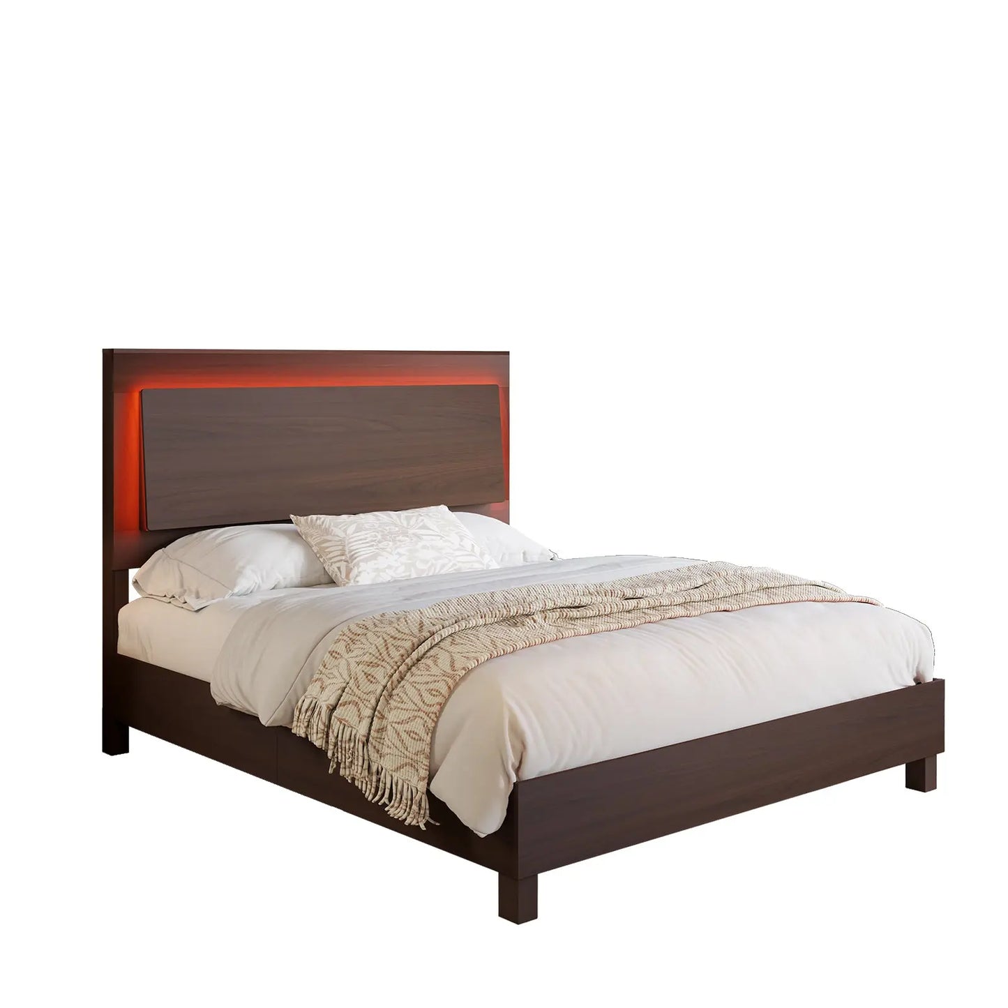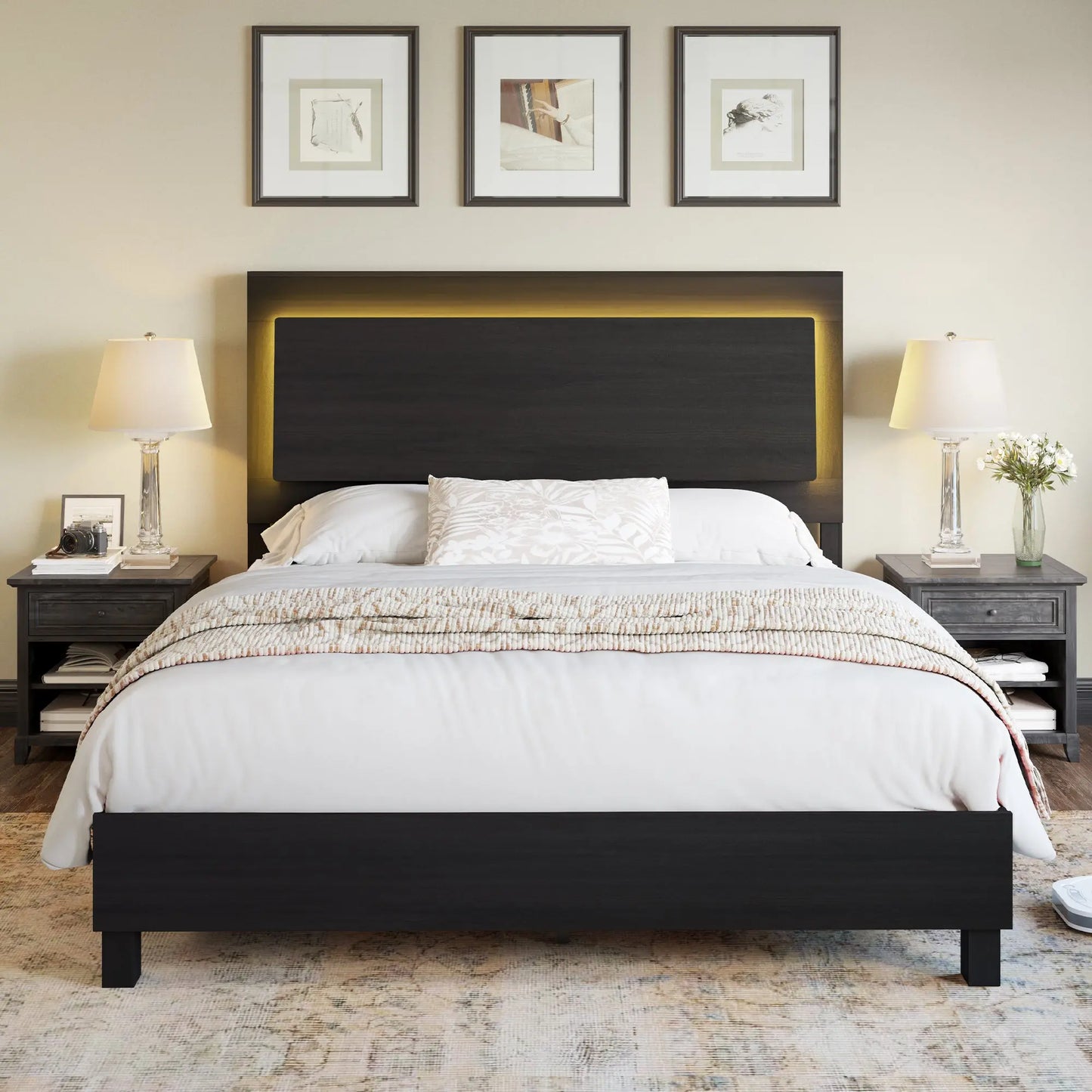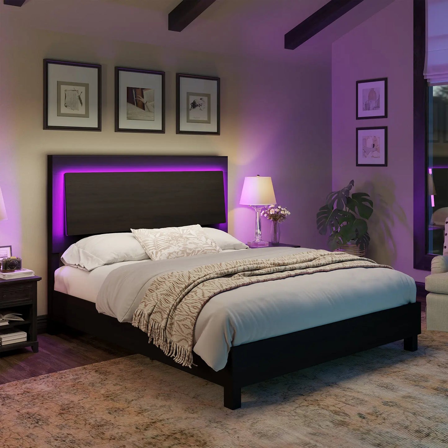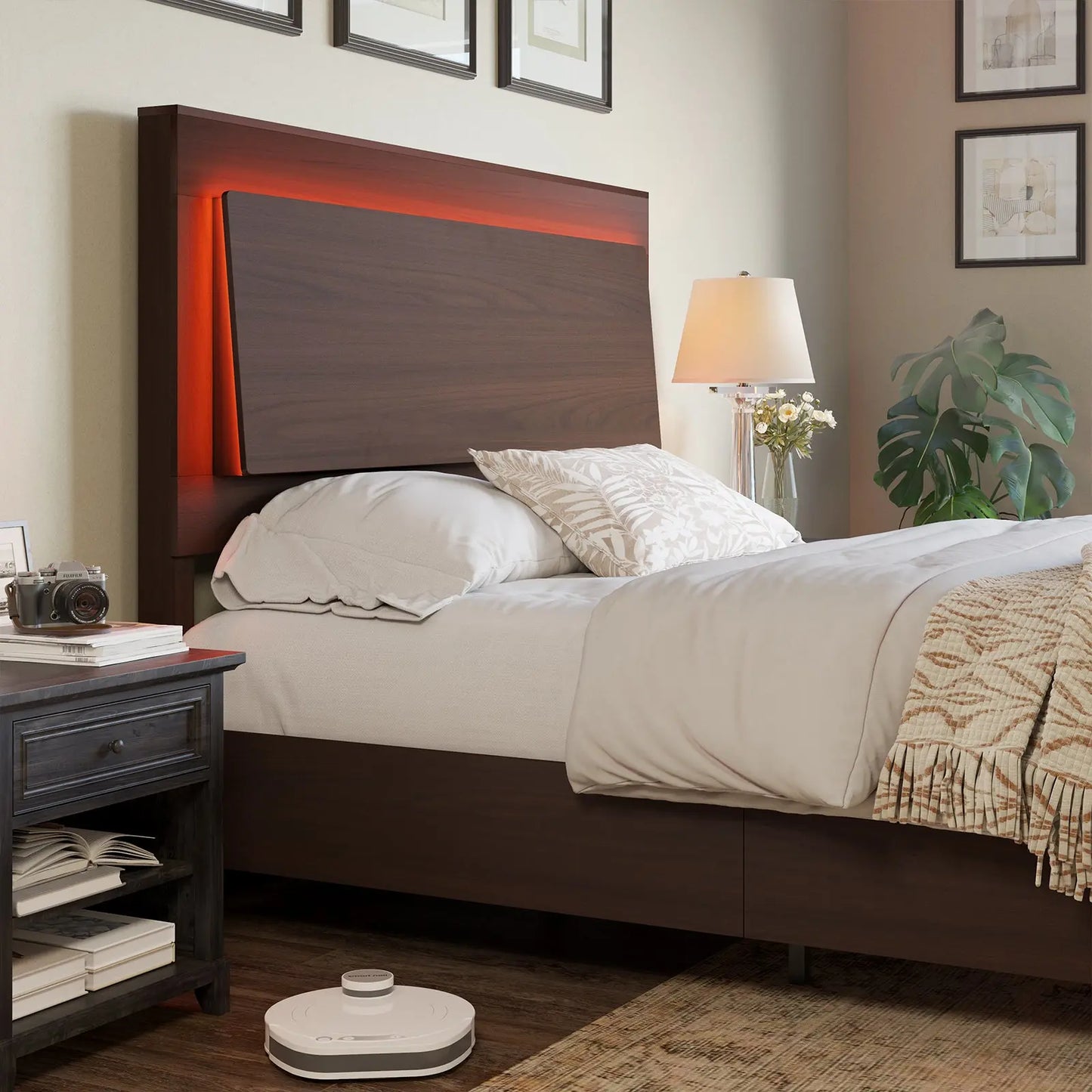 This Carson bed frame features a sophisticated wood grain design and an LED light headboard, enhancing the overall ambiance of any space. The unique headboard boasts a dual-layered construction with an 85° angled sloping block for optimal head support, ensuring comfort and relaxation. The LED lights can be effortlessly adjusted via remote or app, offering 21 dynamic modes and various static colors to match your mood. The solid structure of the platform bed frame, supported by a combination of wooden legs, iron legs, and wood slats, guarantees stability and a comfortable night's sleep. Additionally, all components are clearly identified for easy assembly, allowing two adults to complete the setup in about one hour.