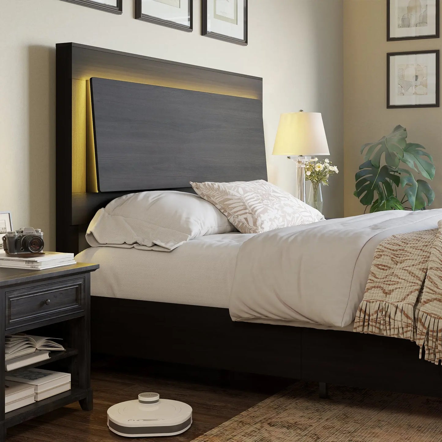 This headboard features a dual-layer structure with built-in LED lights, offering soft illumination. The 85° inclined block provides optimal support for the head, ensuring comfort and relaxation, while enhancing modern aesthetics and functionality.