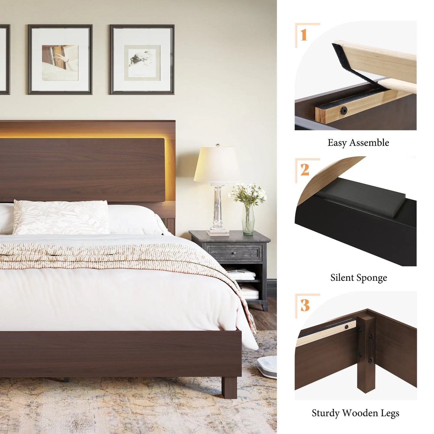 Our platform bed frame offers stability and support. It is supported by a combination of wooden legs, iron legs, and wood slates, ensures comfortable night's sleep.