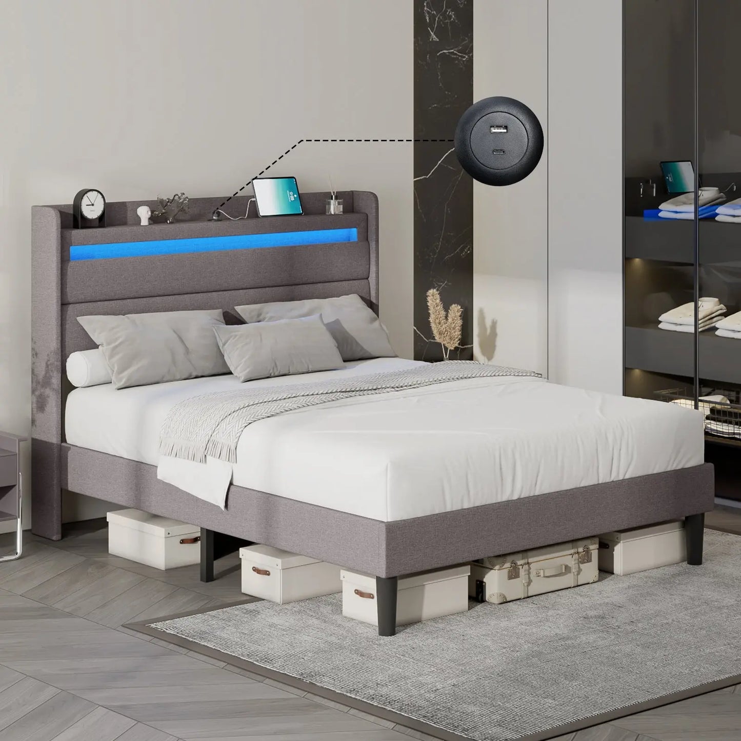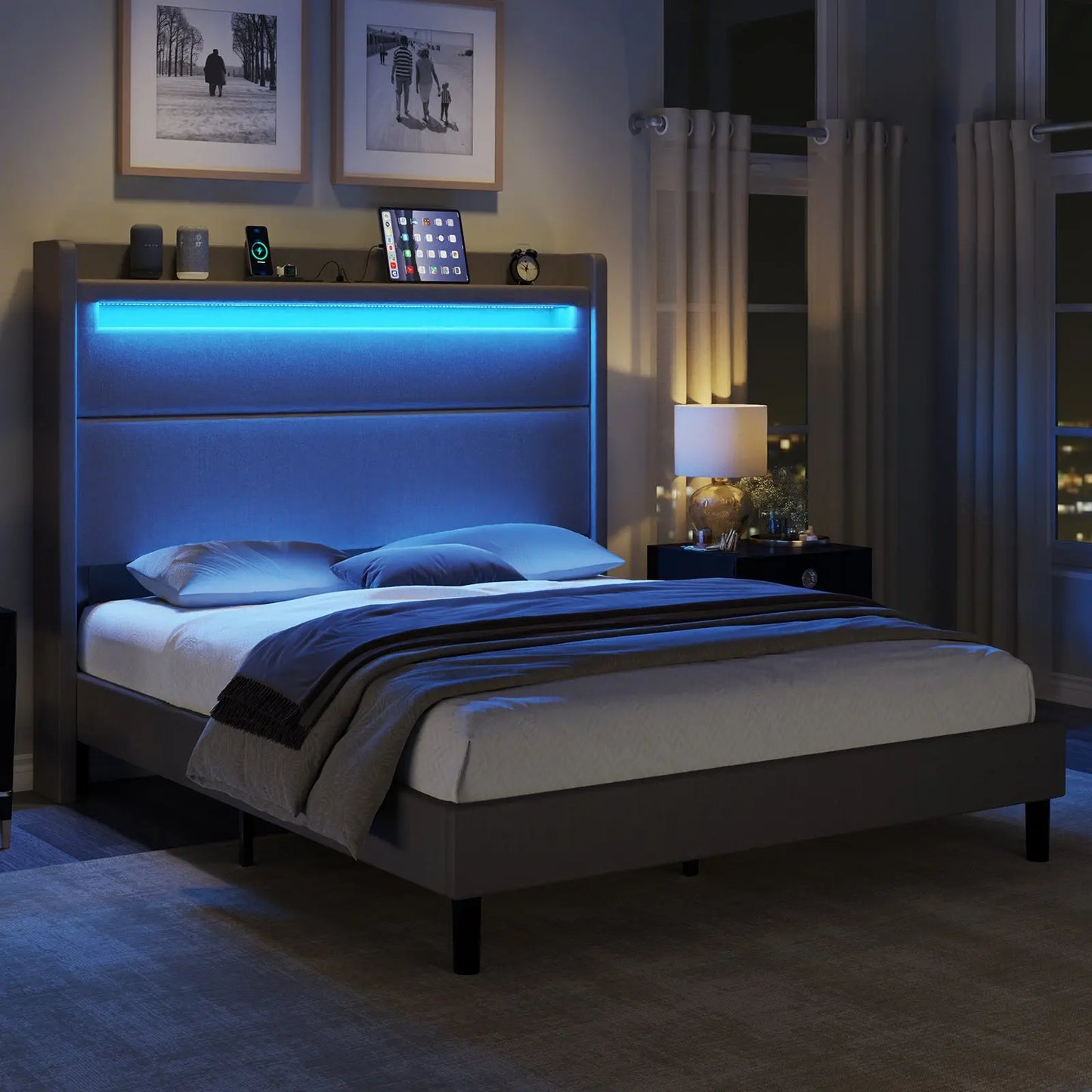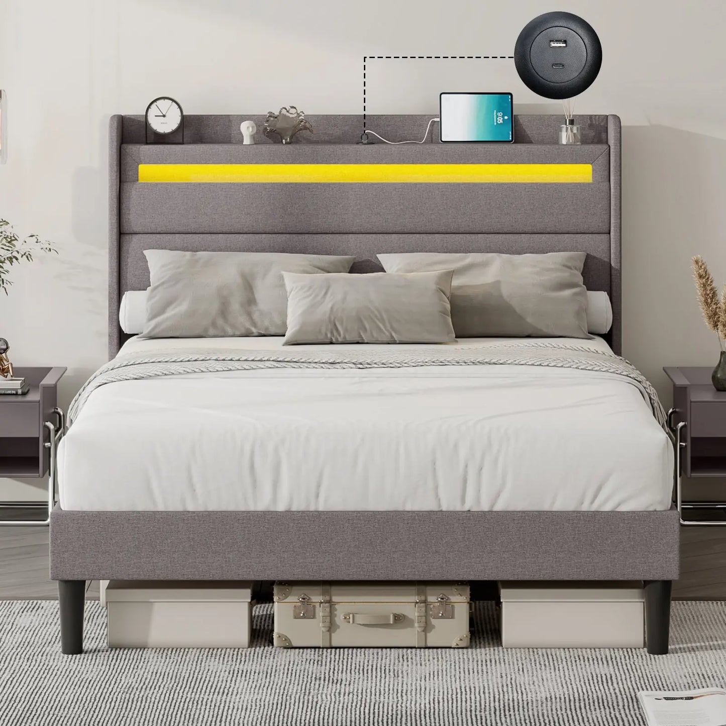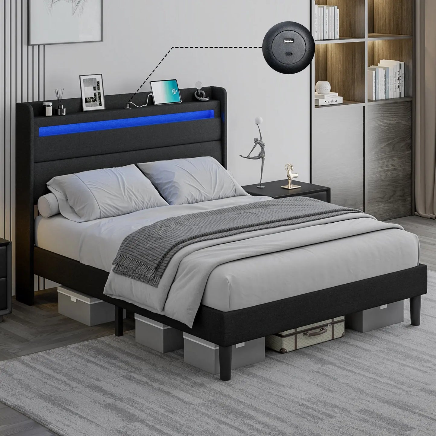 Modern style bed frame with charging station. UL and ETL Certified USB & USB-C charging ports, delivering a reliable voltage of 5V/2A to ensure efficient charging.