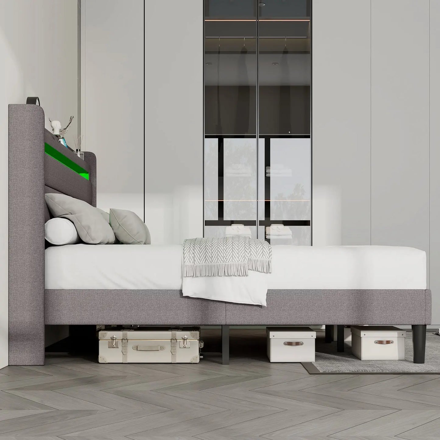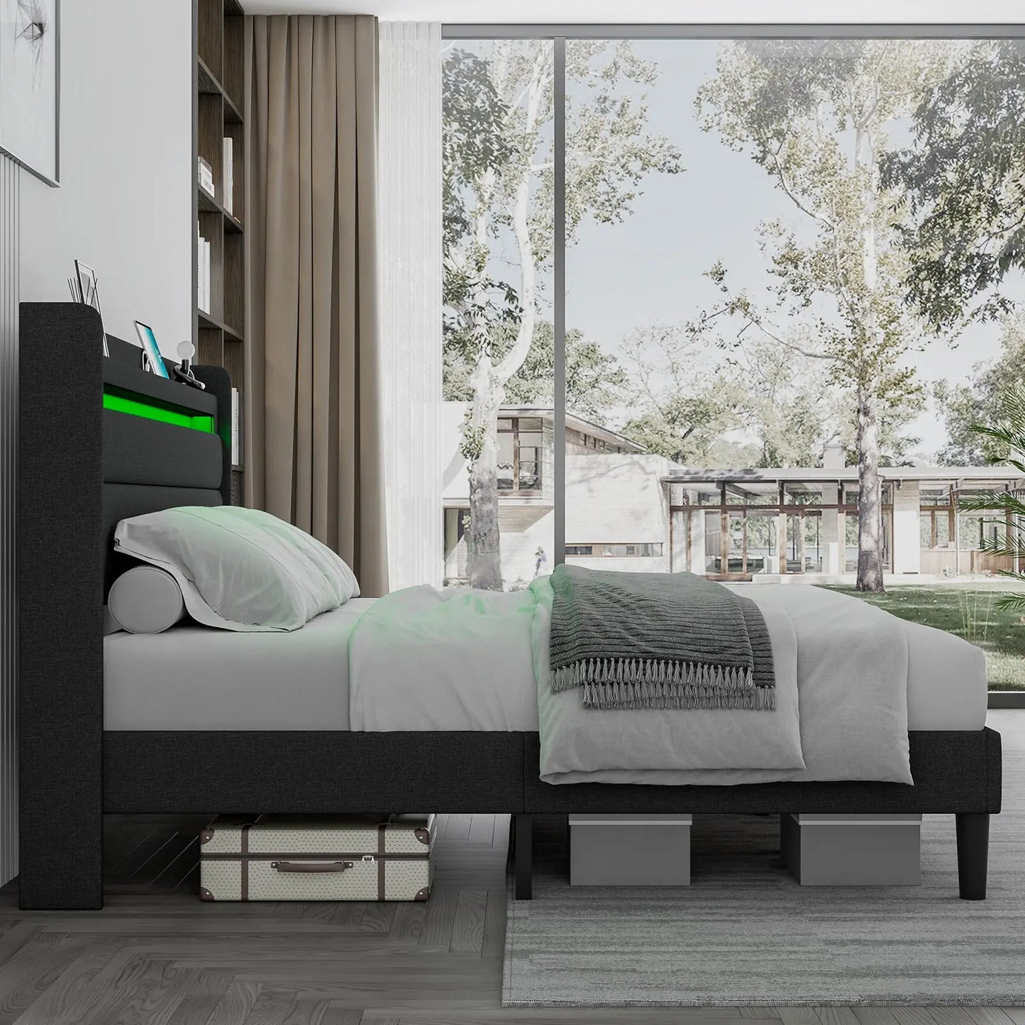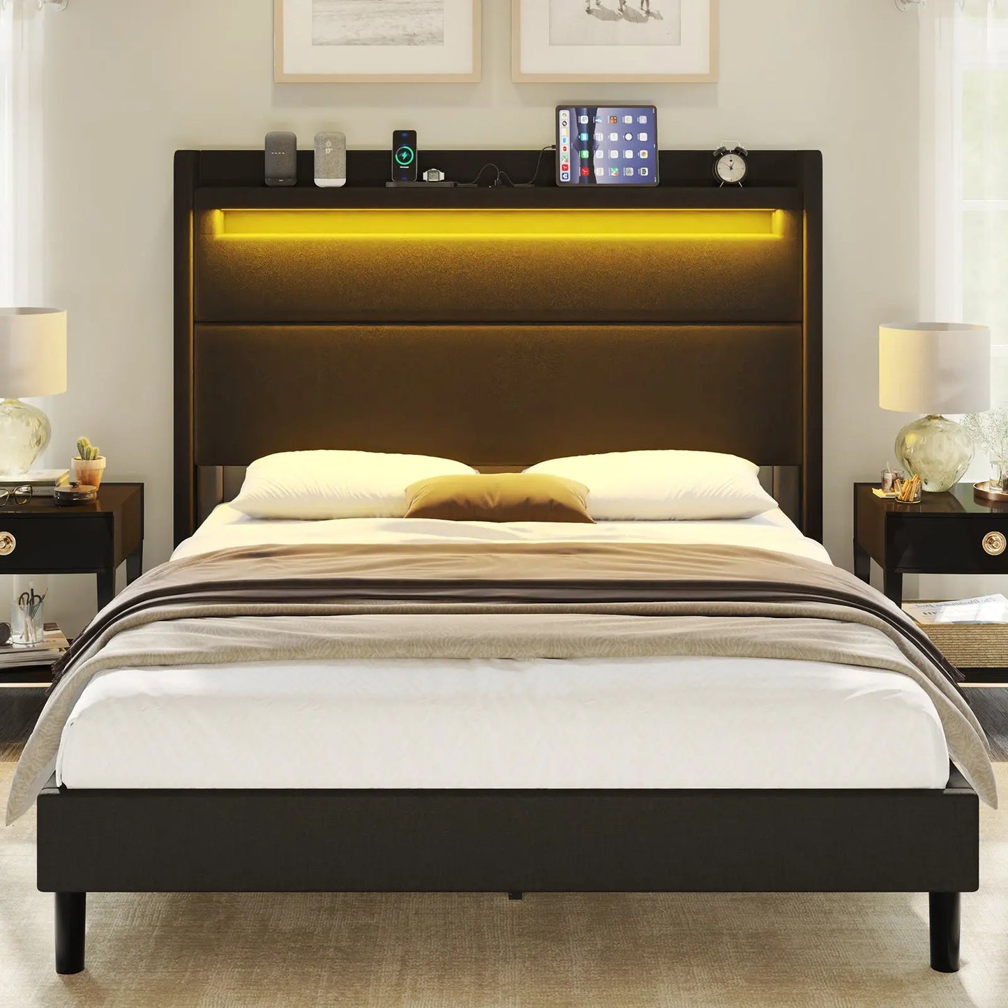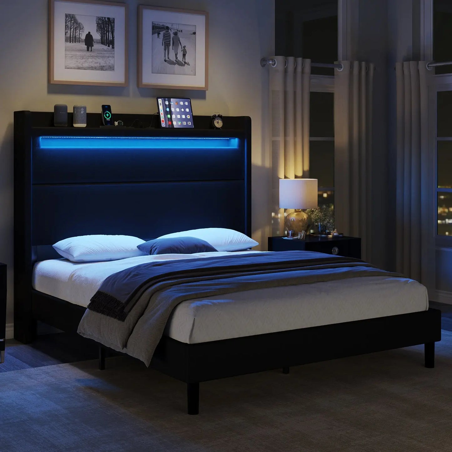 Modern style bed frame with charging station. UL and ETL Certified USB & USB-C charging ports, delivering a reliable voltage of 5V/2A to ensure efficient charging.