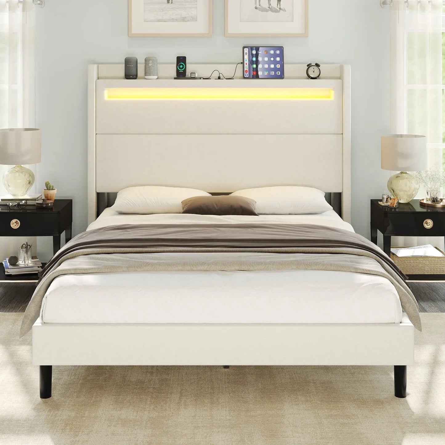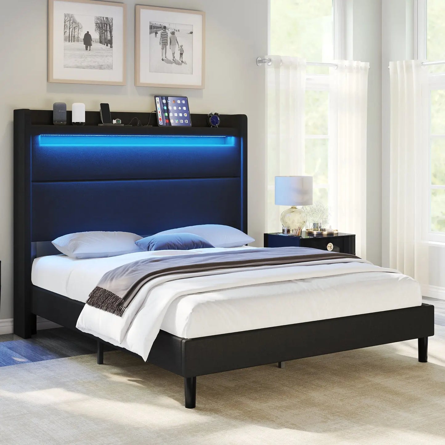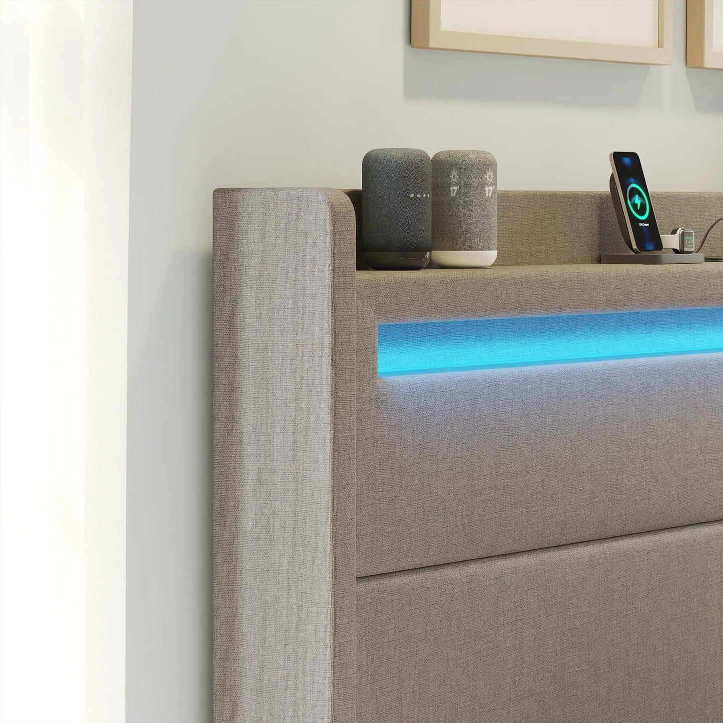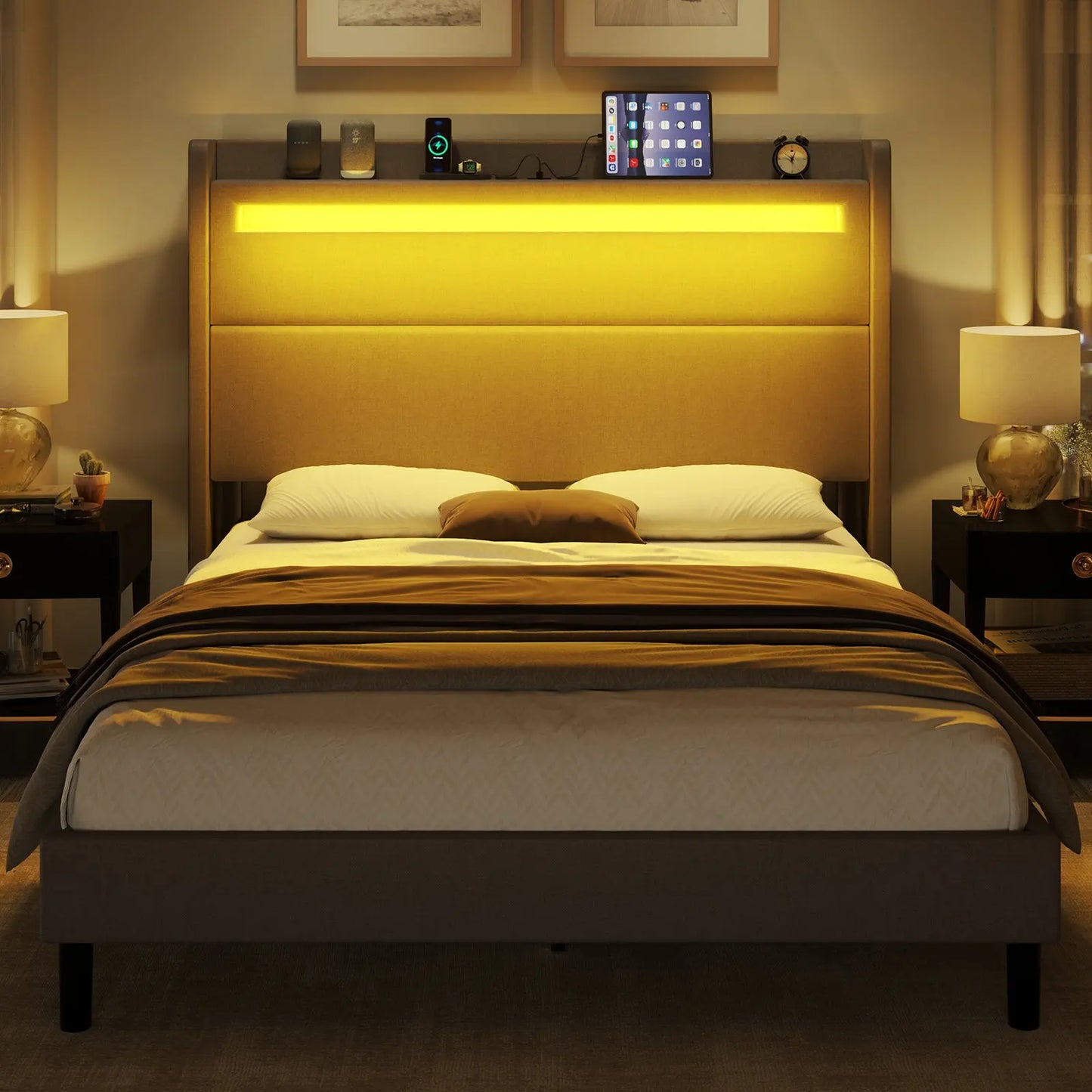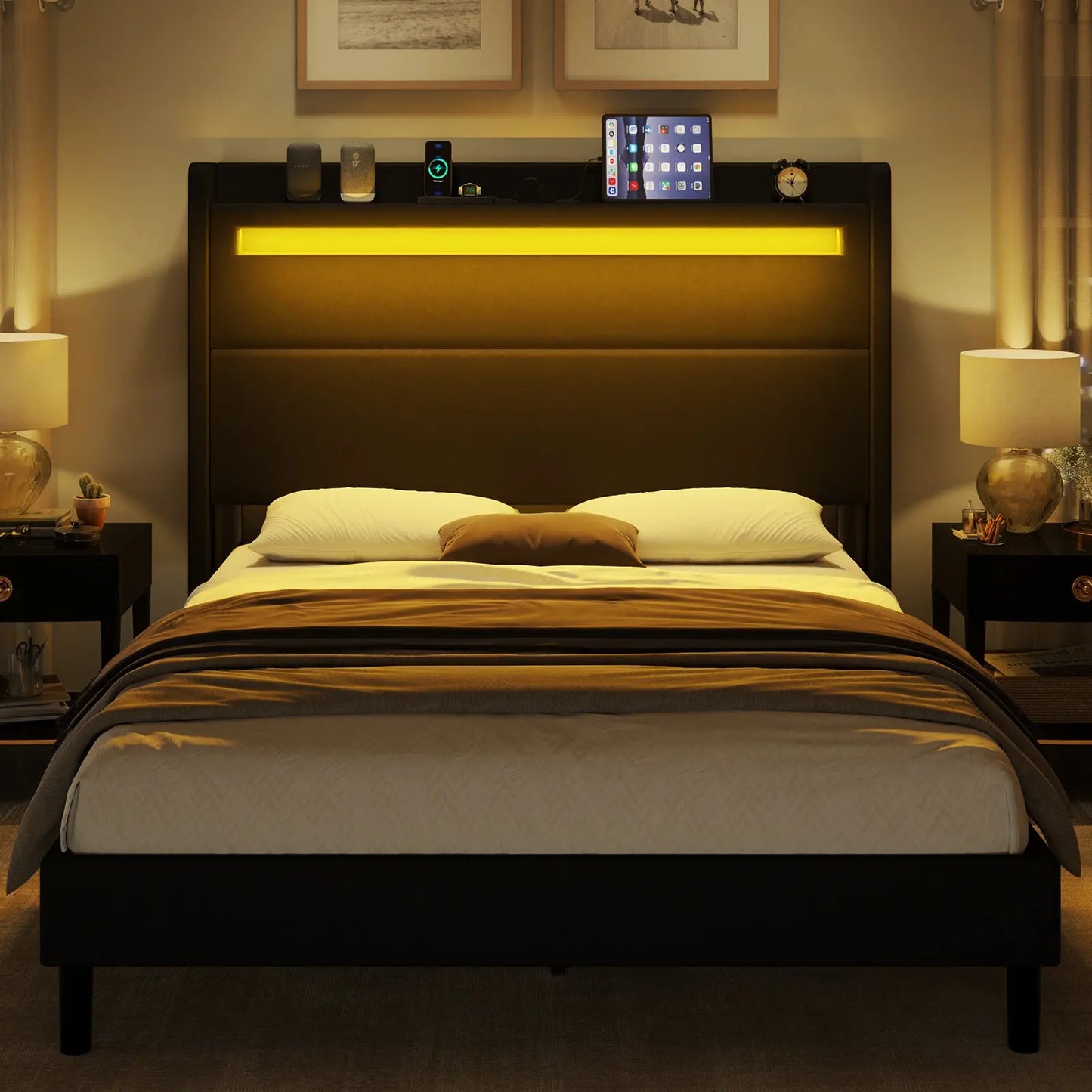 Modern style bed frame with charging station. UL and ETL Certified USB & USB-C charging ports, delivering a reliable voltage of 5V/2A to ensure efficient charging.