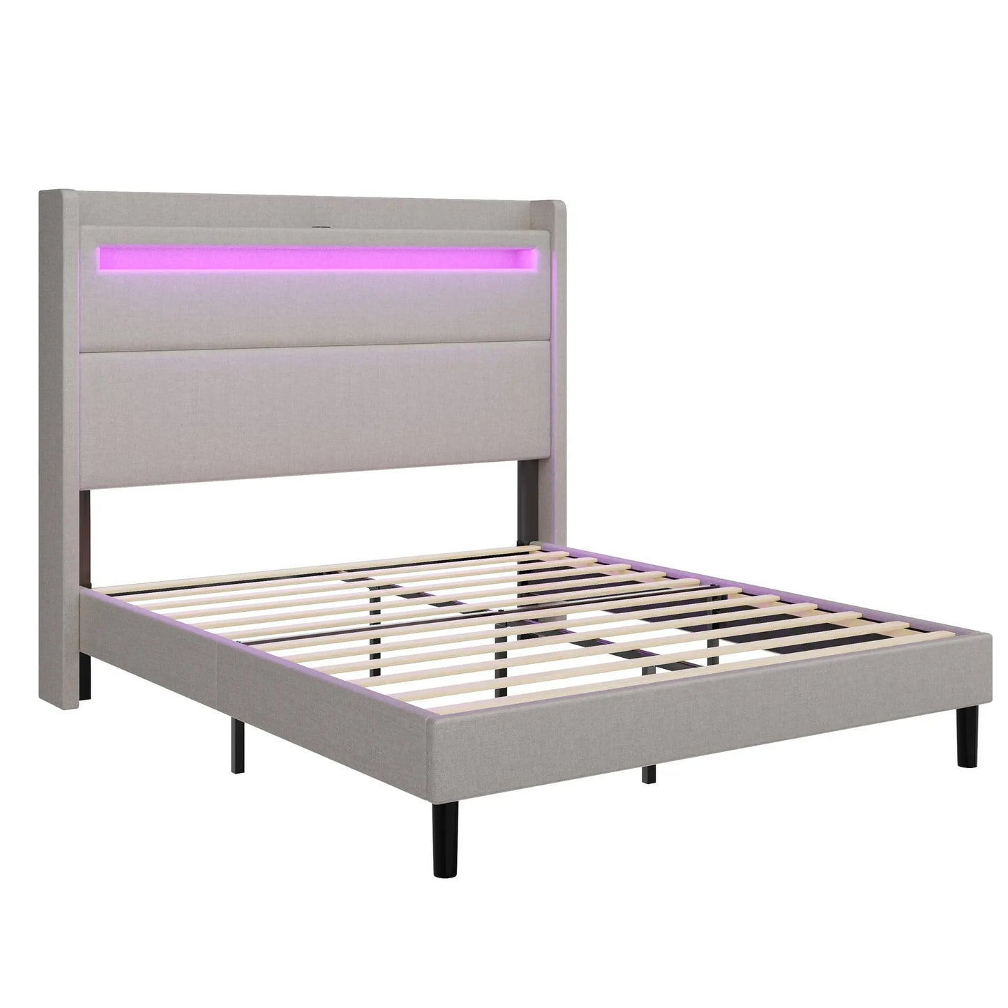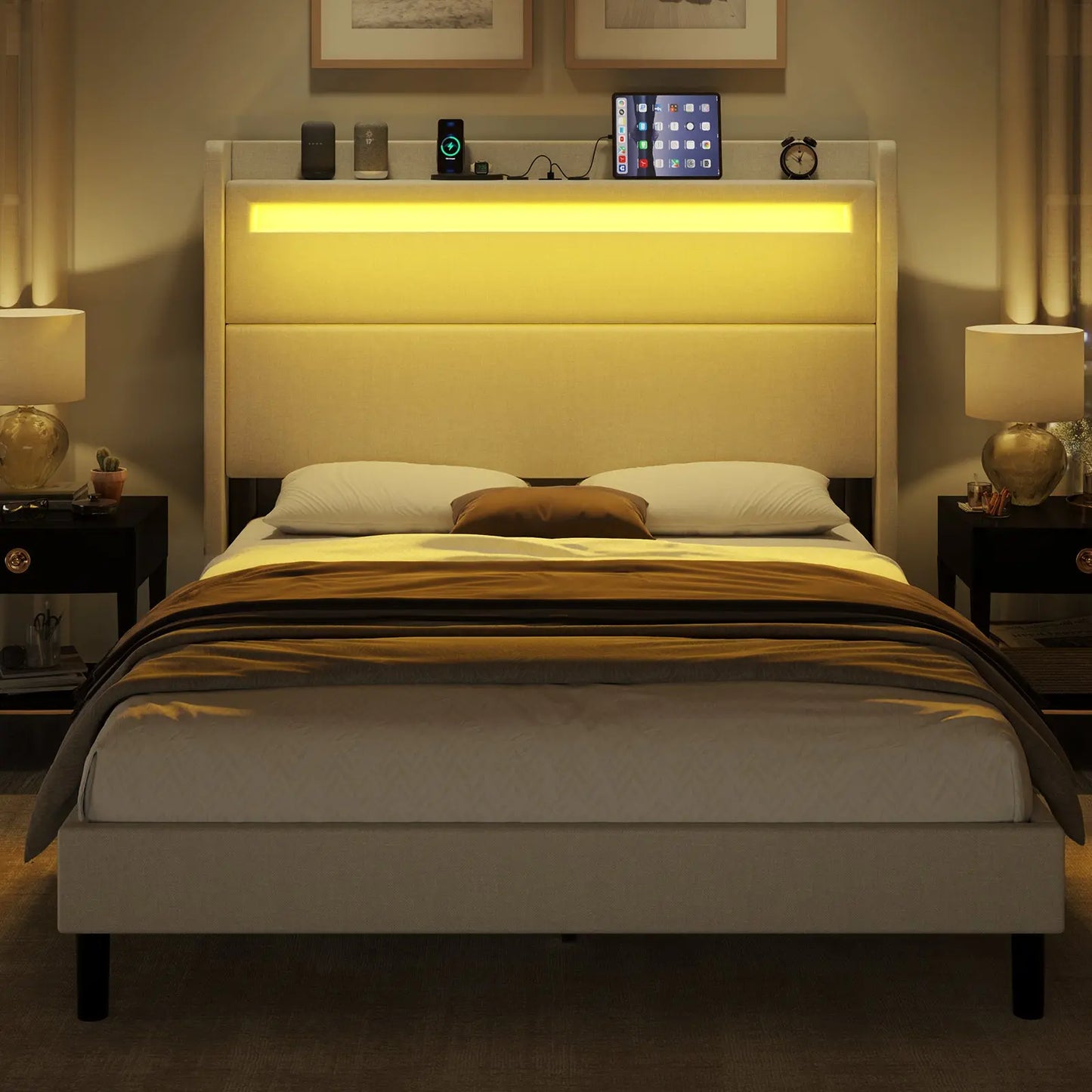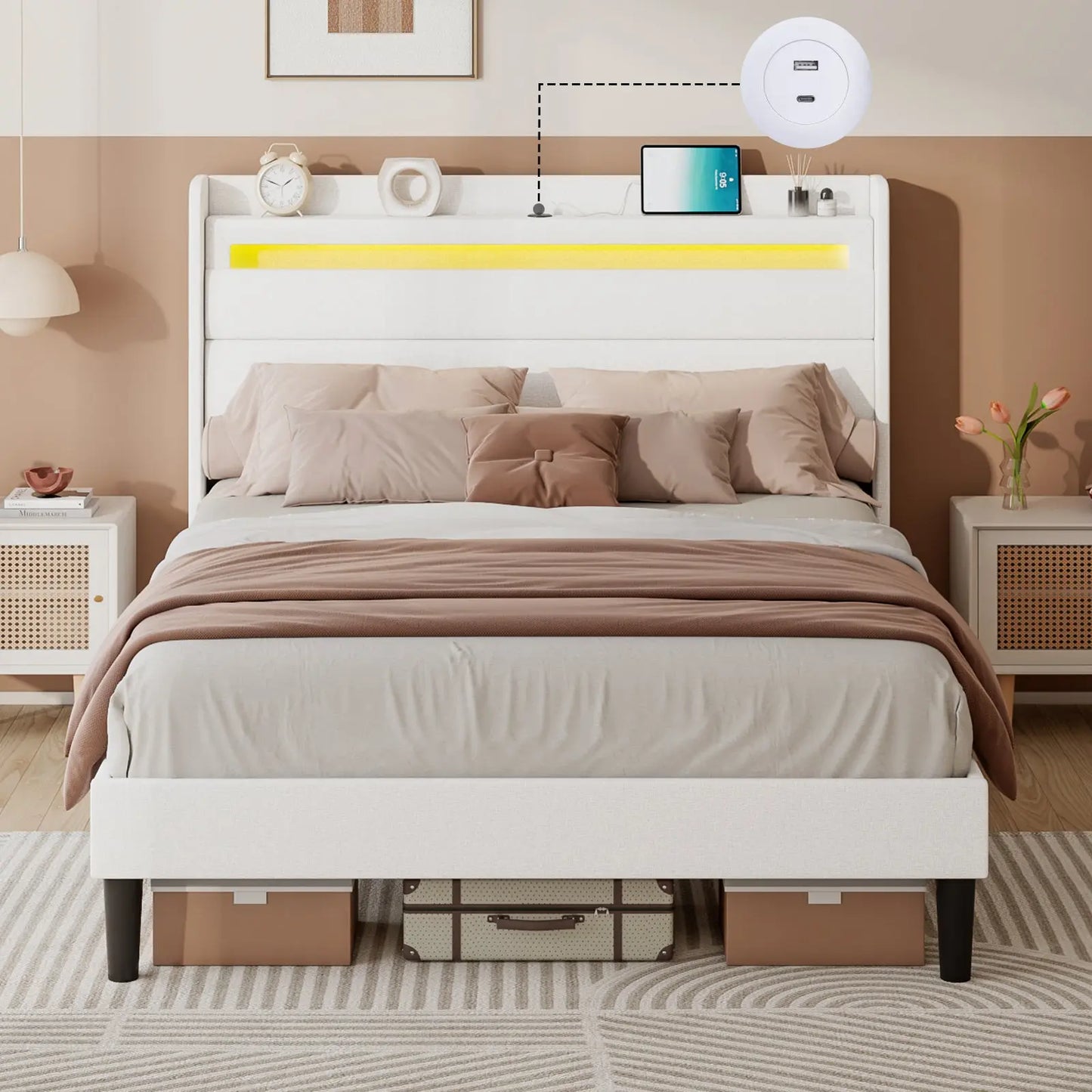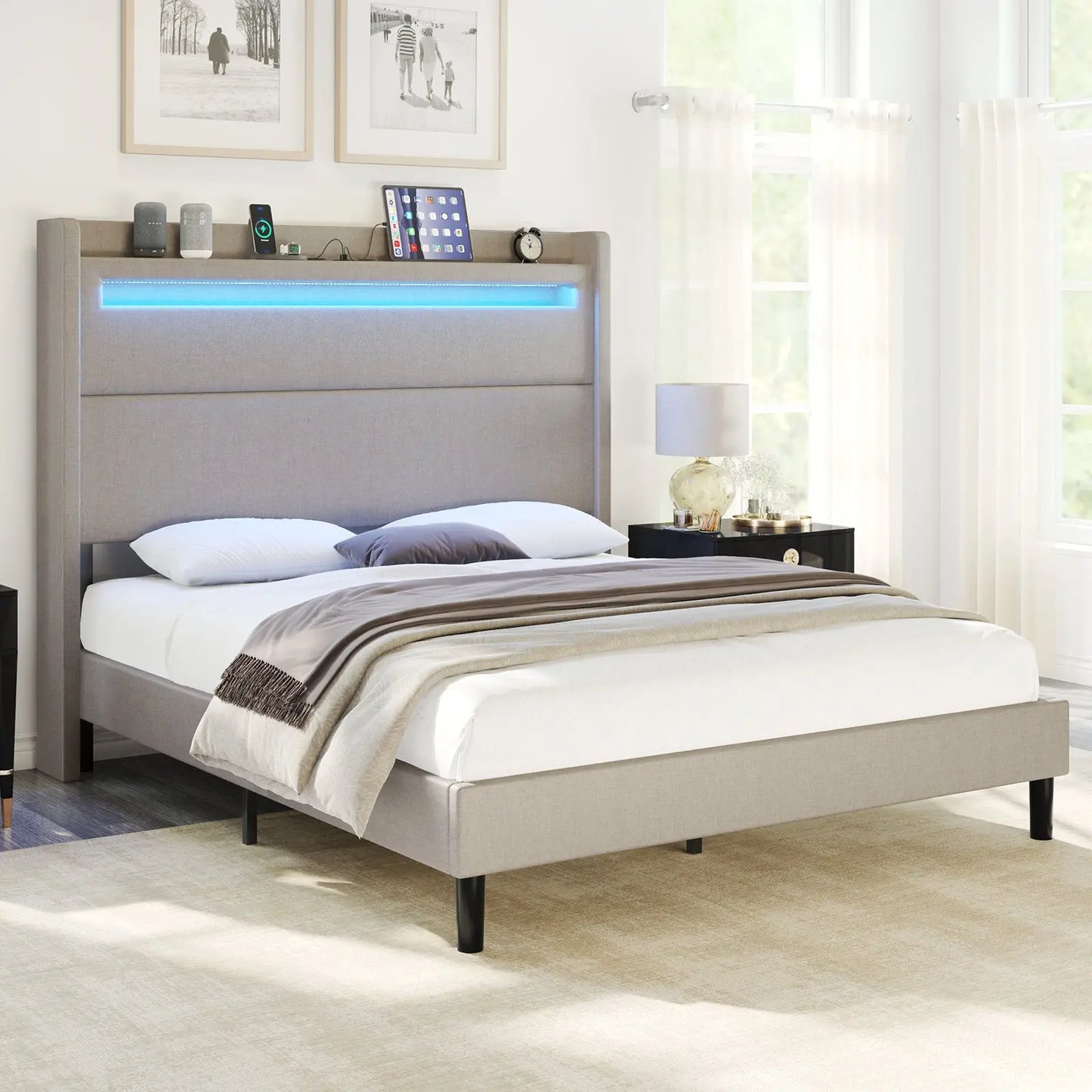 Modern style bed frame with charging station. UL and ETL Certified USB & USB-C charging ports, delivering a reliable voltage of 5V/2A to ensure efficient charging.