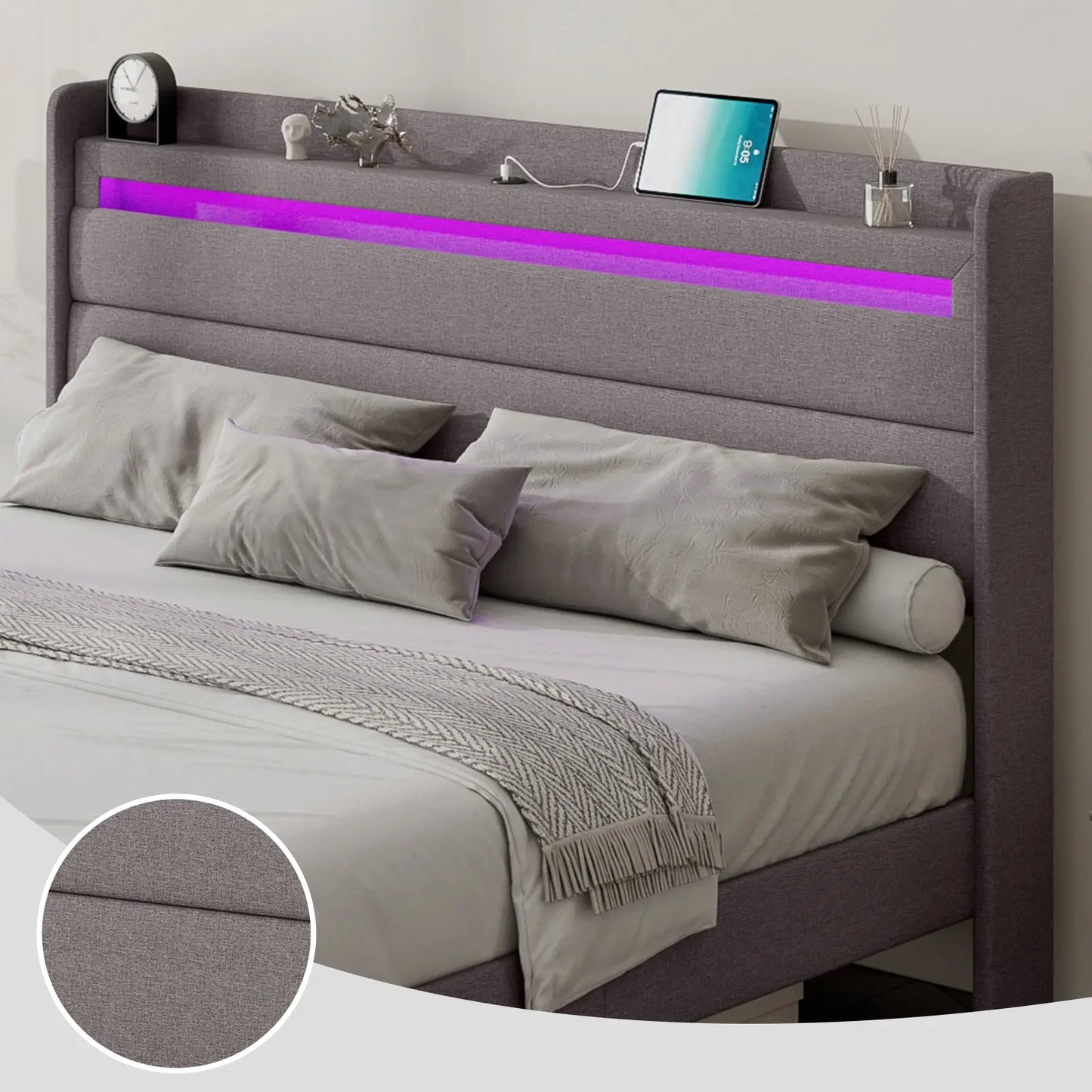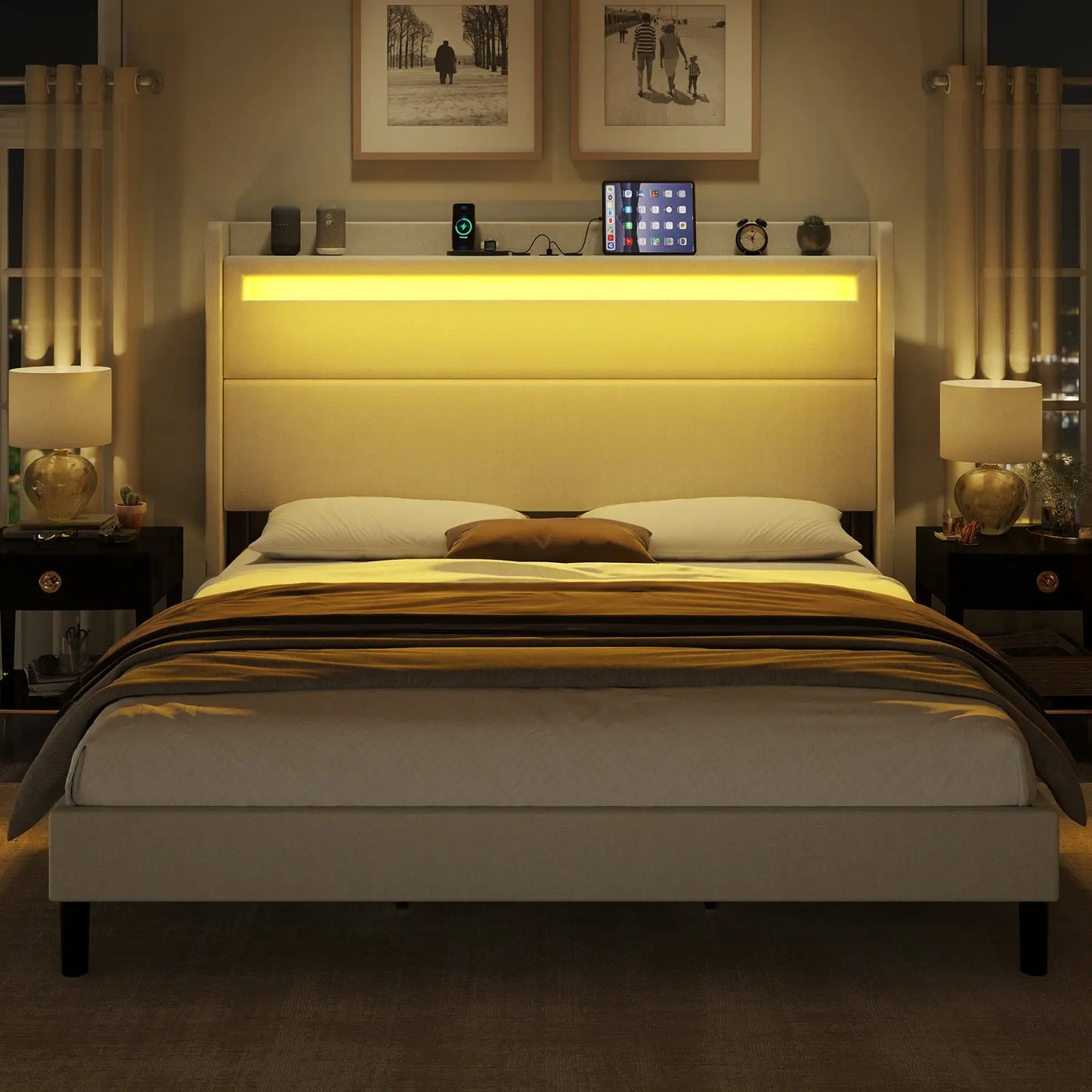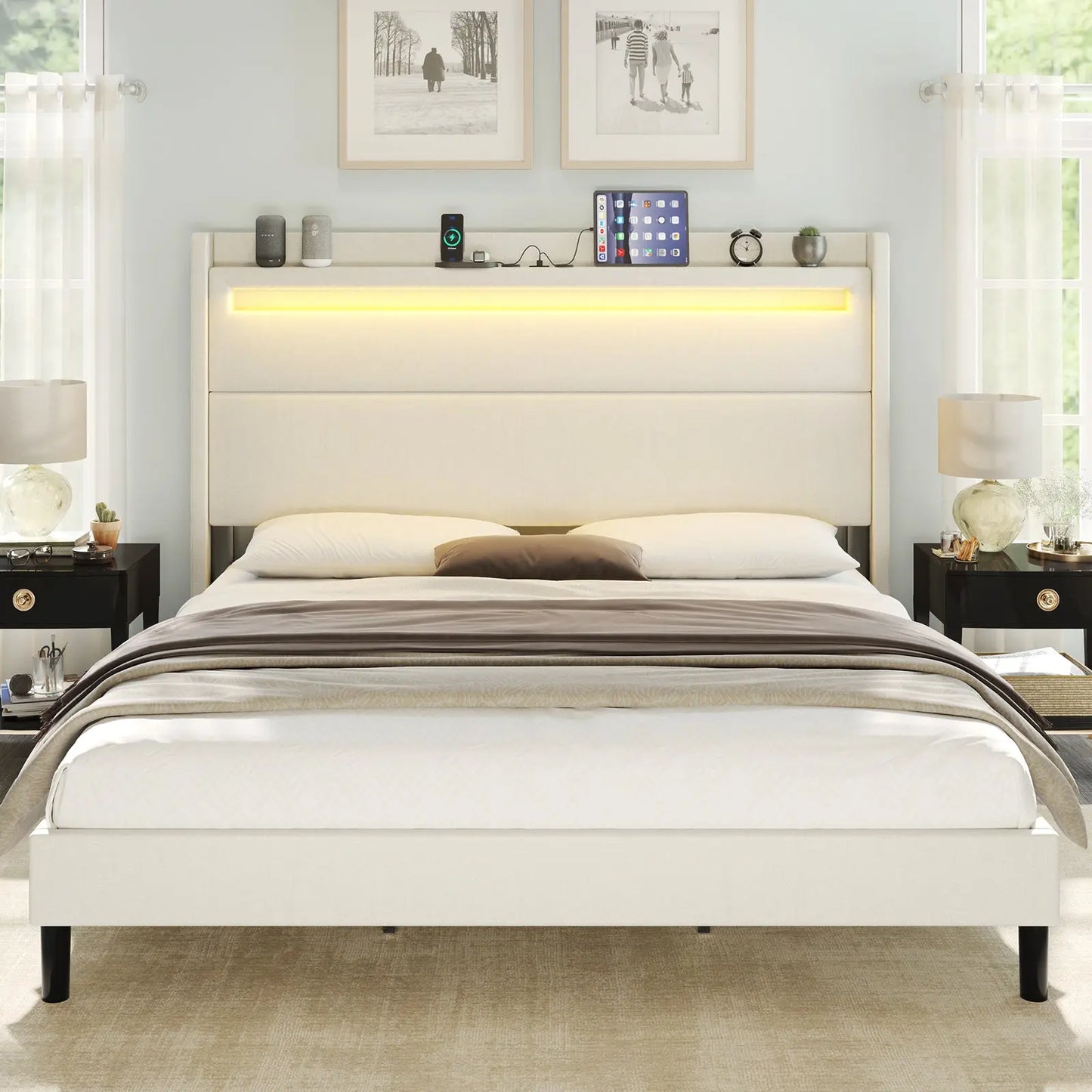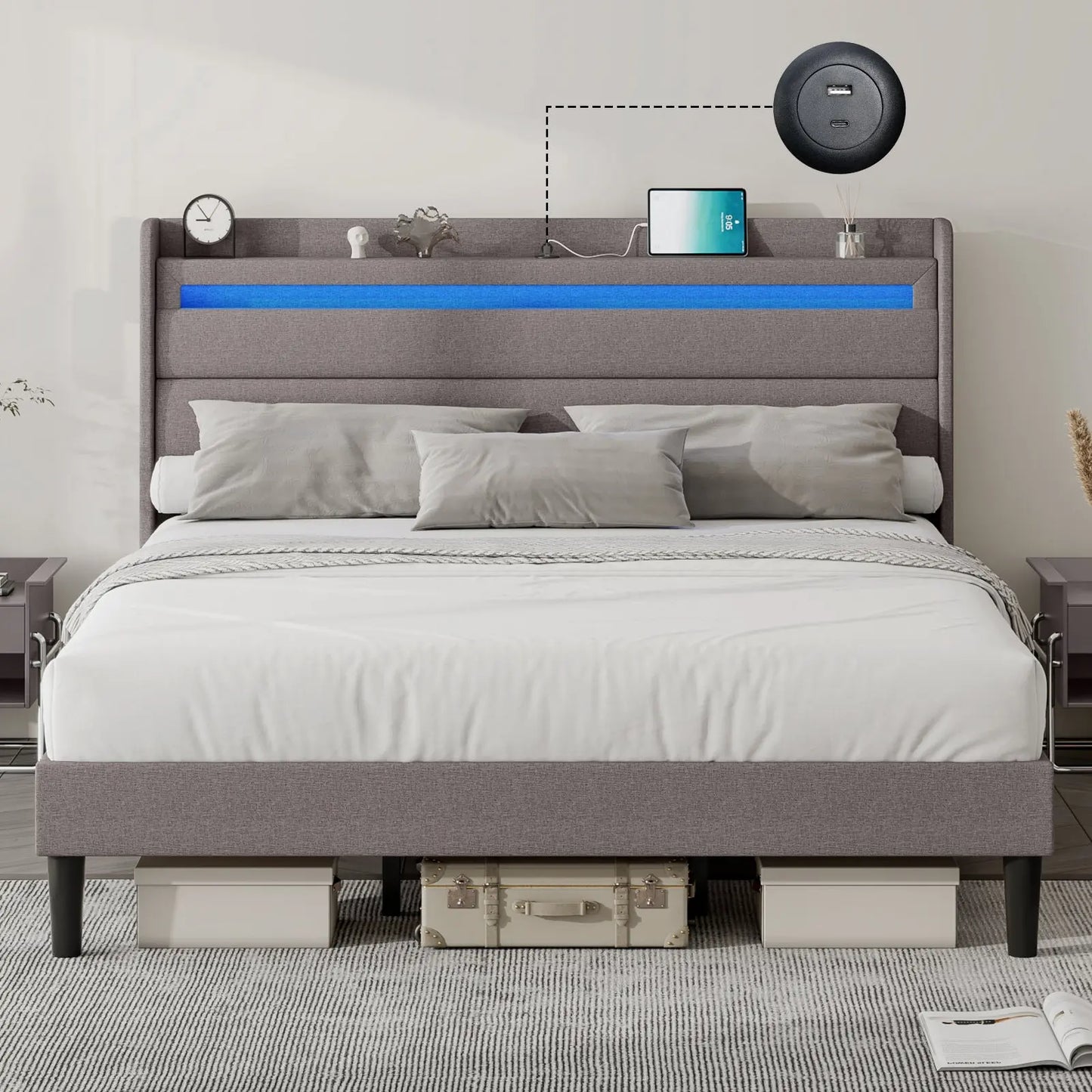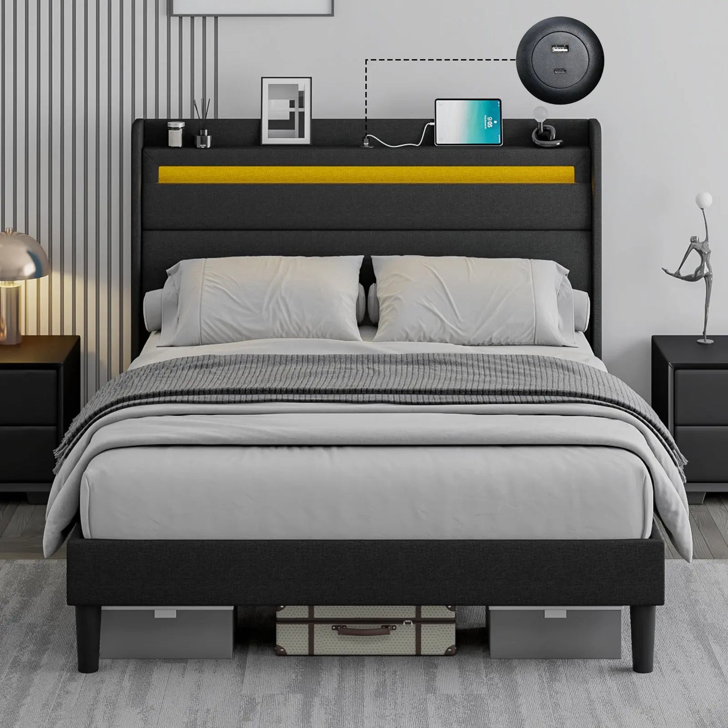 Modern style bed frame with charging station. UL and ETL Certified USB & USB-C charging ports, delivering a reliable voltage of 5V/2A to ensure efficient charging.