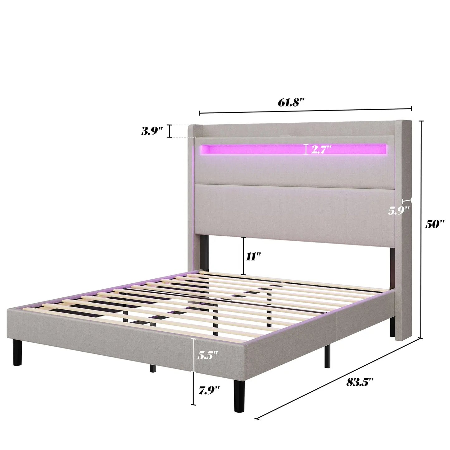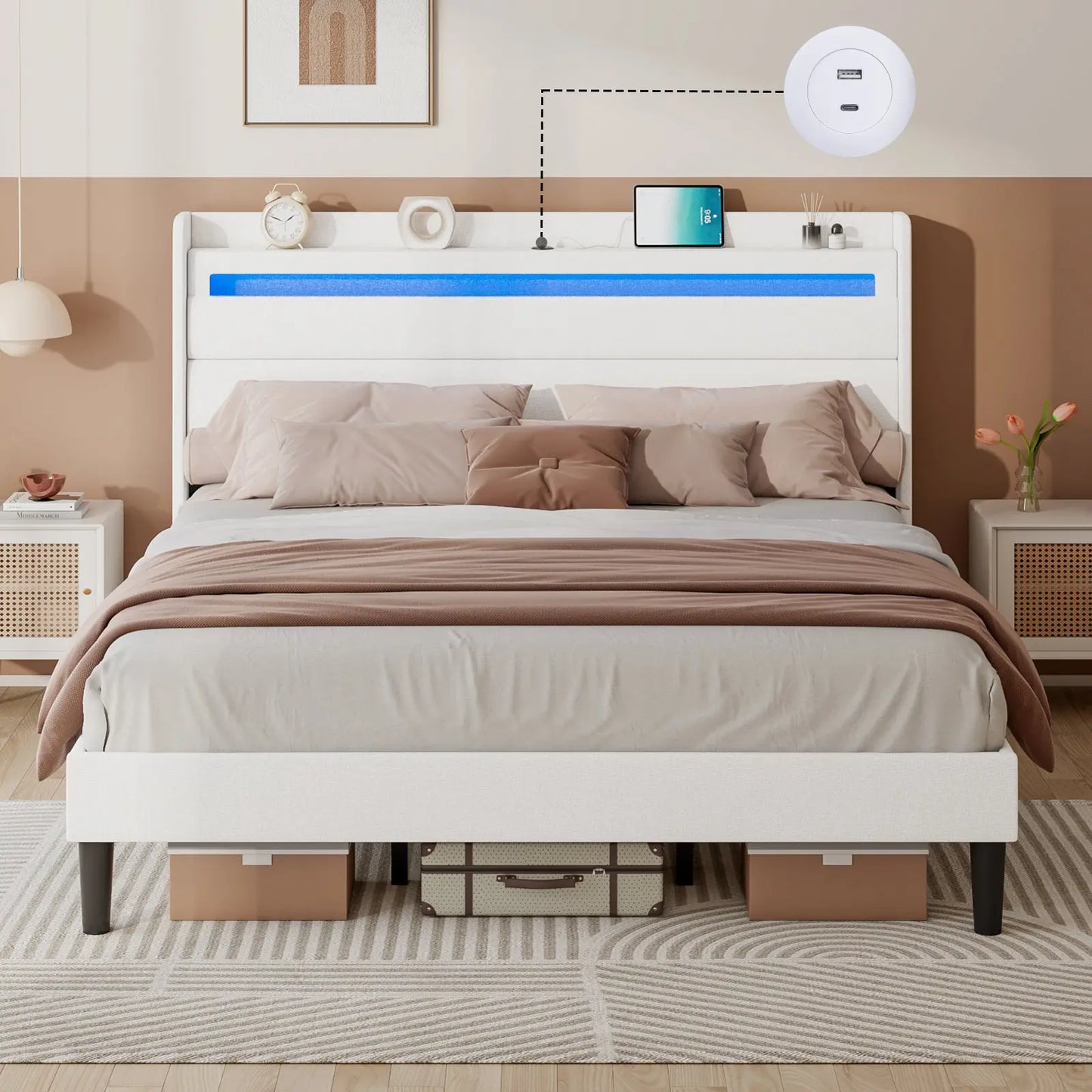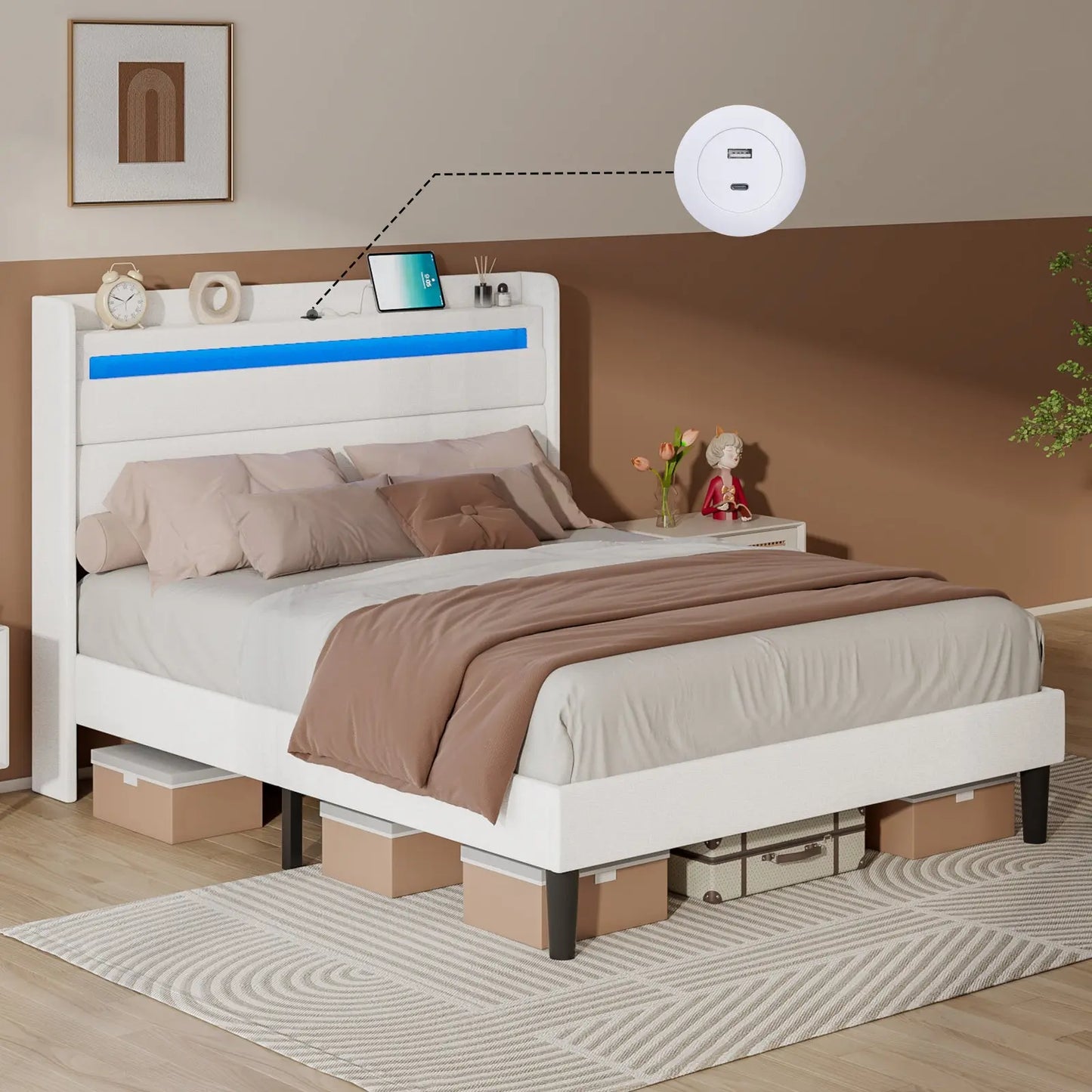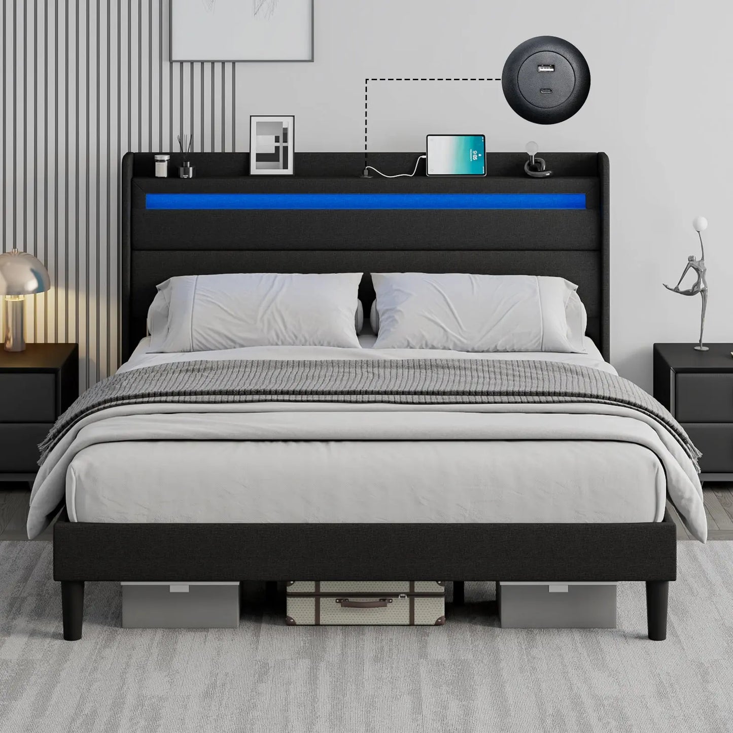 Modern style bed frame with charging station. UL and ETL Certified USB & USB-C charging ports, delivering a reliable voltage of 5V/2A to ensure efficient charging.