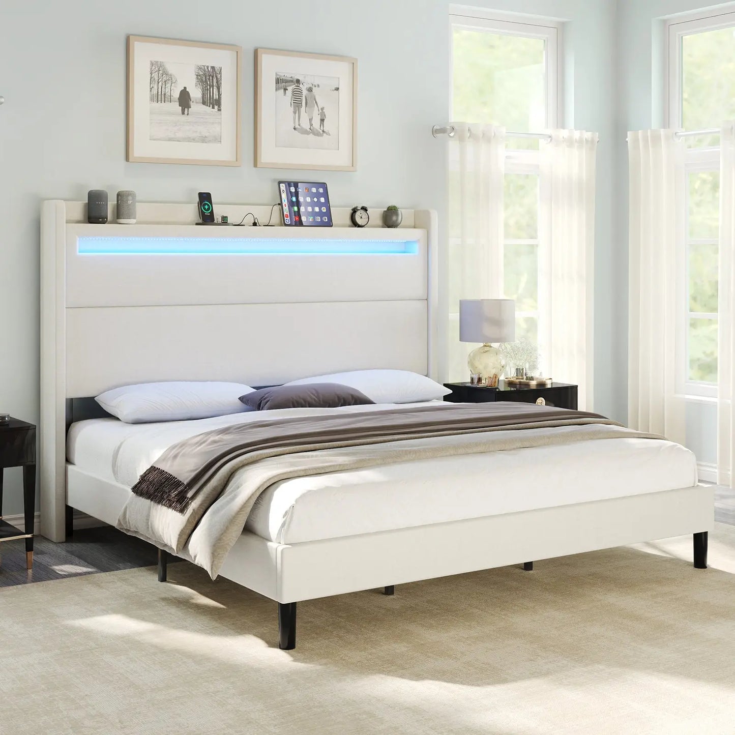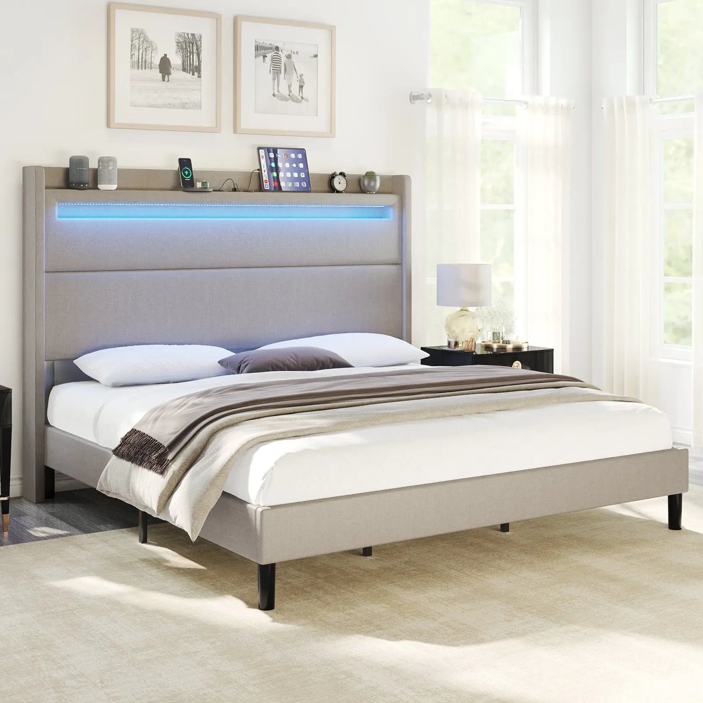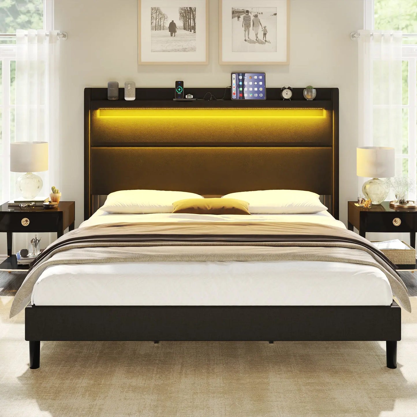 Modern style bed frame with charging station. UL and ETL Certified USB & USB-C charging ports, delivering a reliable voltage of 5V/2A to ensure efficient charging.