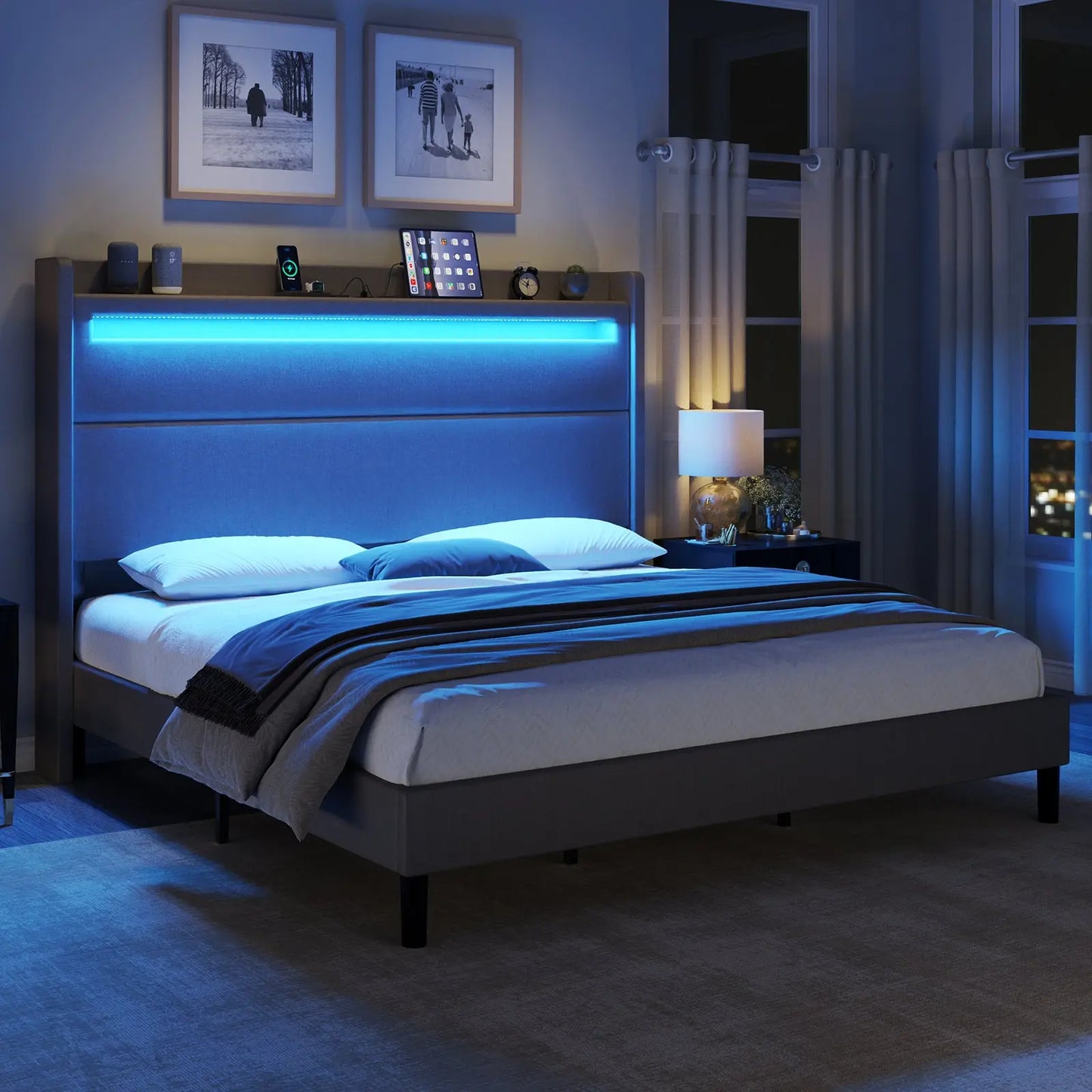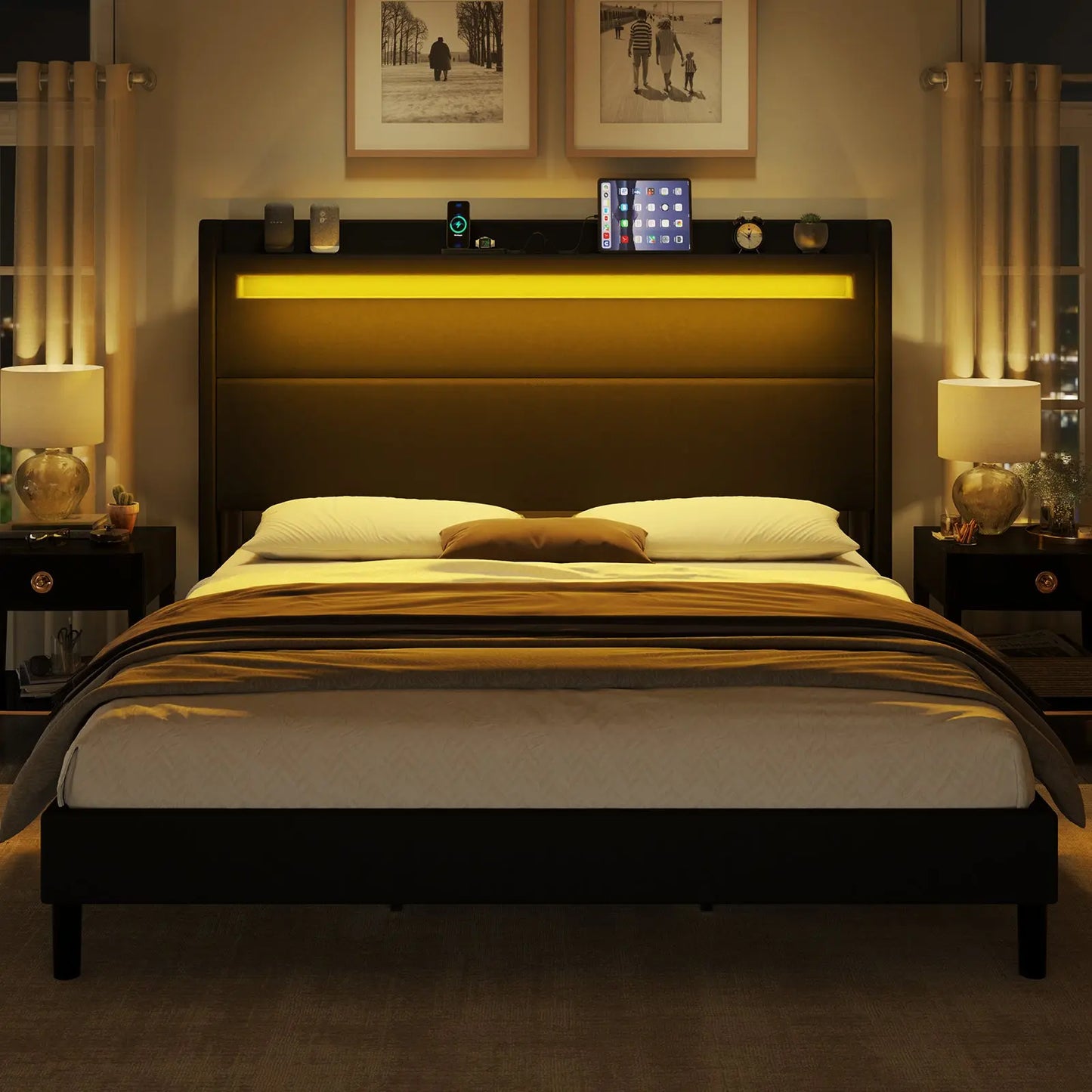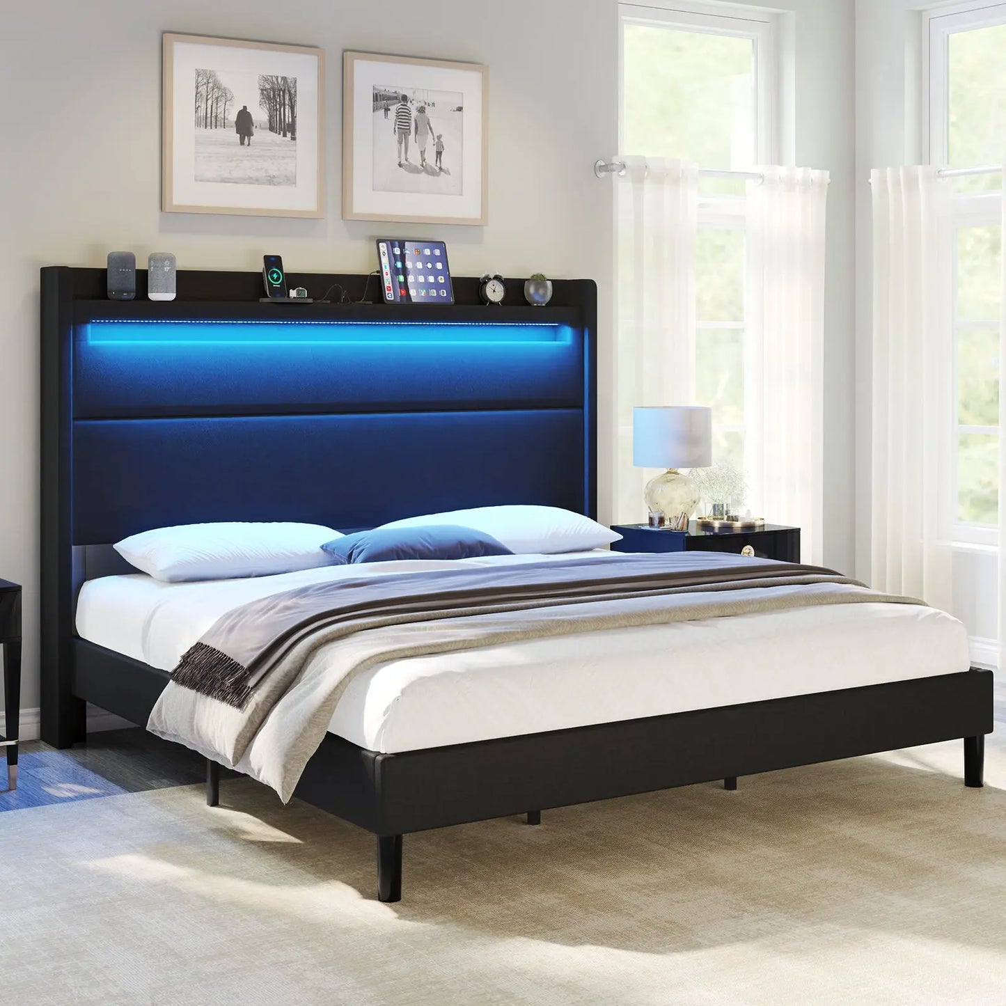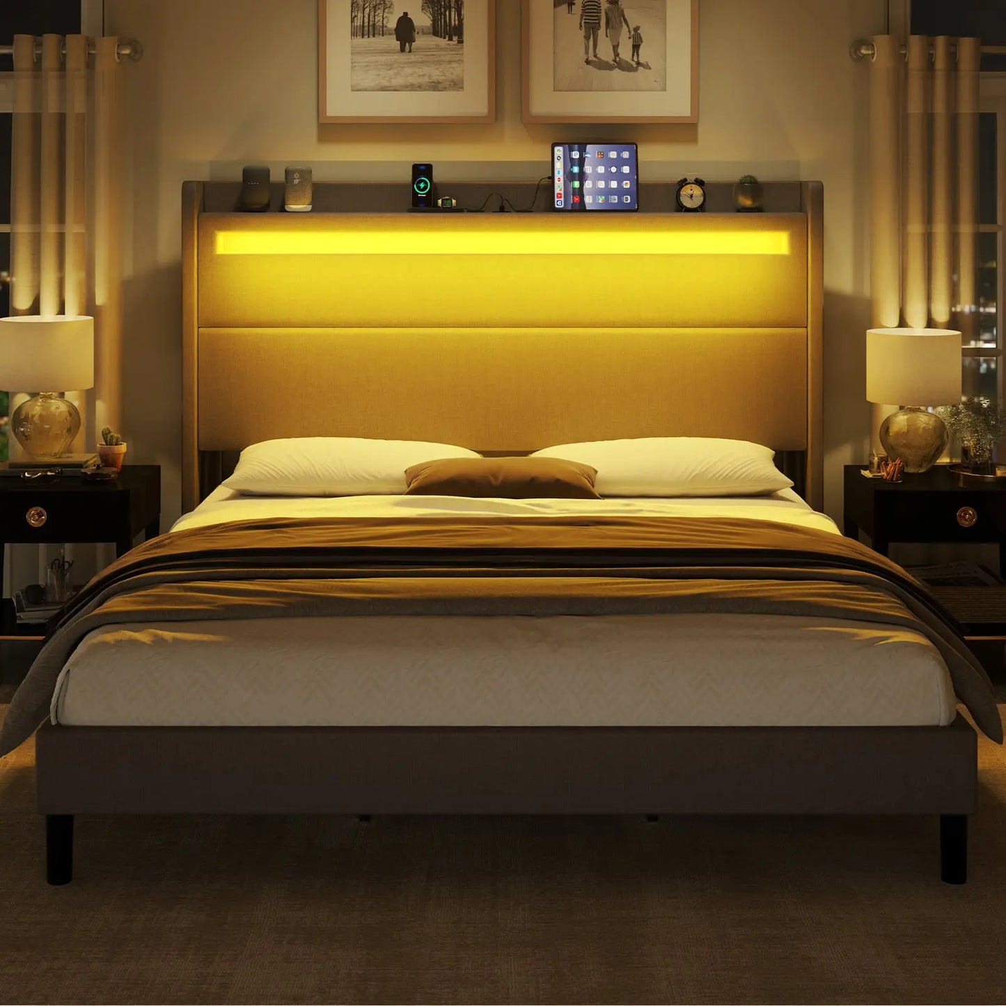 Modern style bed frame with charging station. UL and ETL Certified USB & USB-C charging ports, delivering a reliable voltage of 5V/2A to ensure efficient charging.