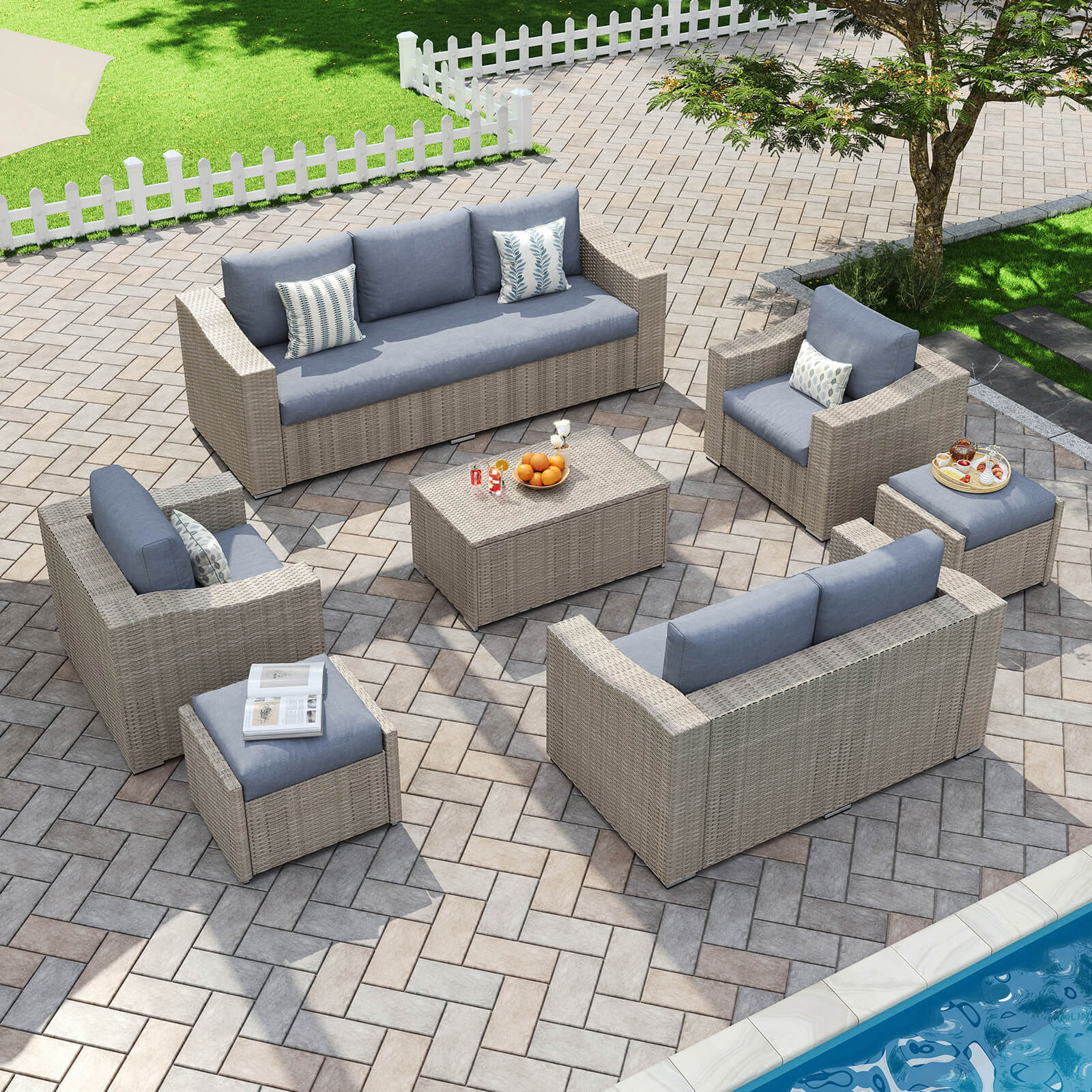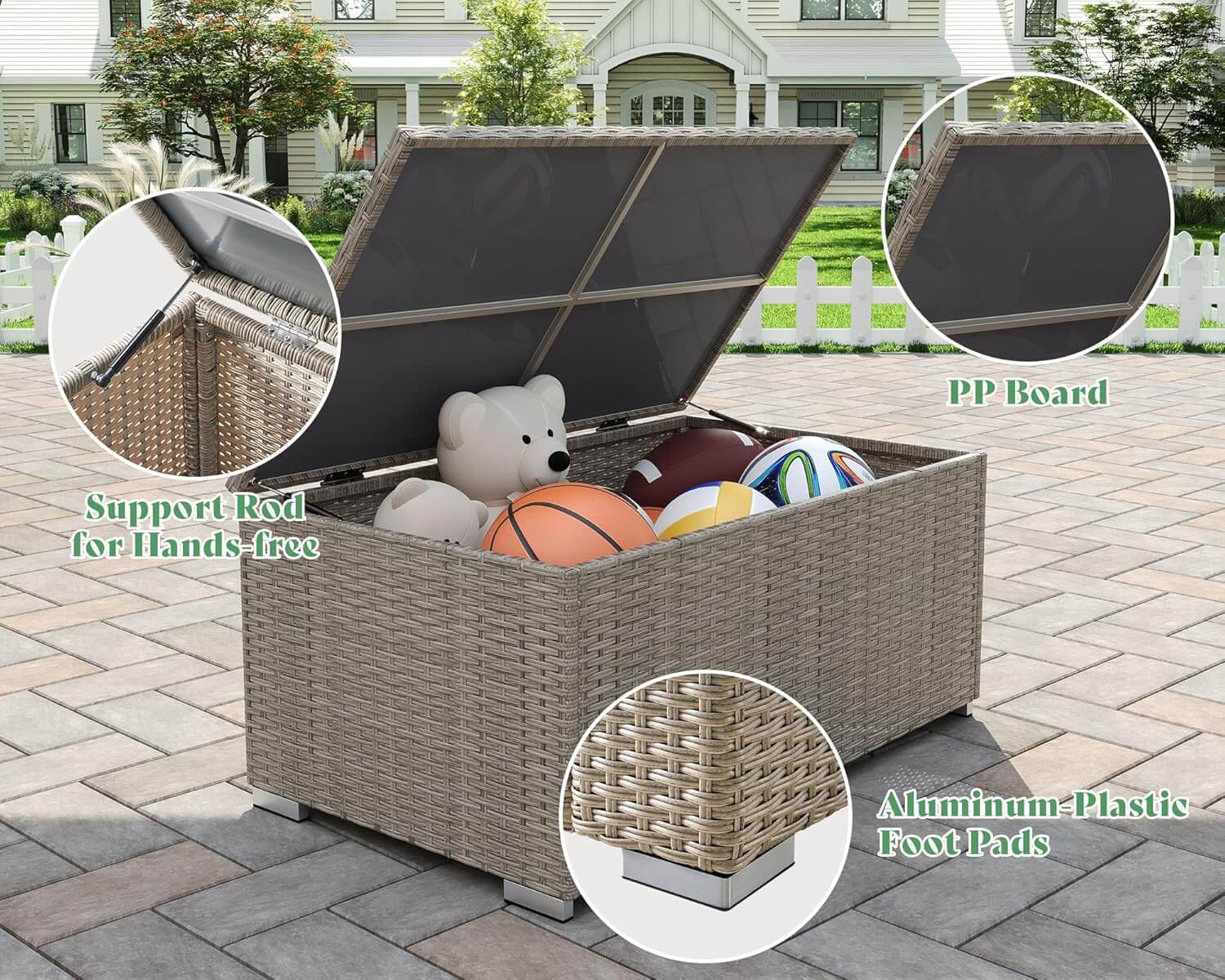 2 Ottomans serve as footrests, seats, or side tables, with seating adjustable from 7 to 9 persons. The storage coffee table easily stores cushions, blankets, or accessories, organizing your patio furniture or outdoor sofa set.