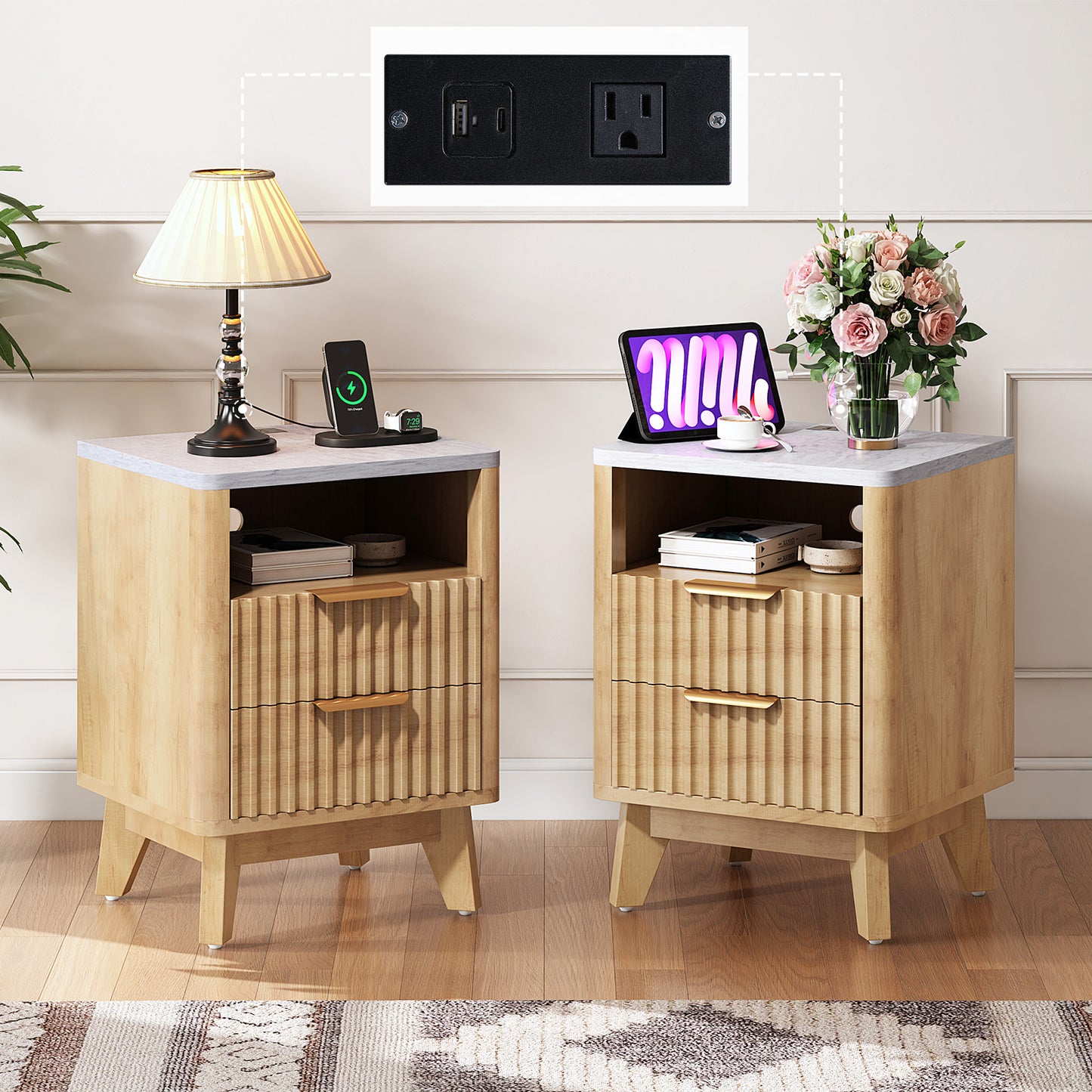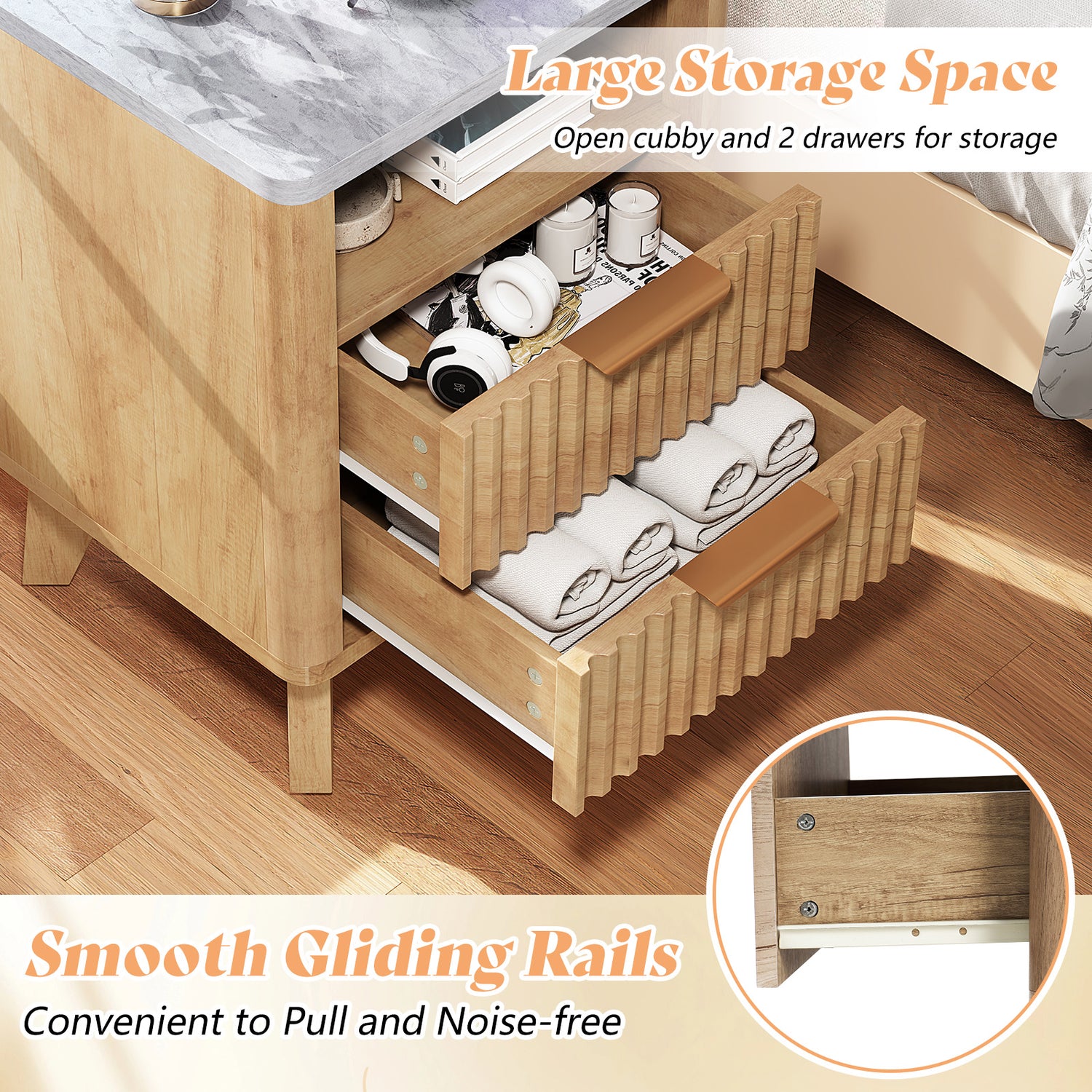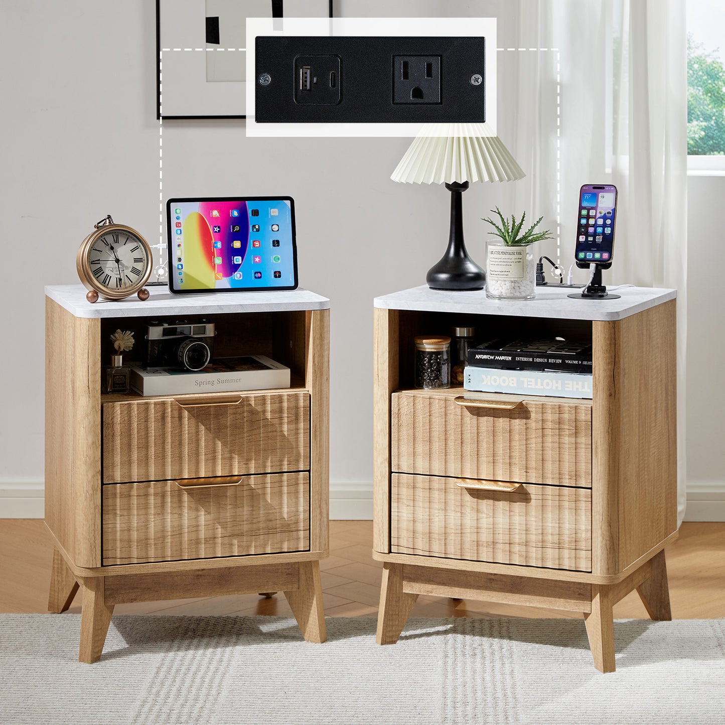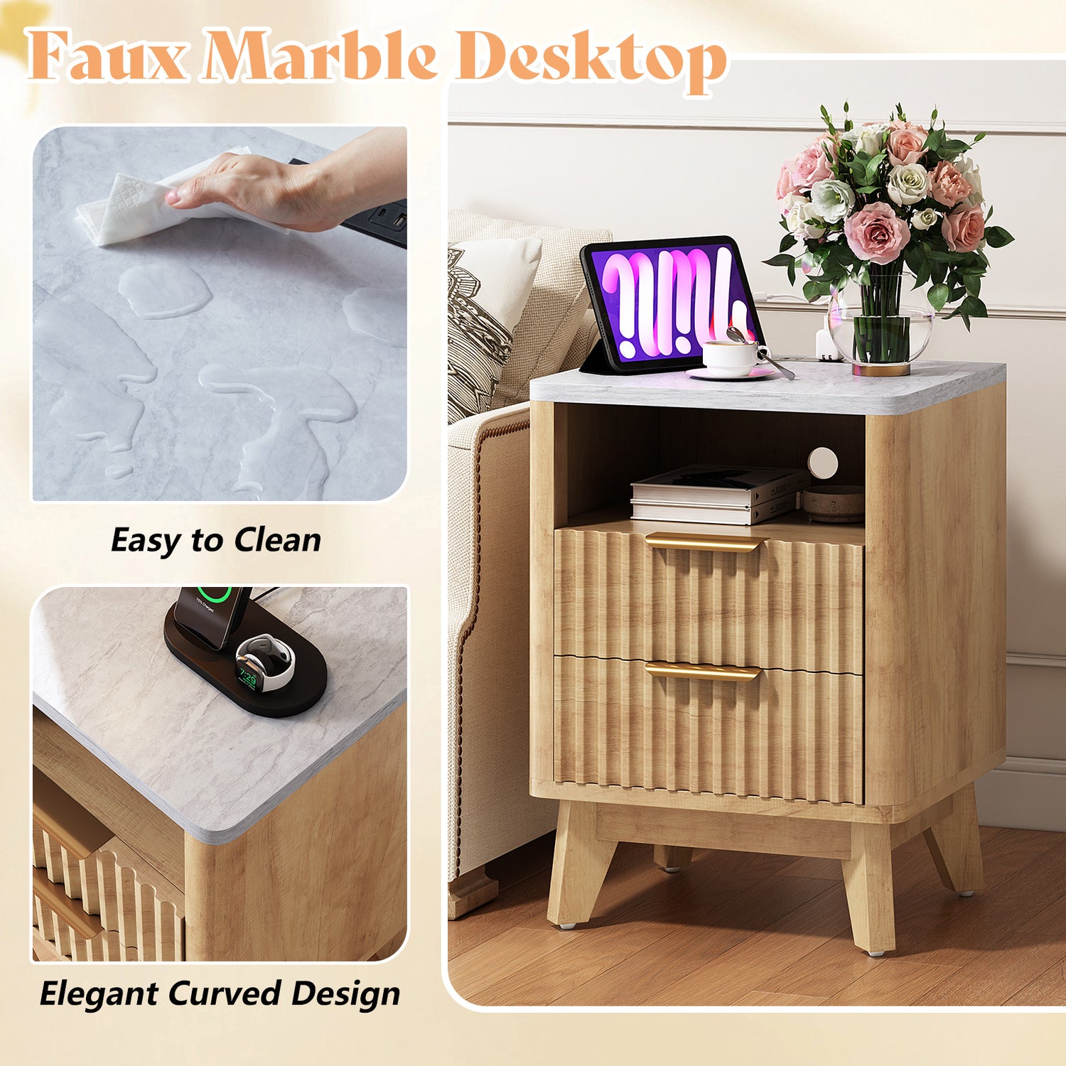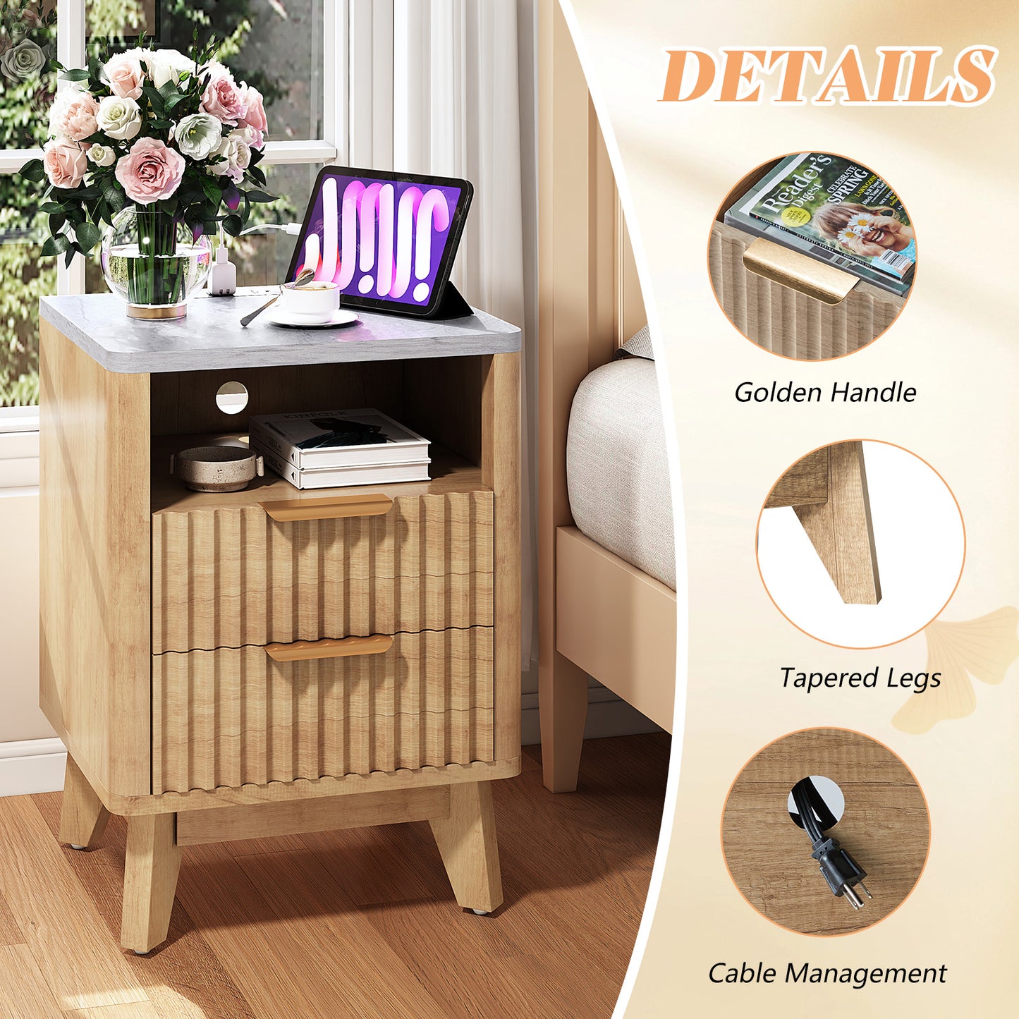 The Cropredy Nightstand combines distinctive design with practical functionality. Featuring unique wave groove panels crafted with blister technology and a sleek white faux marble tabletop, it adds modern elegance to any room. The faux marble is durable, textured, and easy to clean. A built-in charging station with AC, USB, and Type-C ports keeps your devices powered, while two drawers and an open cubby provide ample storage for essentials. Designed with curved edges for safety, it’s versatile enough to serve as a nightstand, side table, or end table. Made from premium P2-engineered wood with sturdy tapered legs, durable metal handles, and a waterproof veneer, the Cropredy Nightstand is built to last.