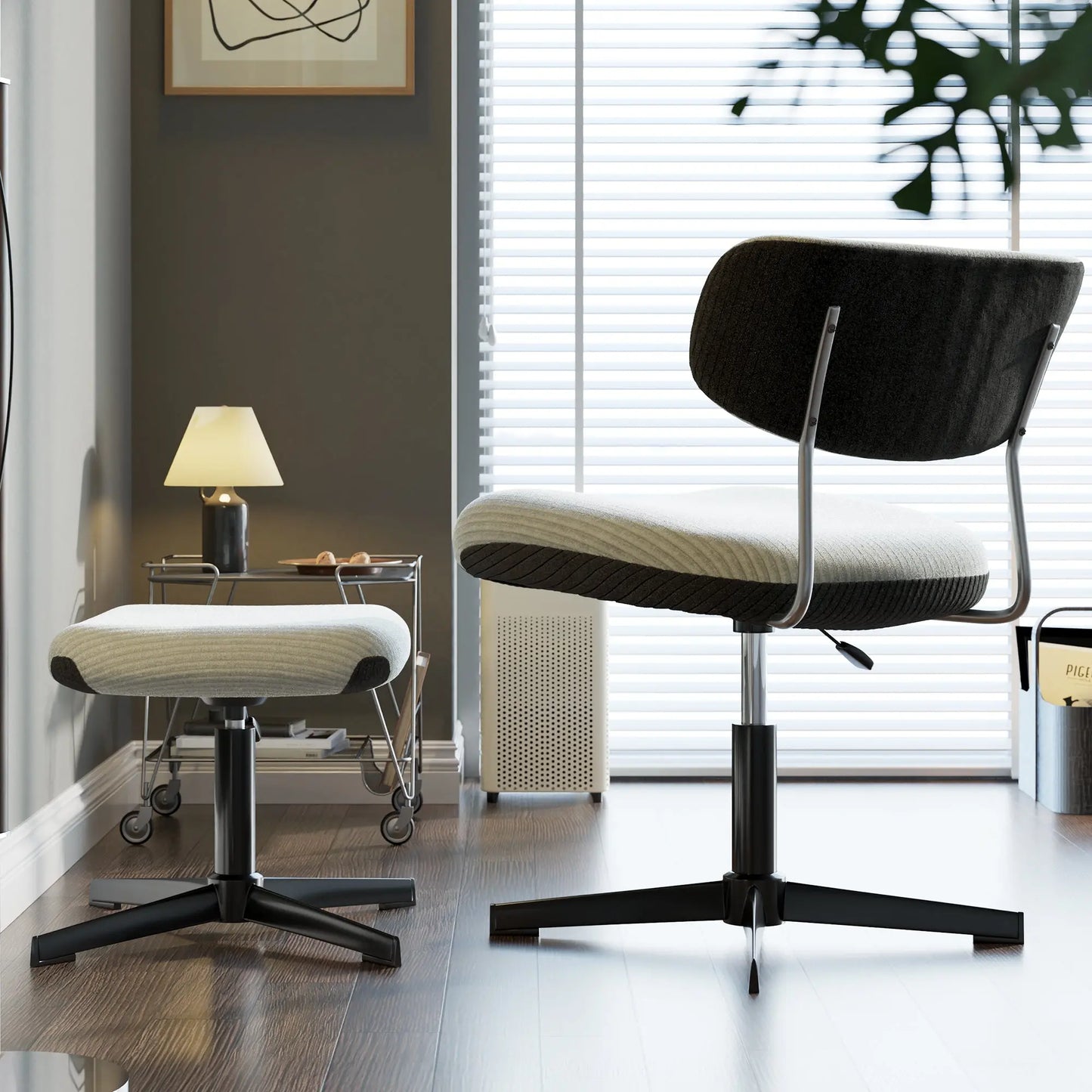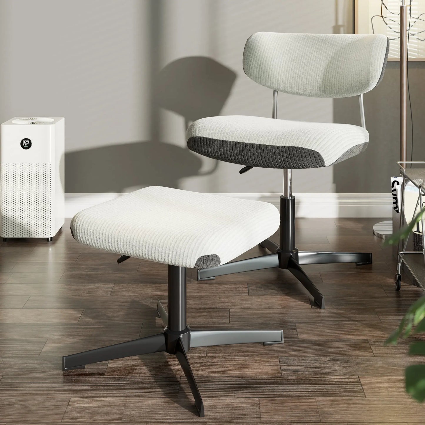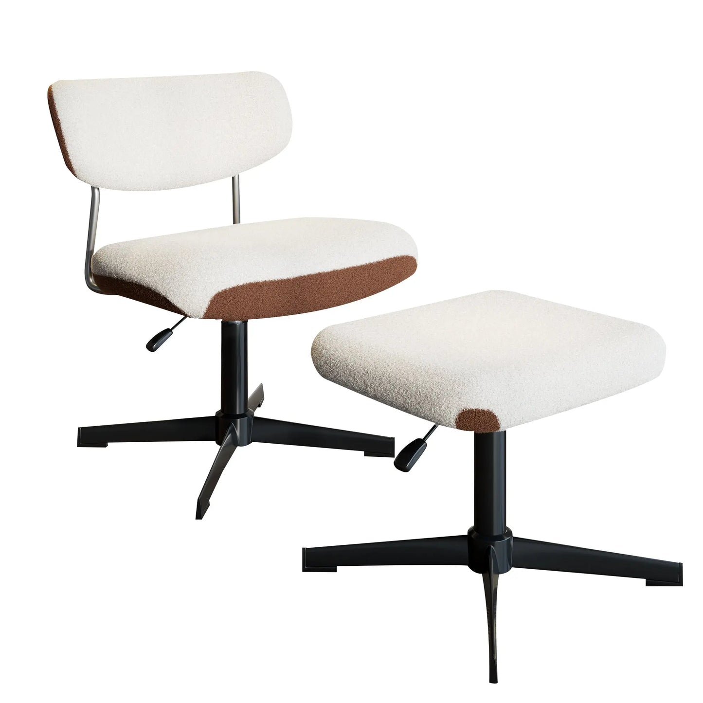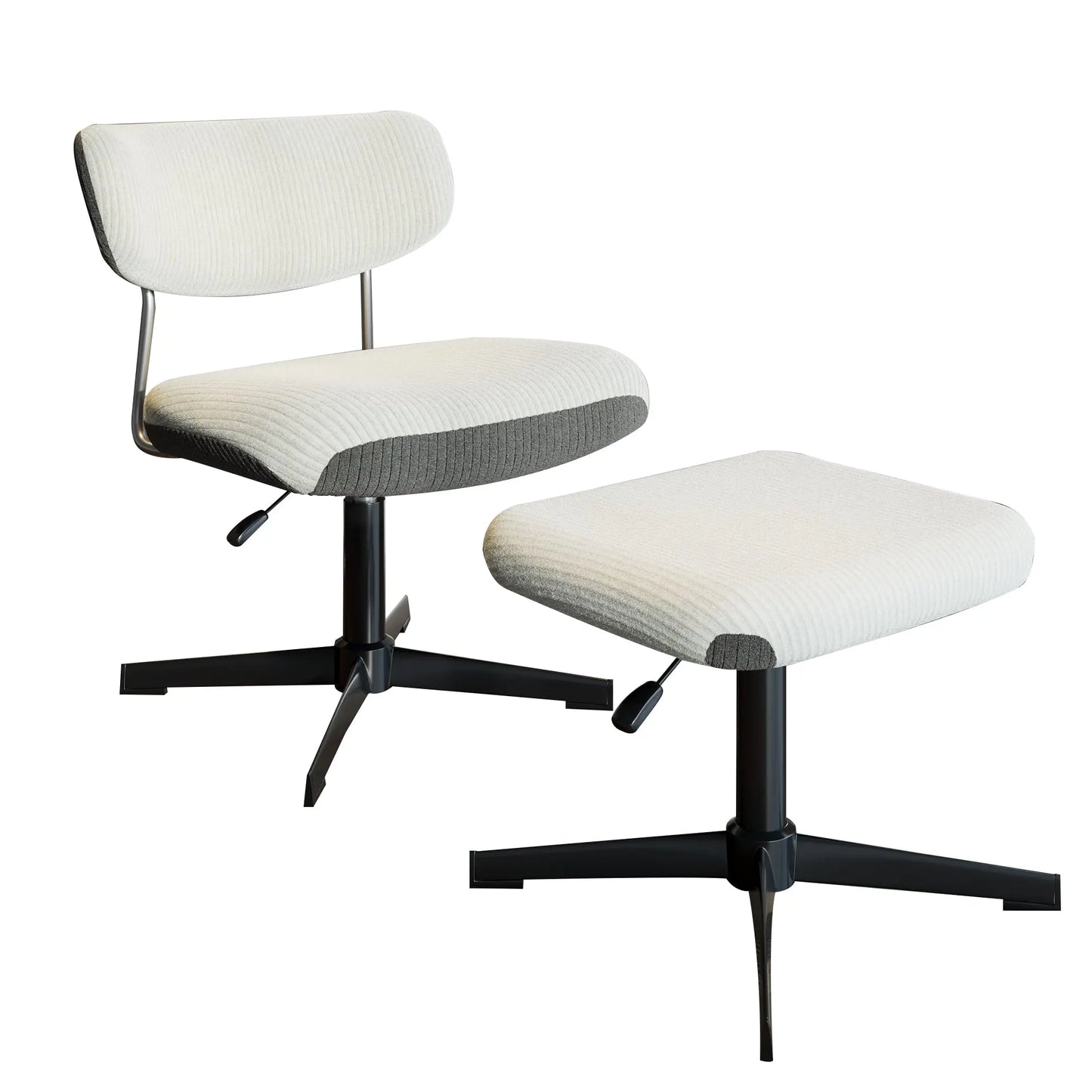 Cumulus swivel armless ergonomic chair with an ottoman set featuring an "S"-shaped backrest designed to support the spine's natural curve, reducing lower back strain. Its adjustable seat height allows users to customize their seating position for optimal comfort. The chair's 360-degree swivel base facilitates effortless movement around the workspace. With an armless design, it promotes unrestricted movement and comfortable sitting postures. Both the chair and ottoman are padded with high-density sponge and upholstered in soft fabric, providing plush comfort for extended periods. Reinforced stitching ensures durability, while the ottoman serves as a footrest, promoting circulation and reducing fatigue during long periods of use.