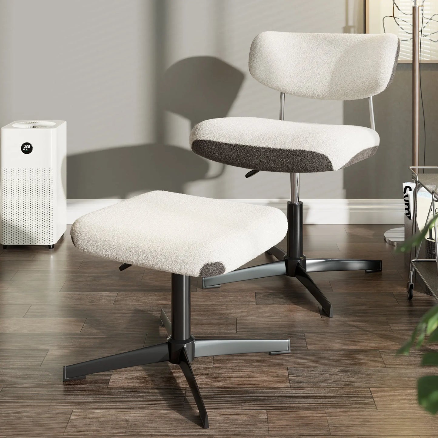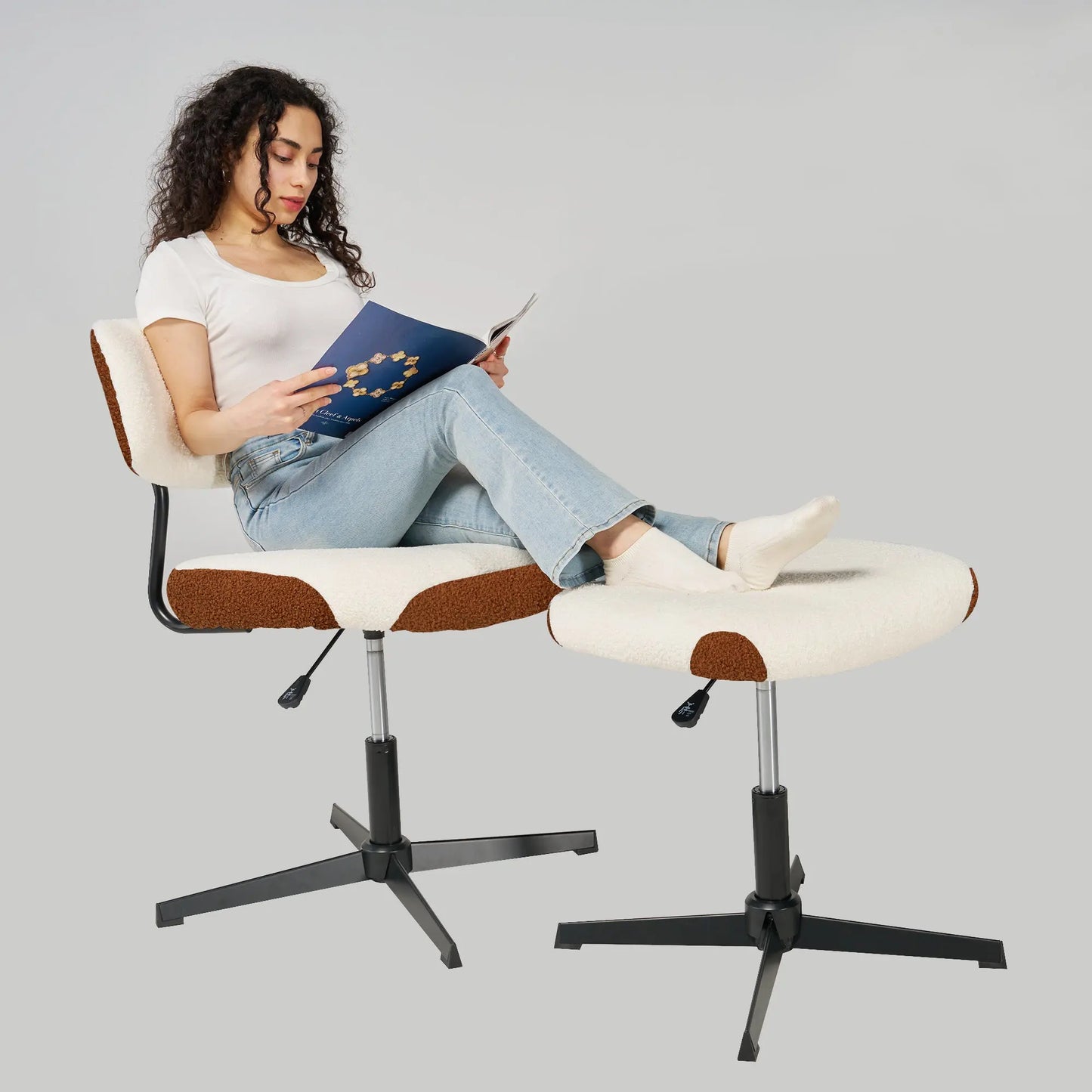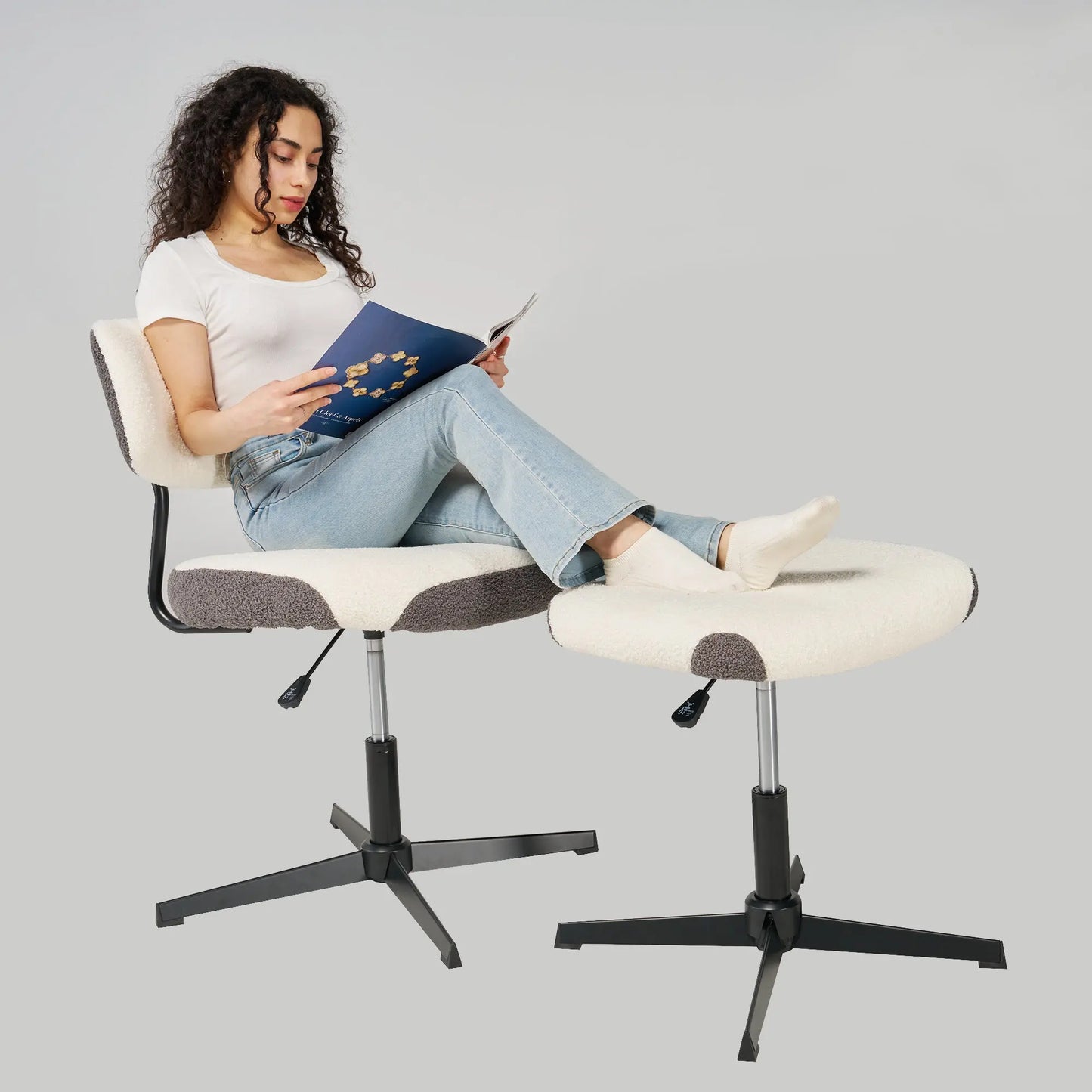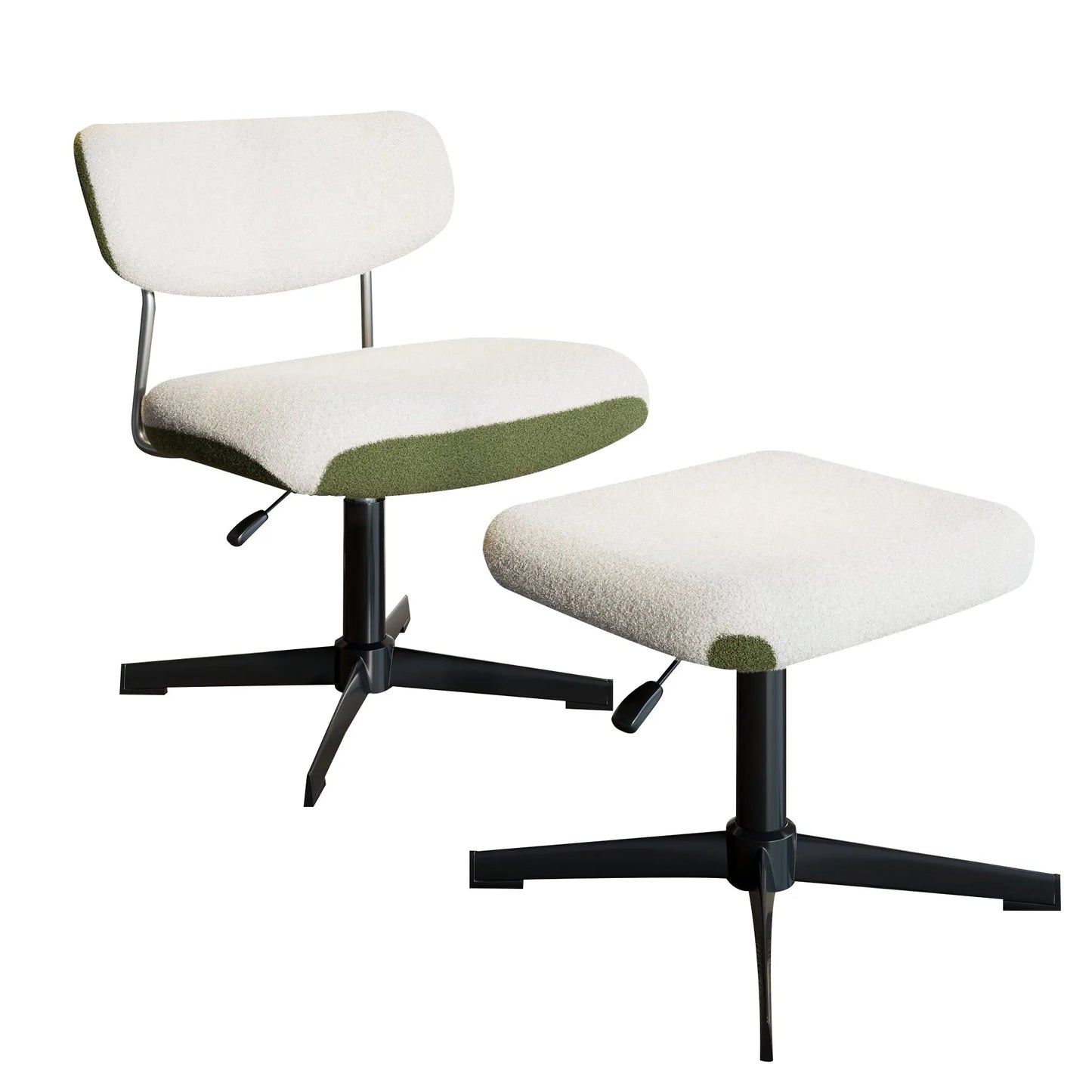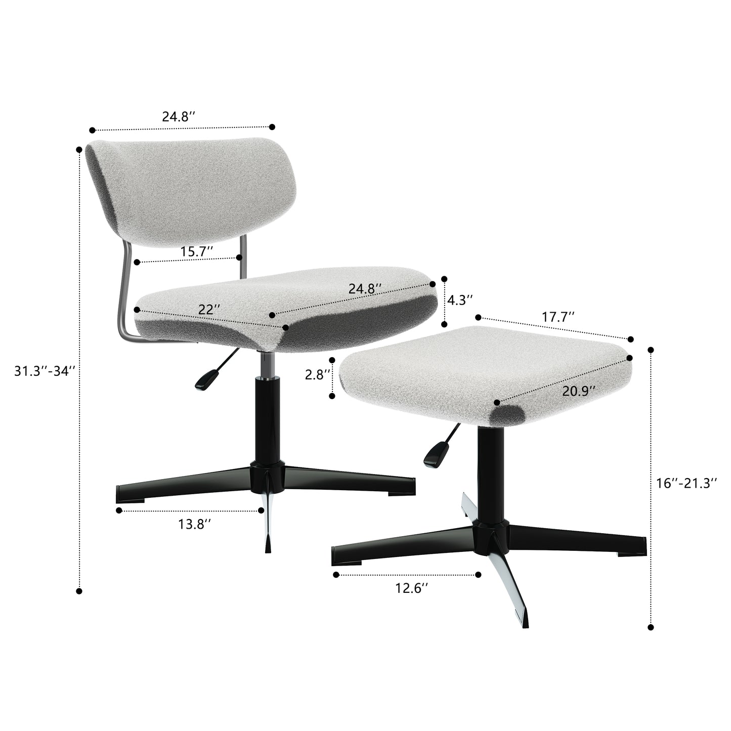 Cumulus swivel armless ergonomic chair with an ottoman set featuring an "S"-shaped backrest designed to support the spine's natural curve, reducing lower back strain. Its adjustable seat height allows users to customize their seating position for optimal comfort. The chair's 360-degree swivel base facilitates effortless movement around the workspace. With an armless design, it promotes unrestricted movement and comfortable sitting postures. Both the chair and ottoman are padded with high-density sponge and upholstered in soft fabric, providing plush comfort for extended periods. Reinforced stitching ensures durability, while the ottoman serves as a footrest, promoting circulation and reducing fatigue during long periods of use.