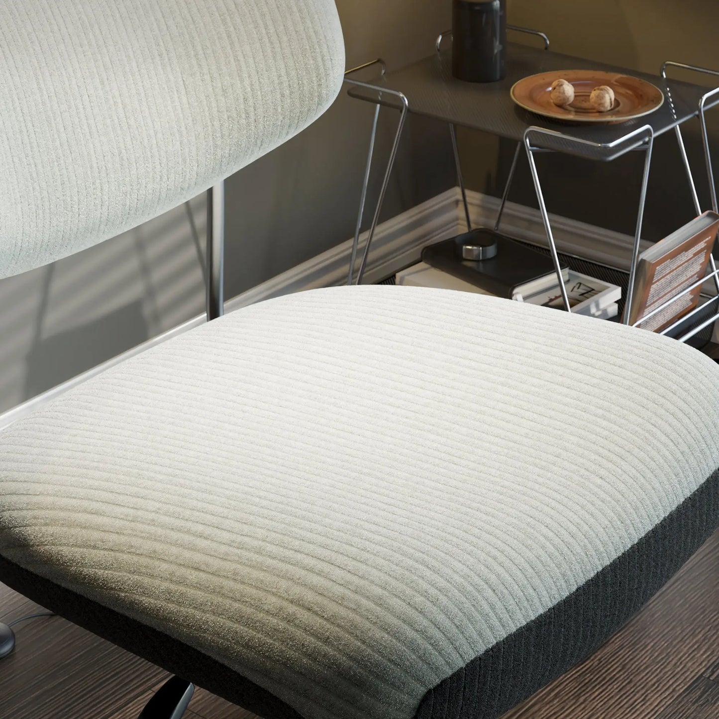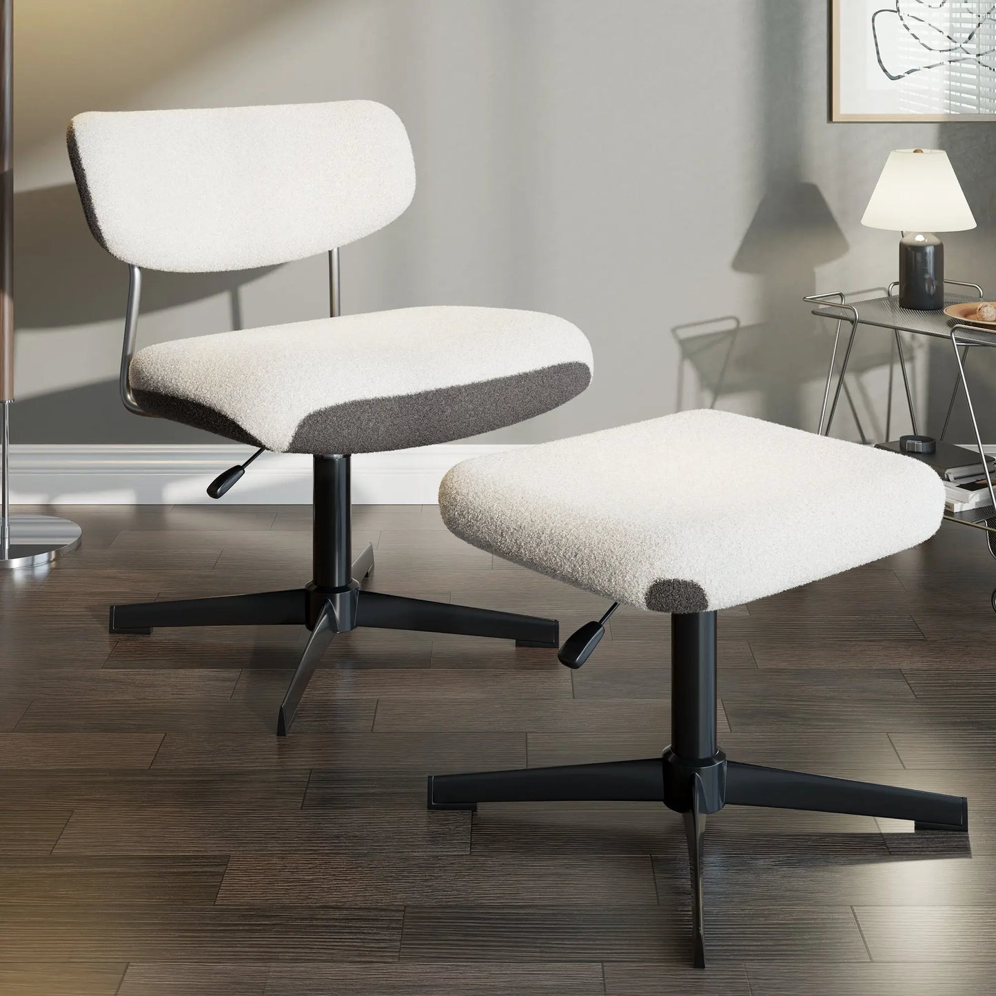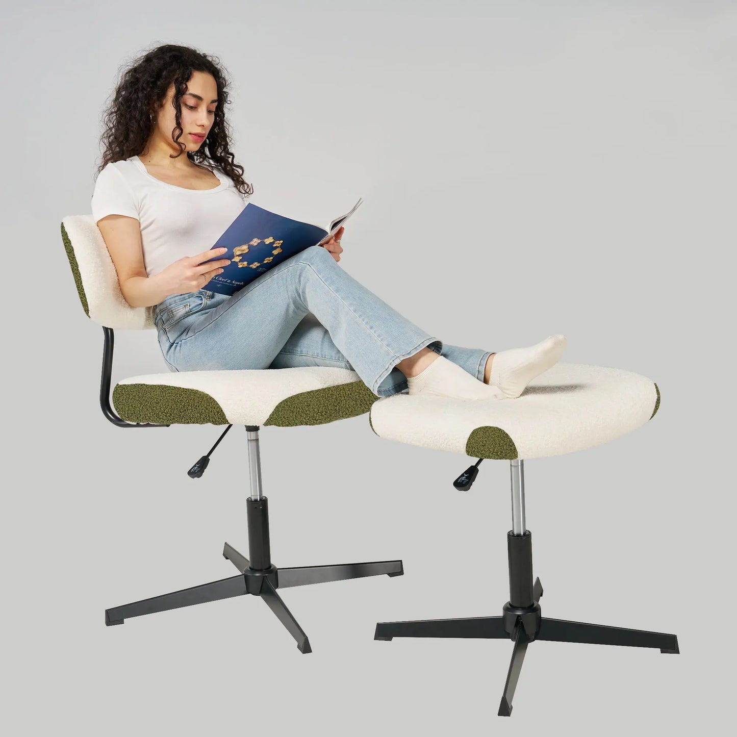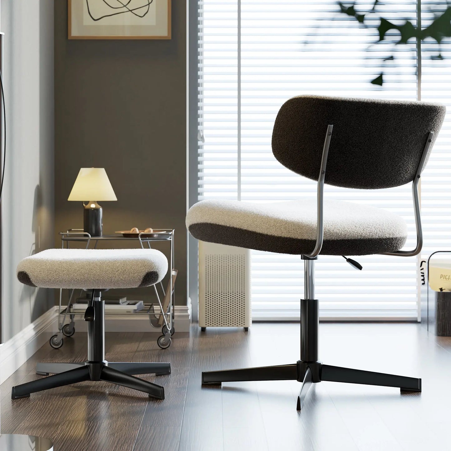 Cumulus swivel armless ergonomic chair with an ottoman set featuring an "S"-shaped backrest designed to support the spine's natural curve, reducing lower back strain. Its adjustable seat height allows users to customize their seating position for optimal comfort. The chair's 360-degree swivel base facilitates effortless movement around the workspace. With an armless design, it promotes unrestricted movement and comfortable sitting postures. Both the chair and ottoman are padded with high-density sponge and upholstered in soft fabric, providing plush comfort for extended periods. Reinforced stitching ensures durability, while the ottoman serves as a footrest, promoting circulation and reducing fatigue during long periods of use.