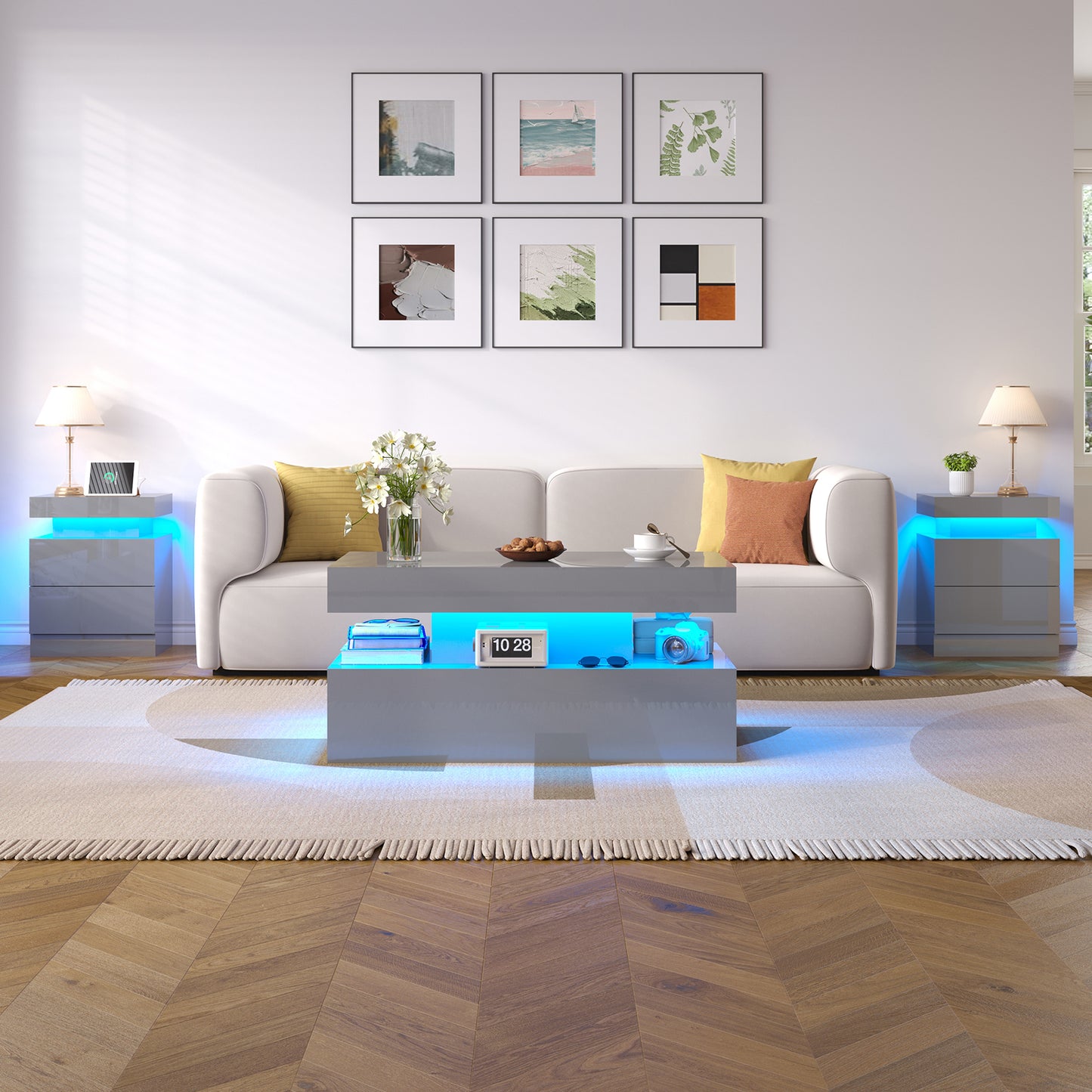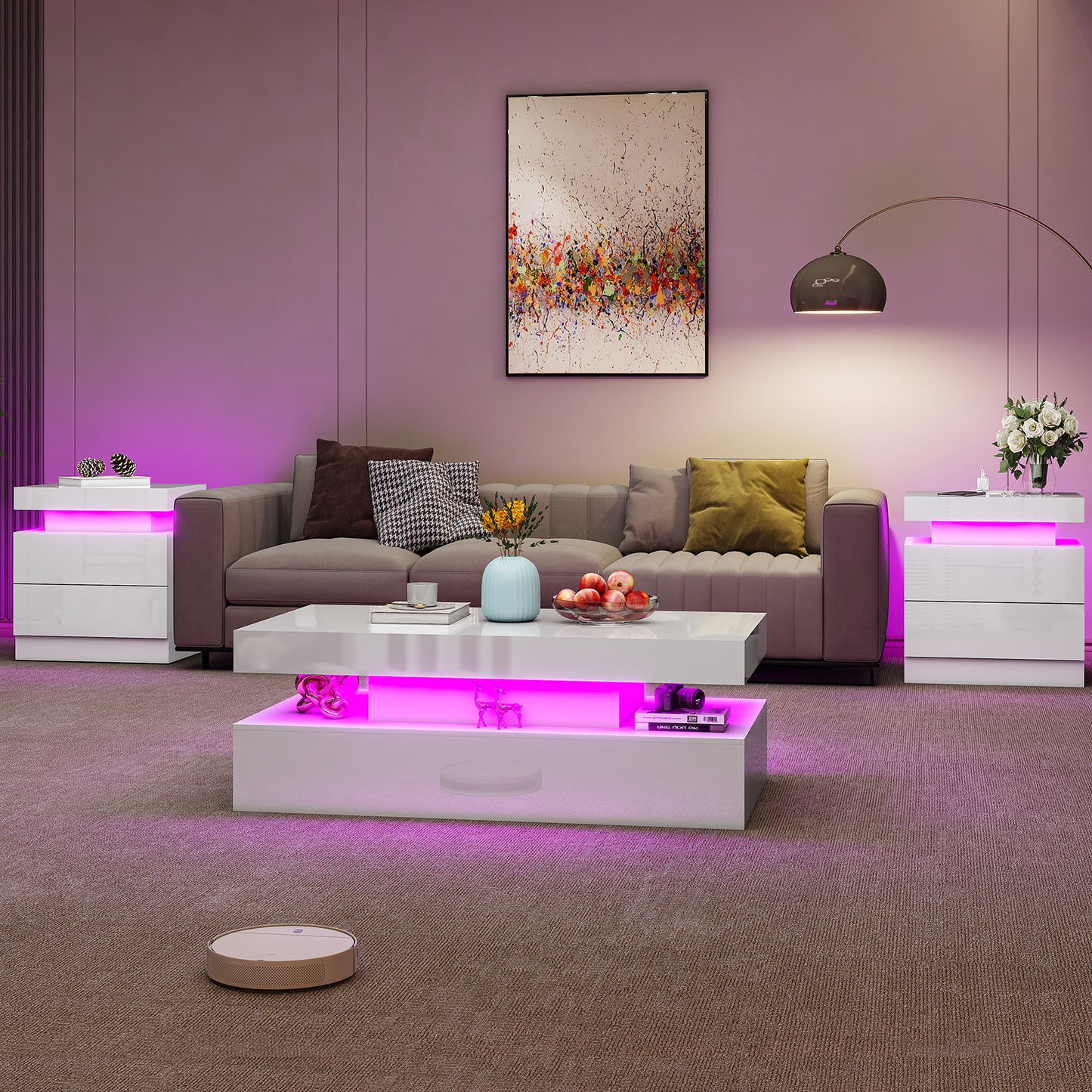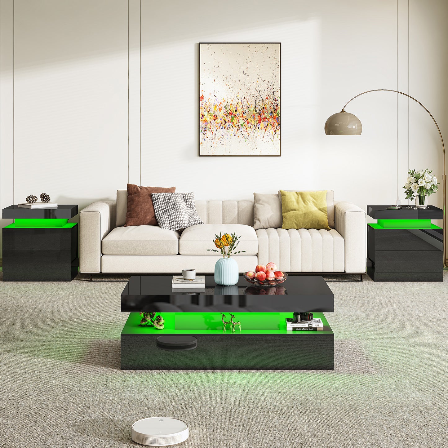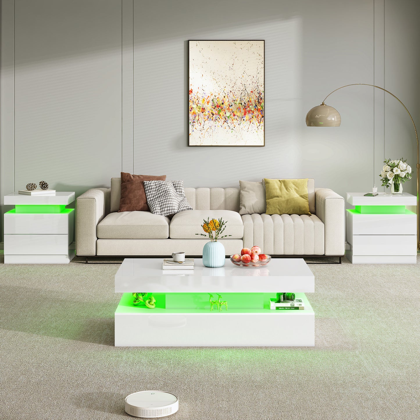 The Dimmesdale Coffee Table brings modern sophistication and functionality to your living space. With a UV high gloss finish and wood grain design, it features adjustable LED lighting with over 60,000 colors and dynamic modes controlled via remote or app. This 40-inch rectangular table offers a spacious tabletop, an open middle storage area, and a sturdy design supporting up to 220 lbs. Its minimalist aesthetic pairs seamlessly with sofas, TV stands, and various decor styles. Easy to assemble with clear instructions, it’s part of AMERLIFE’s complete matching furniture collection for a cohesive home experience.