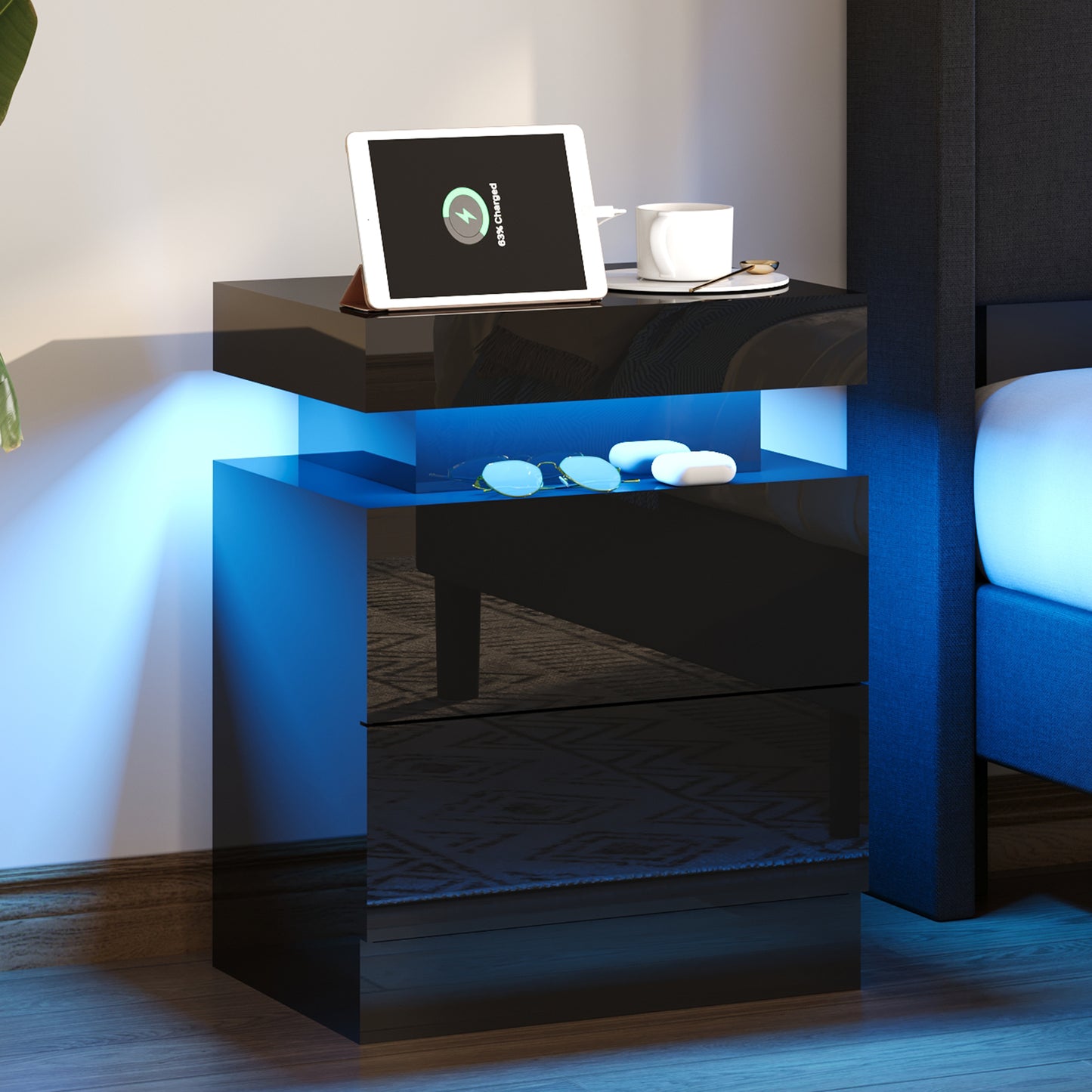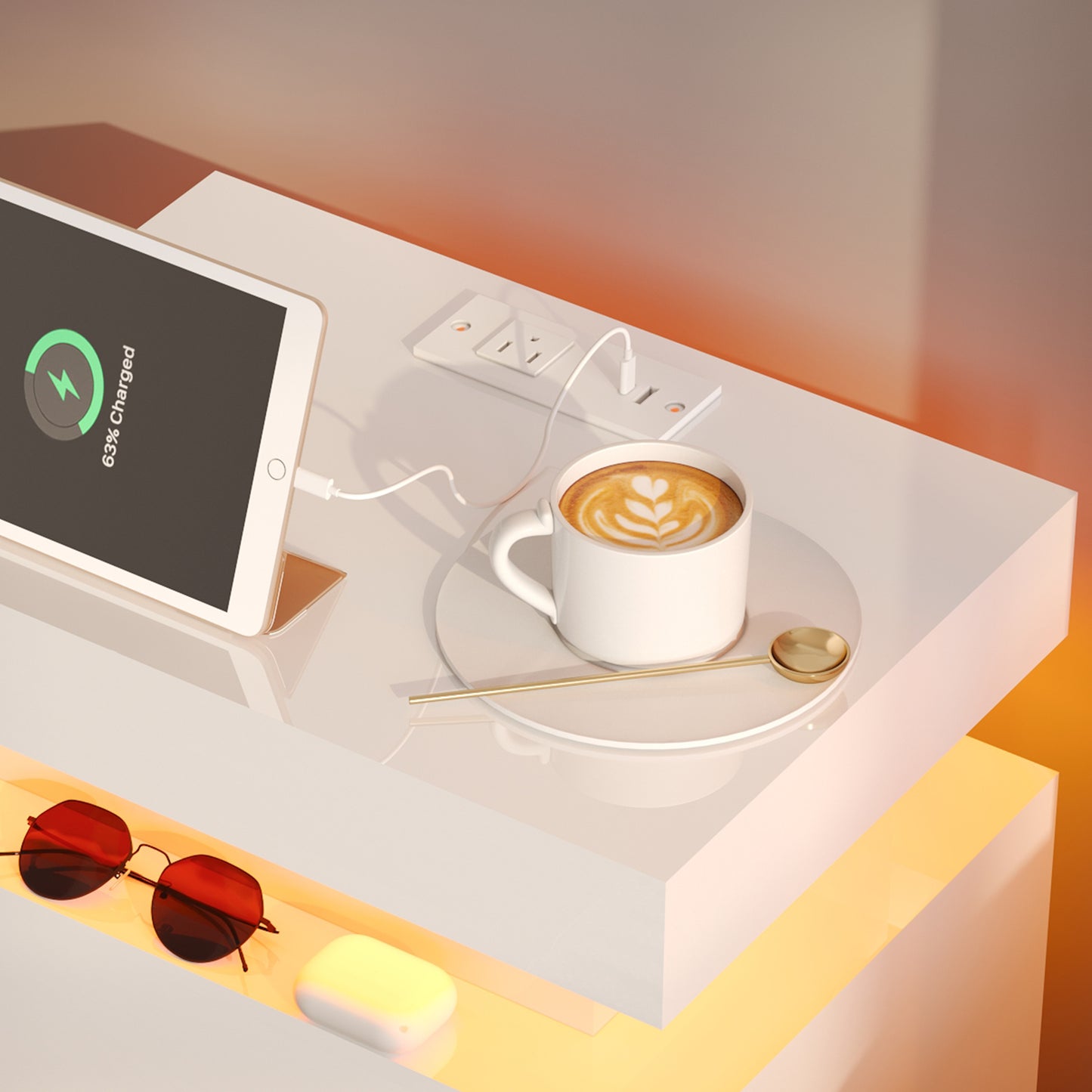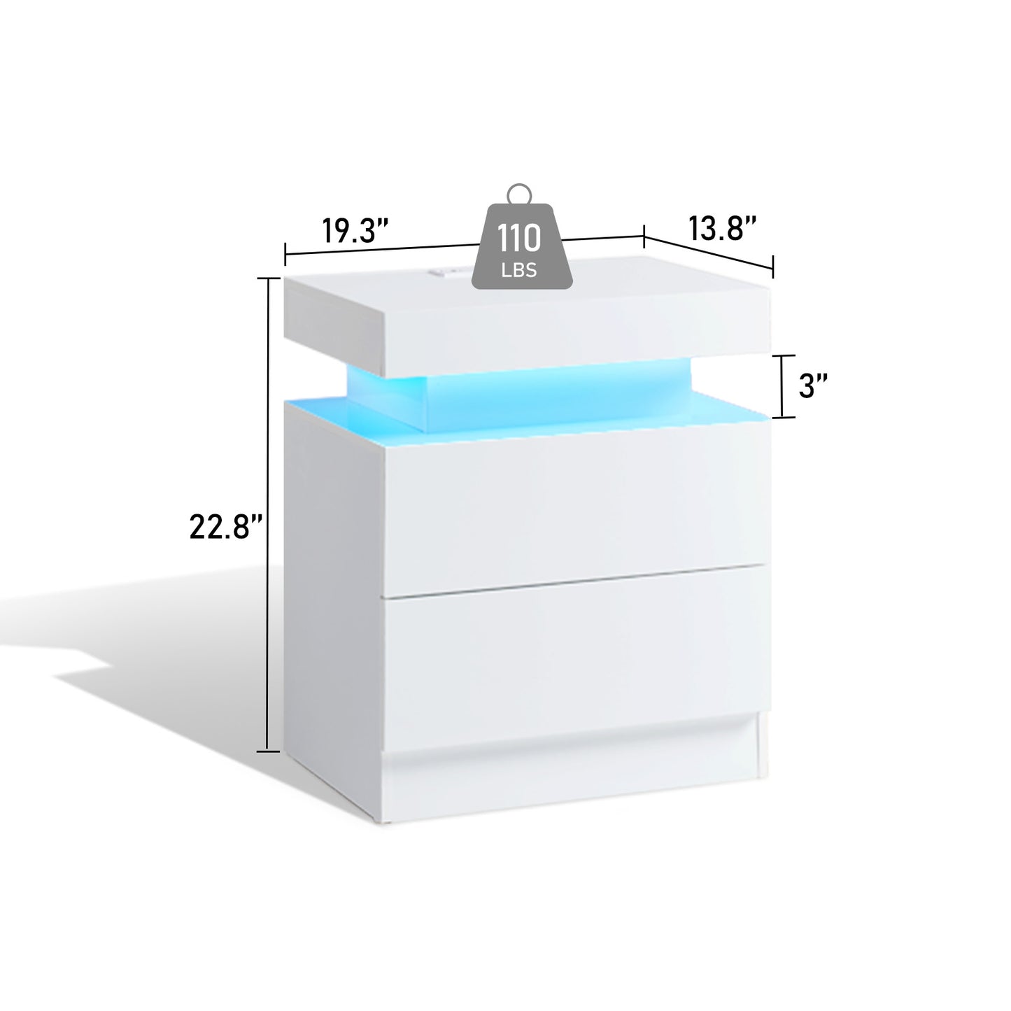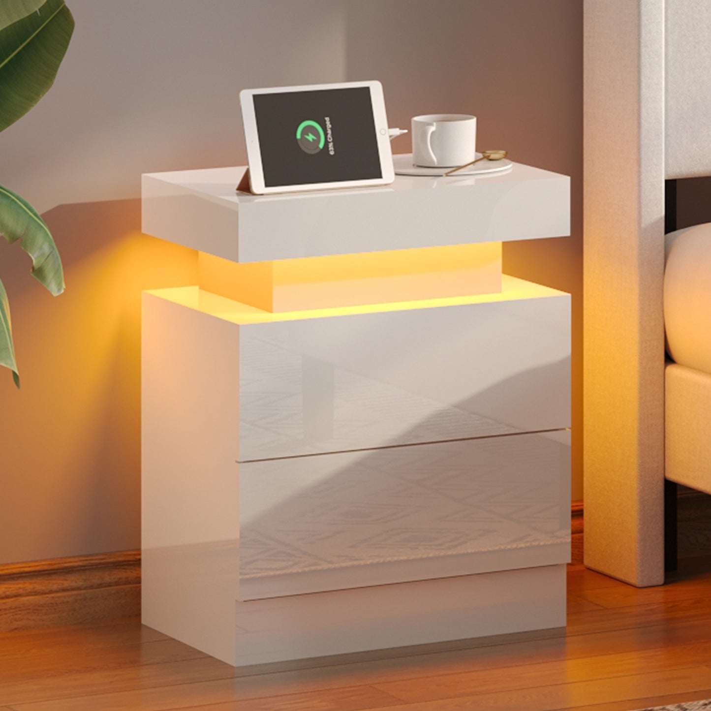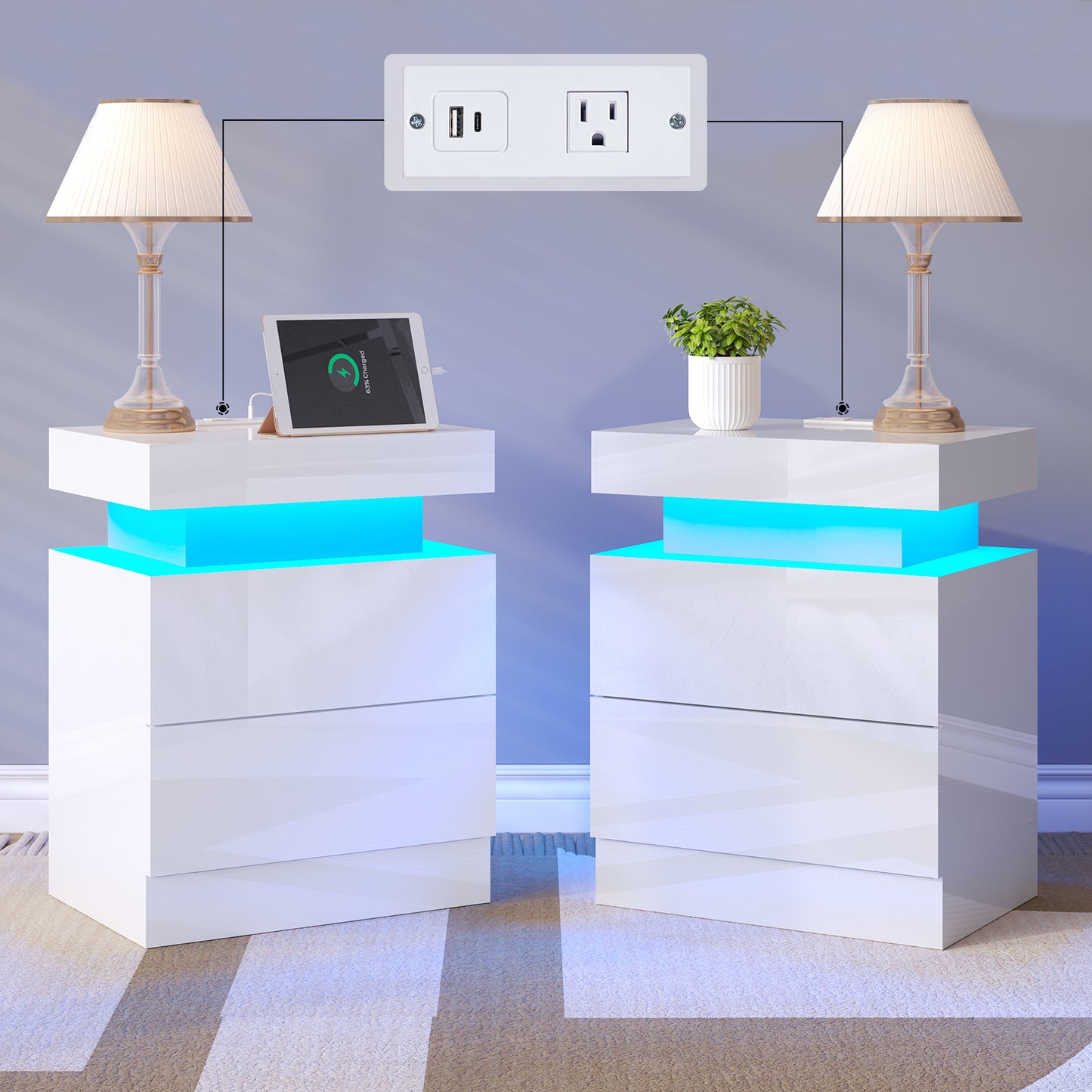 The Dimmesdale End-Table LED High Gloss is a sleek and modern nightstand set of two that effortlessly enhances any interior decor with its UV high gloss paint and wood grain surface. Featuring built-in LED lights with over 60,000 colors and multiple dynamic modes adjustable via remote or app, it lets you create the perfect ambiance for your space. Equipped with a convenient charging station, including a power outlet, USB, and Type-C ports, it keeps your devices powered at all times. With two spacious sliding drawers and a two-tier open storage area, this 22.8-inch tall table is ideal for bedrooms or living rooms. Easy to assemble with clear instructions, it pairs seamlessly with matching furniture from AMERLIFE for a cohesive home decor experience.