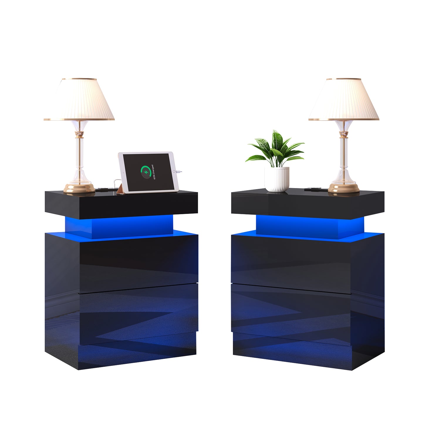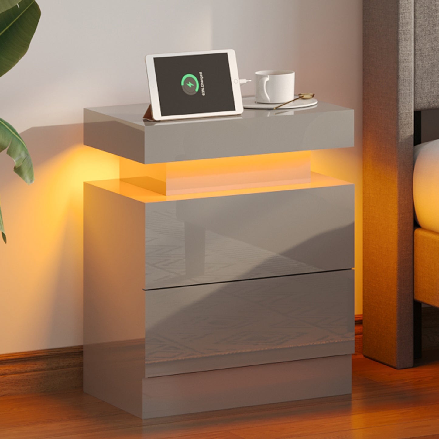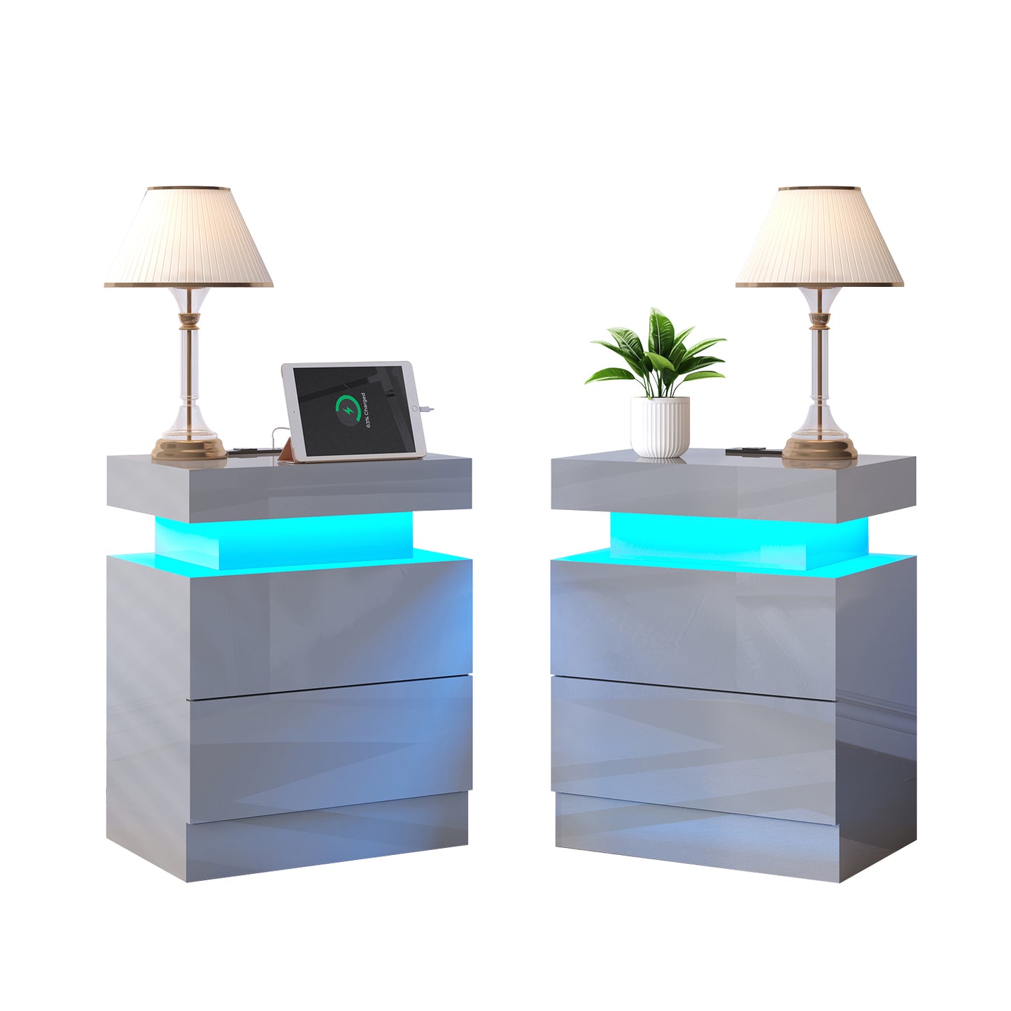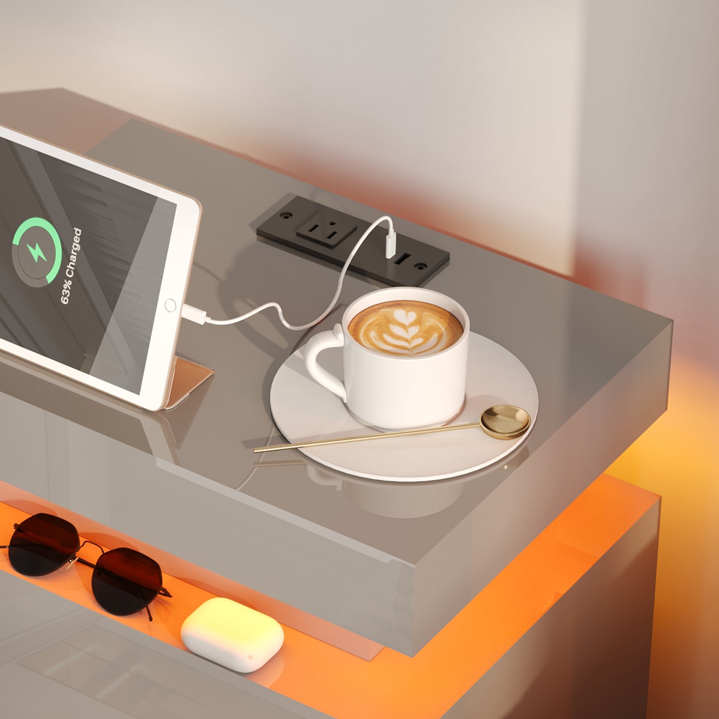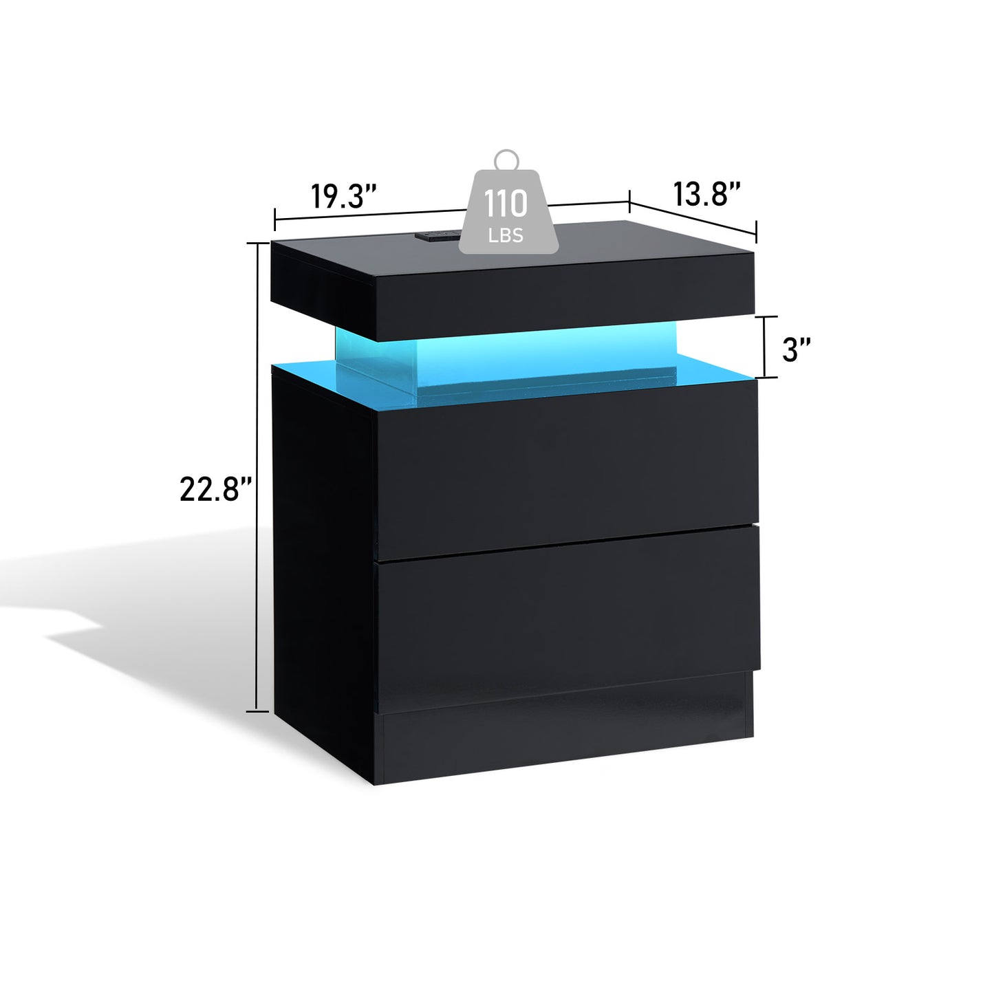 The Dimmesdale End-Table LED High Gloss is a sleek and modern nightstand set of two that effortlessly enhances any interior decor with its UV high gloss paint and wood grain surface. Featuring built-in LED lights with over 60,000 colors and multiple dynamic modes adjustable via remote or app, it lets you create the perfect ambiance for your space. Equipped with a convenient charging station, including a power outlet, USB, and Type-C ports, it keeps your devices powered at all times. With two spacious sliding drawers and a two-tier open storage area, this 22.8-inch tall table is ideal for bedrooms or living rooms. Easy to assemble with clear instructions, it pairs seamlessly with matching furniture from AMERLIFE for a cohesive home decor experience.