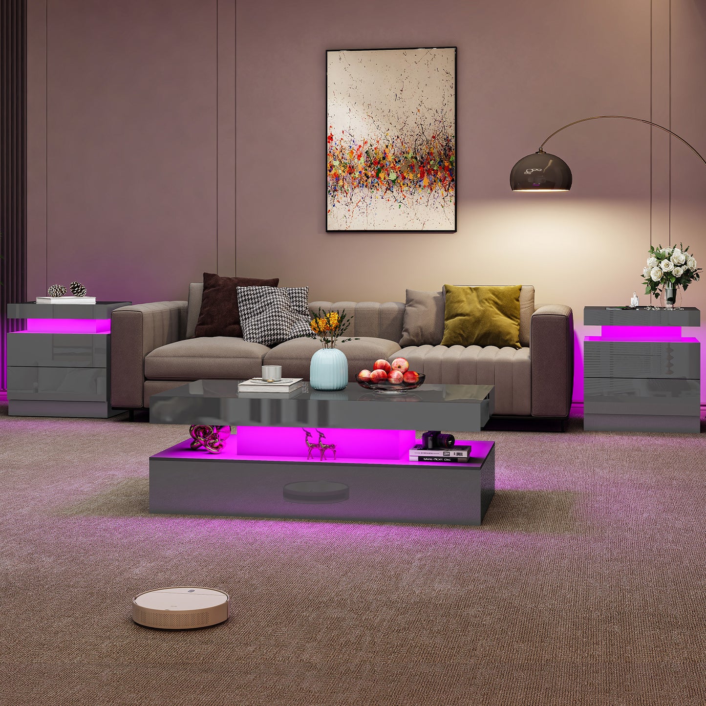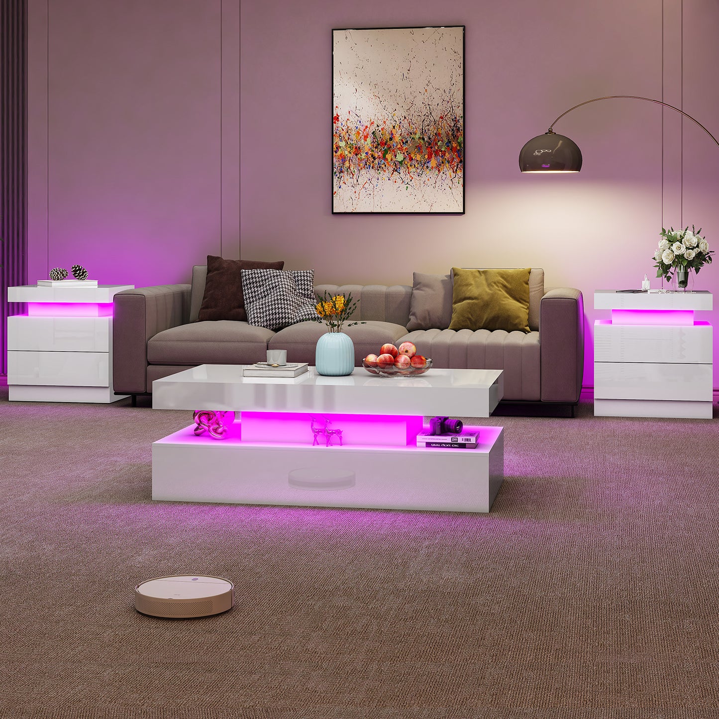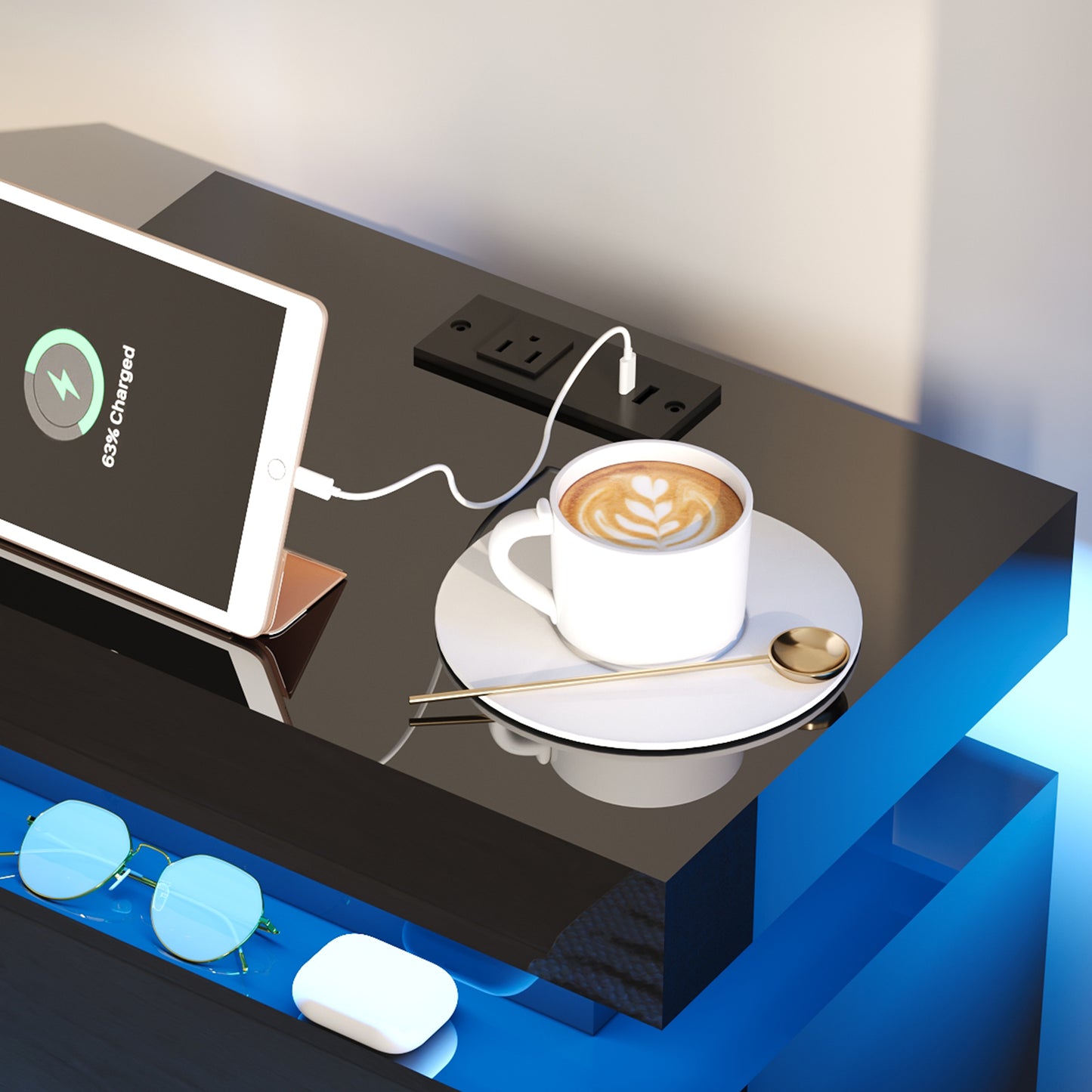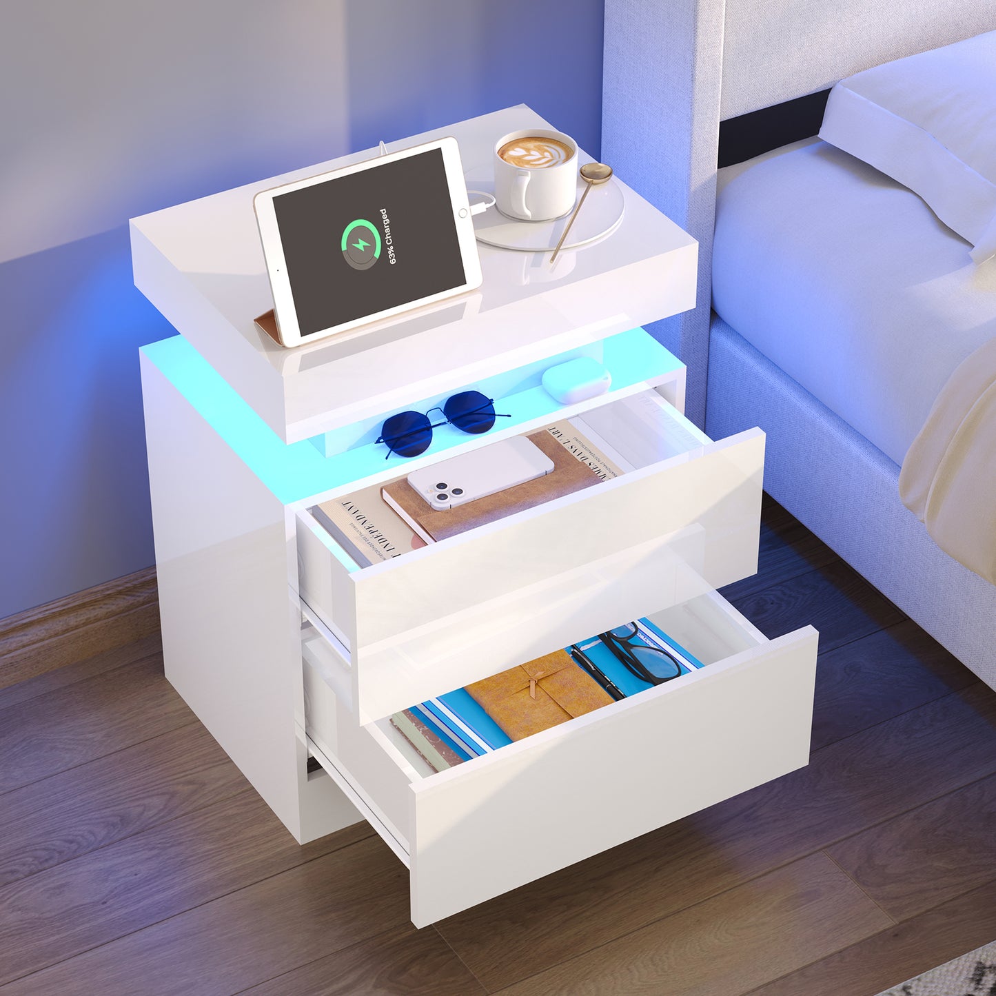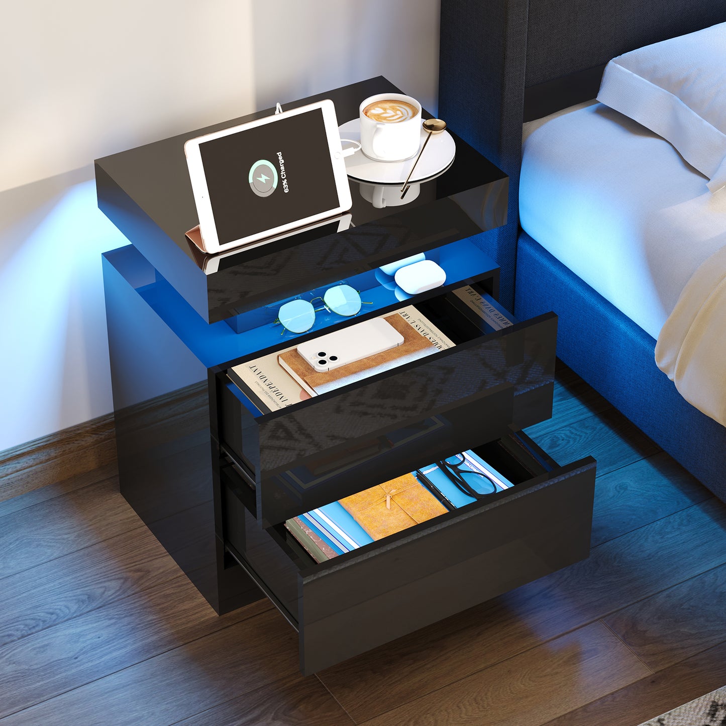 The Dimmesdale End-Table LED High Gloss is a sleek and modern nightstand set of two that effortlessly enhances any interior decor with its UV high gloss paint and wood grain surface. Featuring built-in LED lights with over 60,000 colors and multiple dynamic modes adjustable via remote or app, it lets you create the perfect ambiance for your space. Equipped with a convenient charging station, including a power outlet, USB, and Type-C ports, it keeps your devices powered at all times. With two spacious sliding drawers and a two-tier open storage area, this 22.8-inch tall table is ideal for bedrooms or living rooms. Easy to assemble with clear instructions, it pairs seamlessly with matching furniture from AMERLIFE for a cohesive home decor experience.