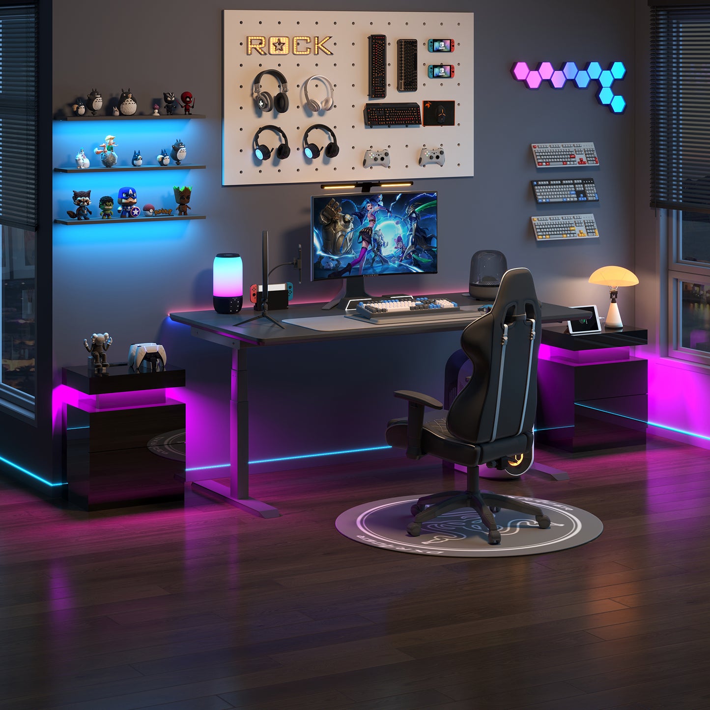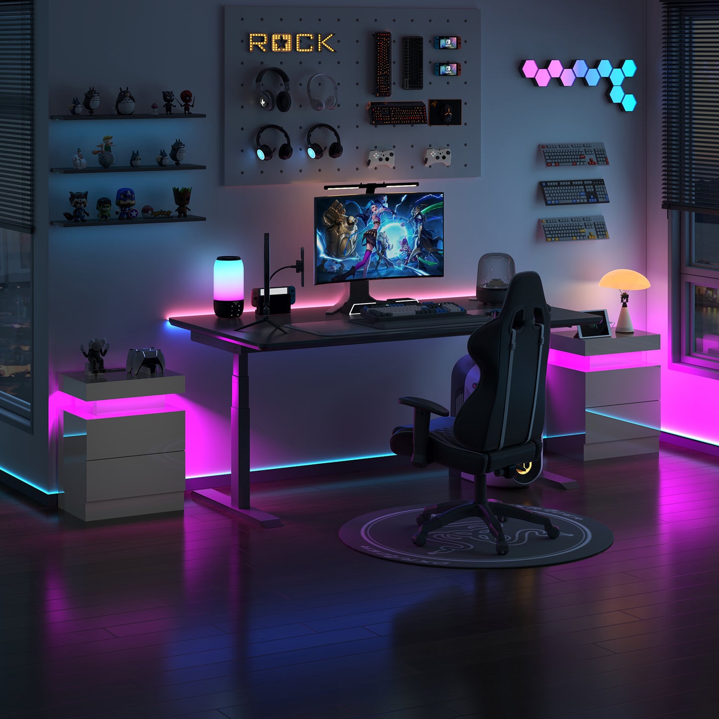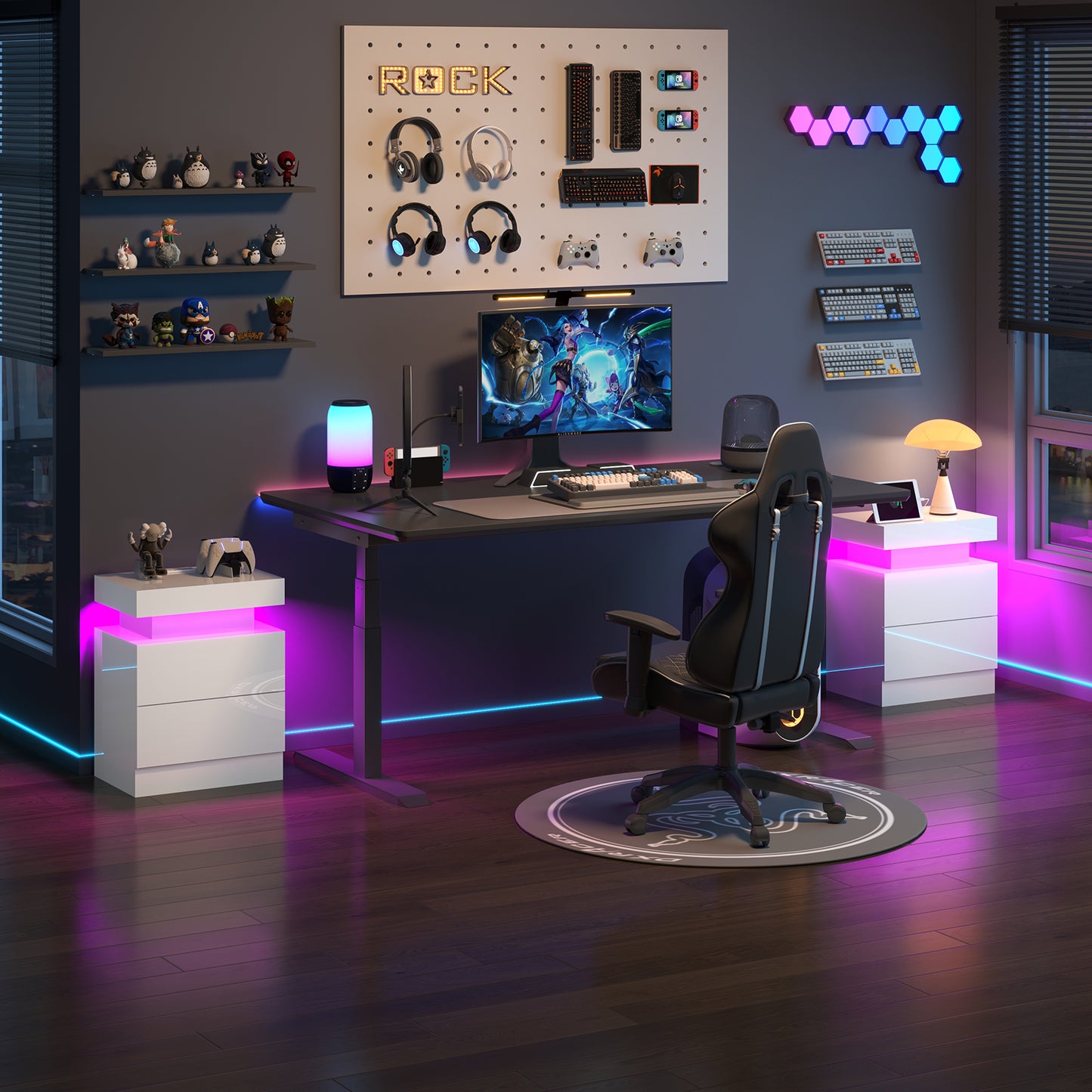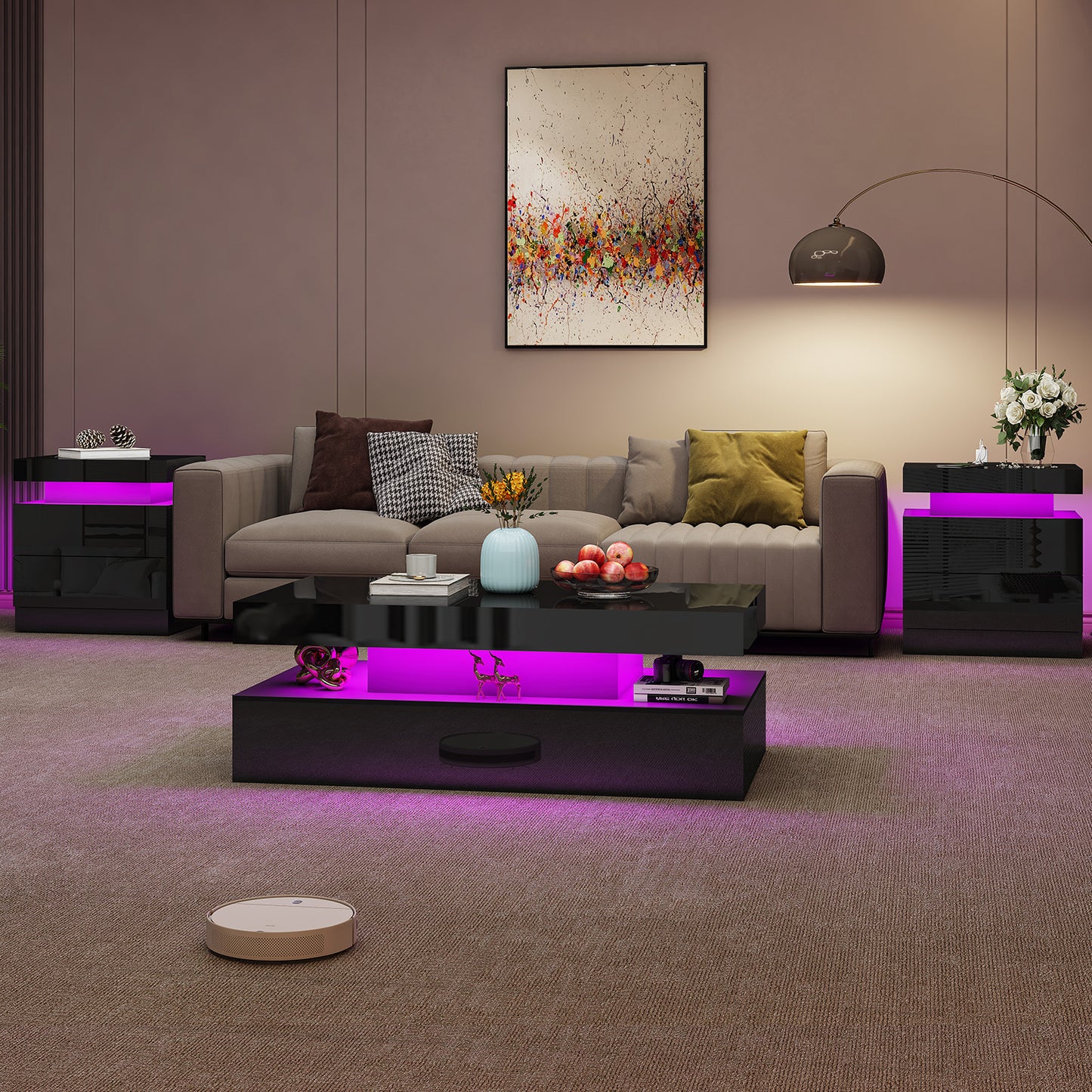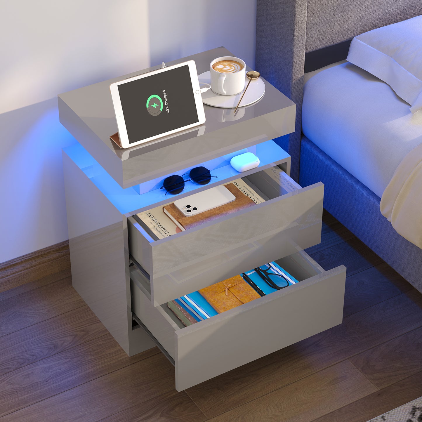 The Dimmesdale End-Table LED High Gloss is a sleek and modern nightstand set of two that effortlessly enhances any interior decor with its UV high gloss paint and wood grain surface. Featuring built-in LED lights with over 60,000 colors and multiple dynamic modes adjustable via remote or app, it lets you create the perfect ambiance for your space. Equipped with a convenient charging station, including a power outlet, USB, and Type-C ports, it keeps your devices powered at all times. With two spacious sliding drawers and a two-tier open storage area, this 22.8-inch tall table is ideal for bedrooms or living rooms. Easy to assemble with clear instructions, it pairs seamlessly with matching furniture from AMERLIFE for a cohesive home decor experience.