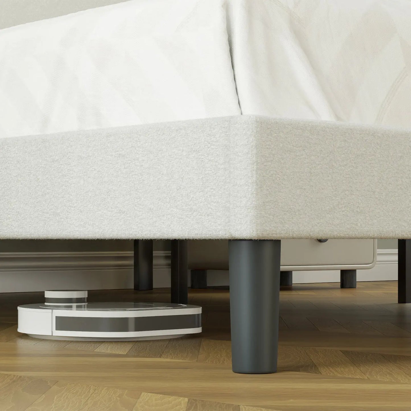 The platform bed pulls you in with its sharp simplicity & round corners, offering a sleek, sophisticated and stylish addition to your bedroom's decor with its boucle fabric cover.