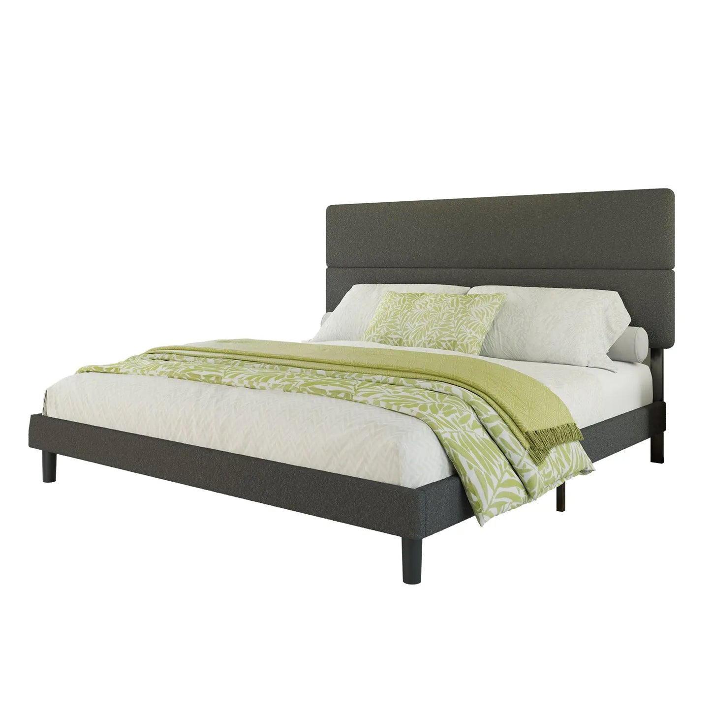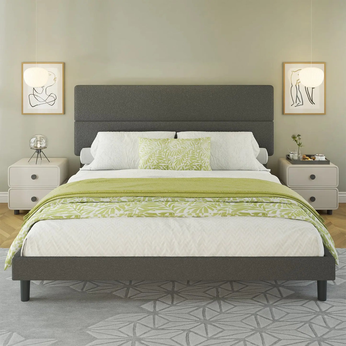 Elegant upholstered bed frame queen featuring luxurious and cozy boucle fabric, perfect for a chic and comfortable bedroom upgrade.