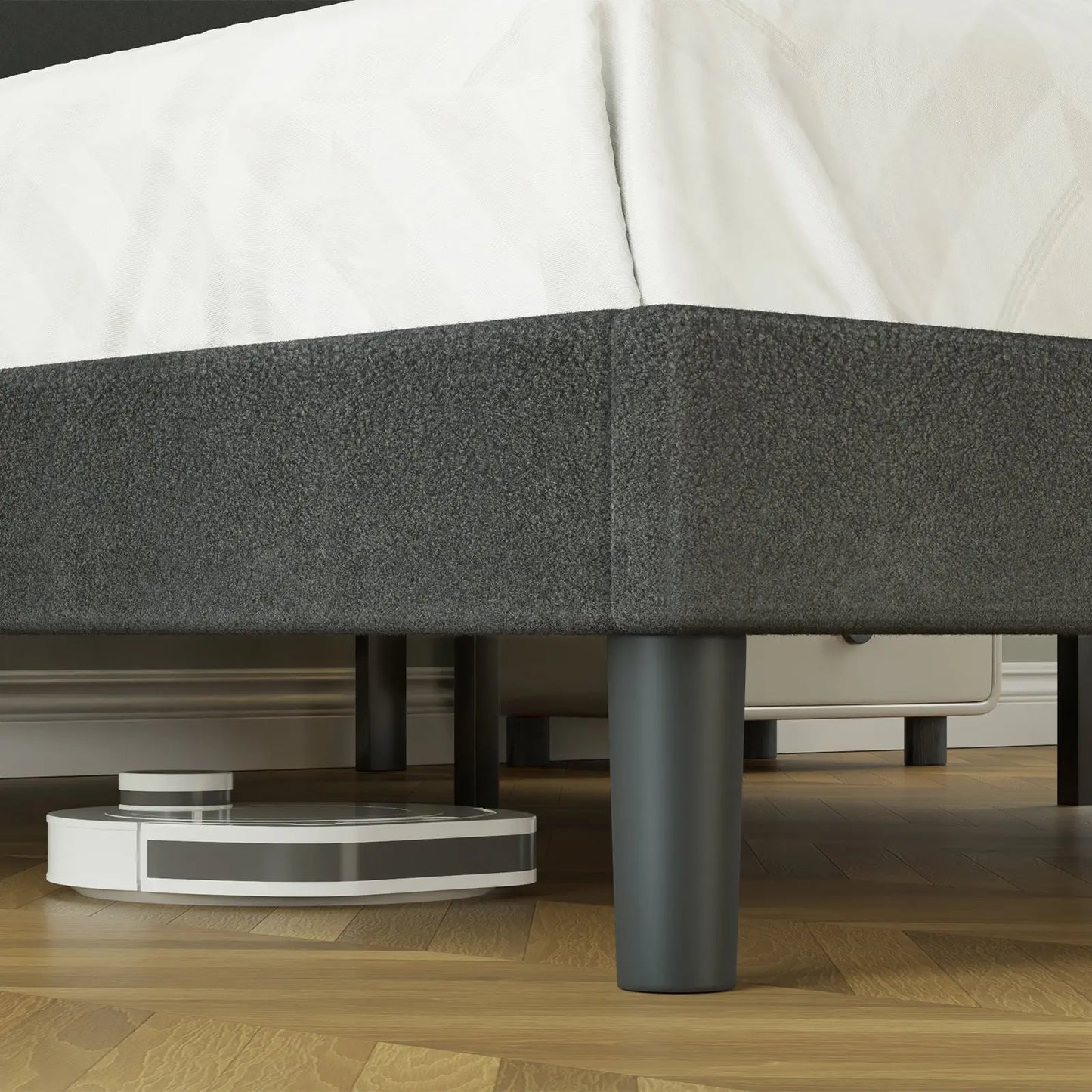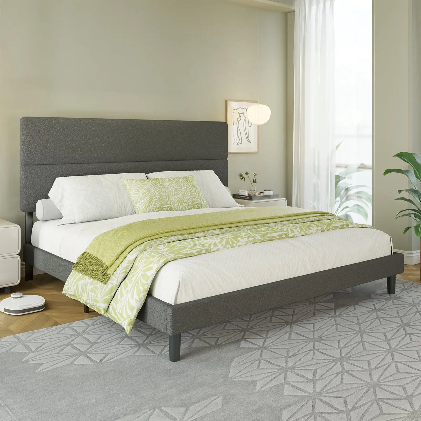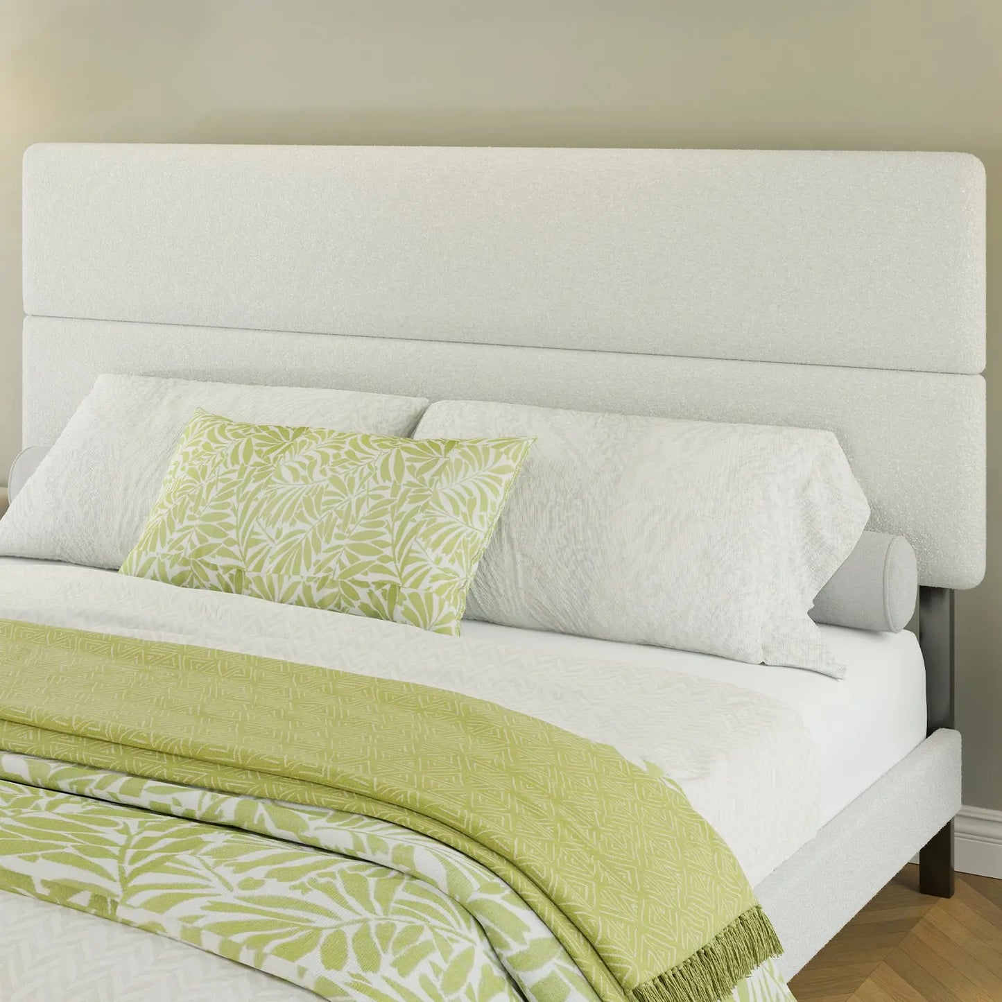 Elegant upholstered bed frame queen featuring luxurious and cozy boucle fabric, perfect for a chic and comfortable bedroom upgrade.