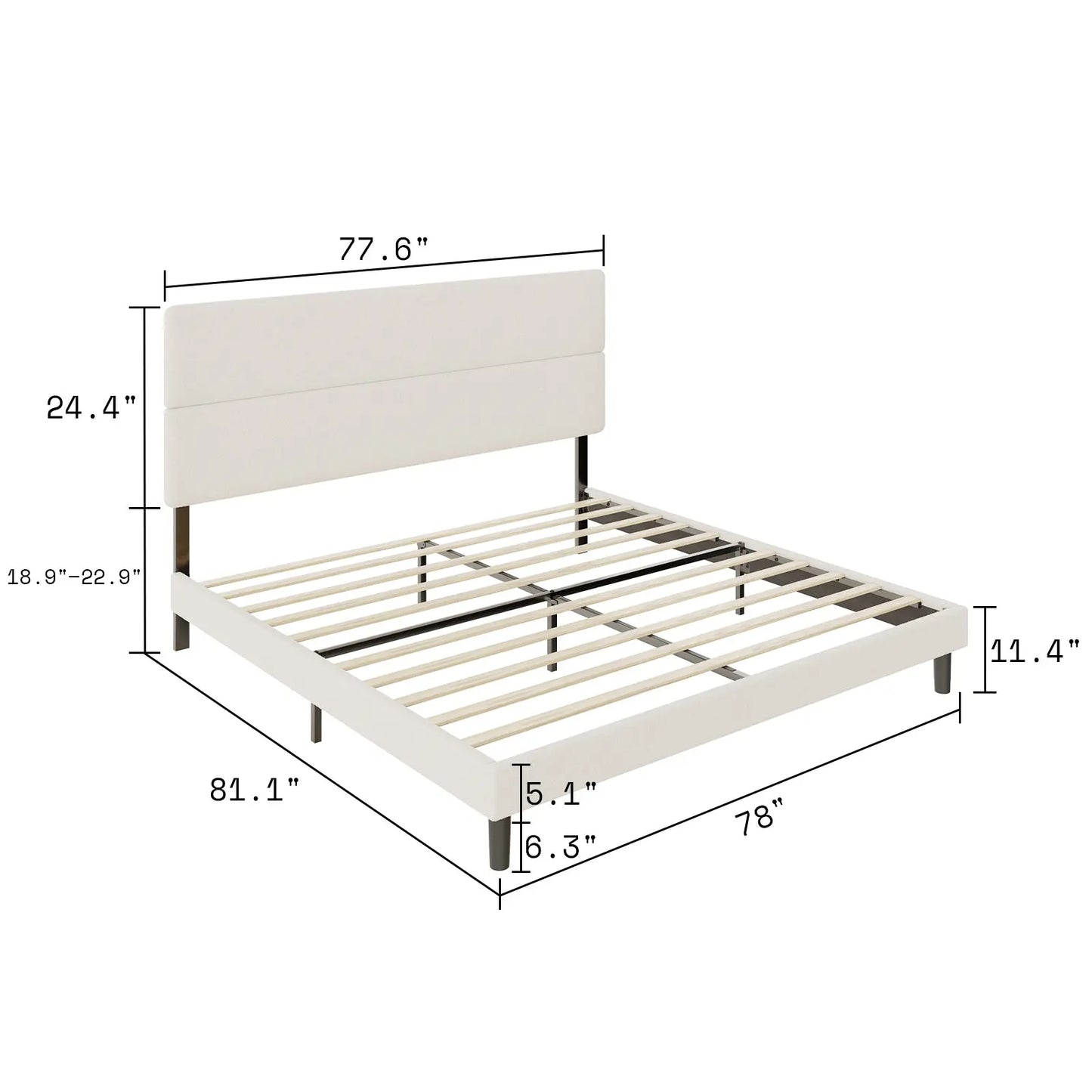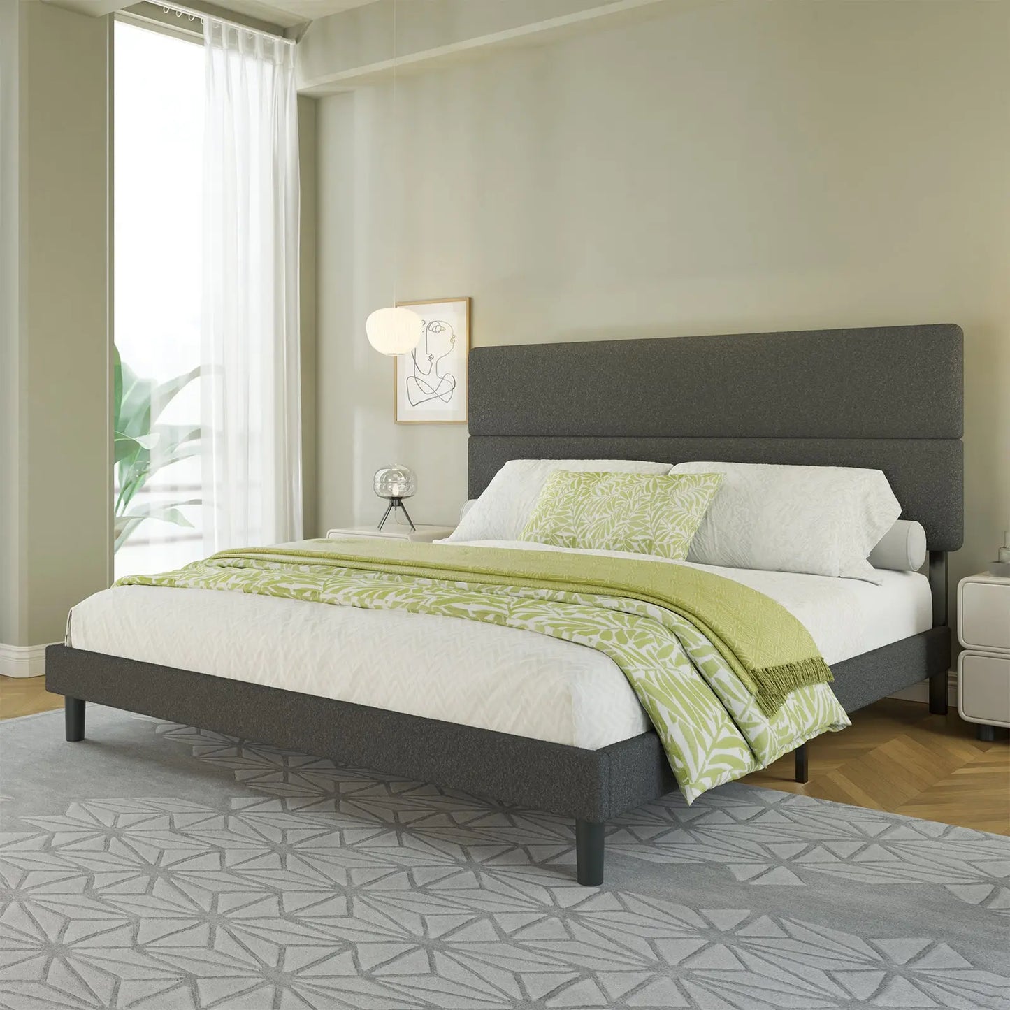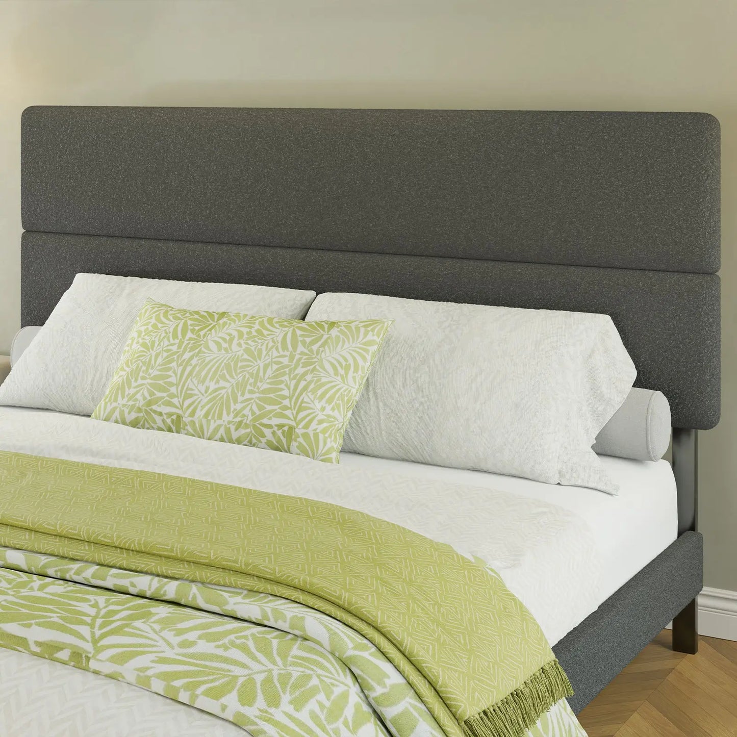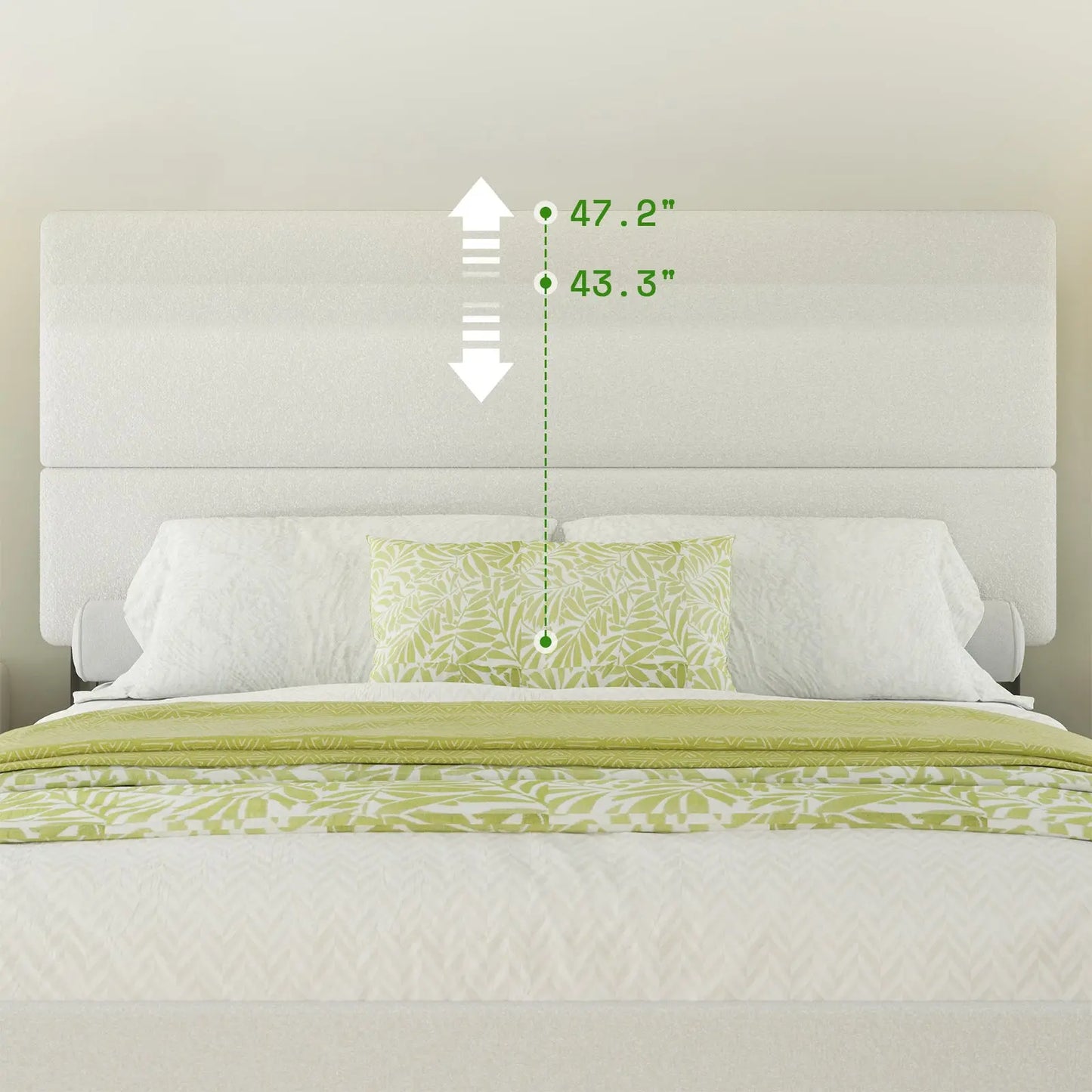 Elegant upholstered bed frame queen featuring luxurious and cozy boucle fabric, perfect for a chic and comfortable bedroom upgrade.