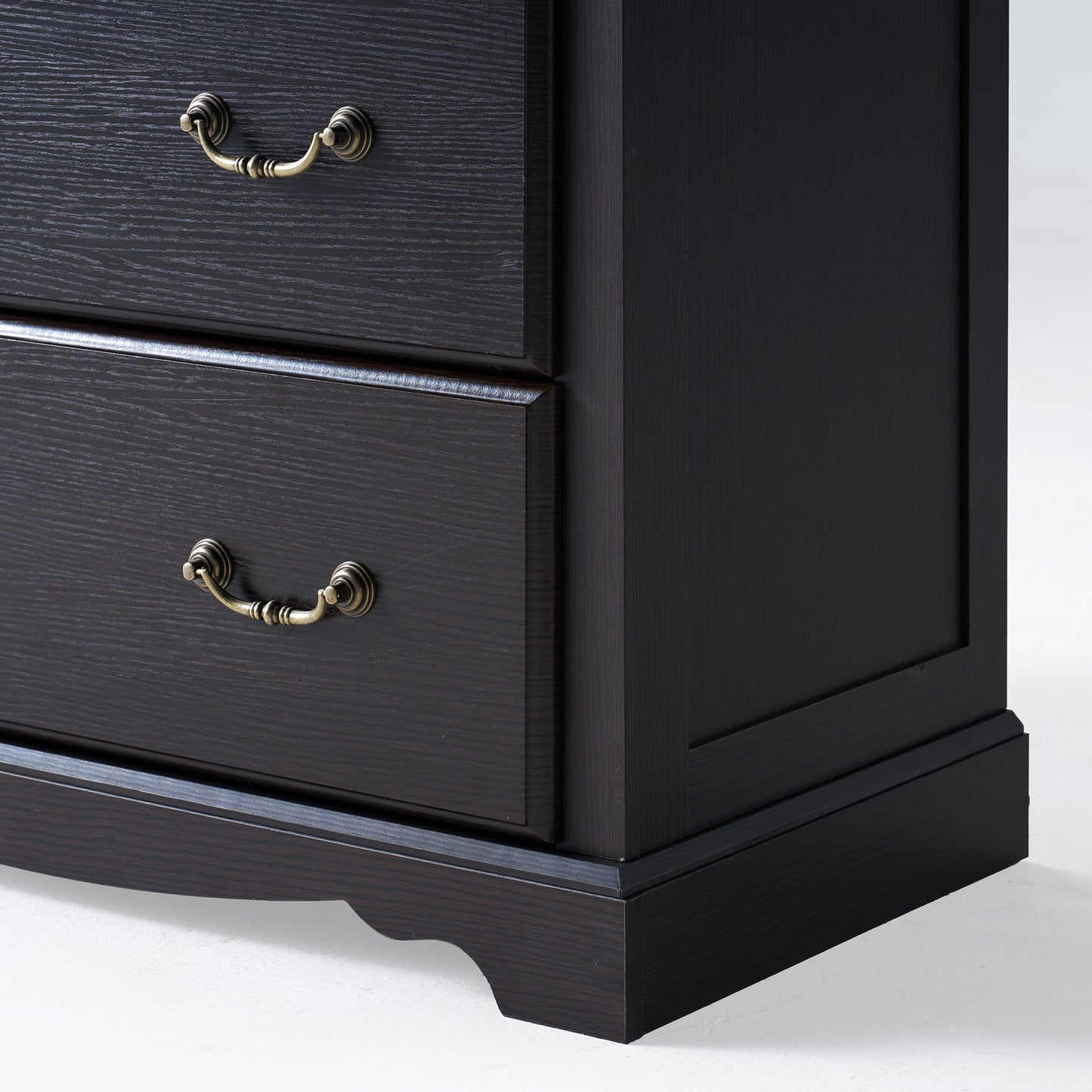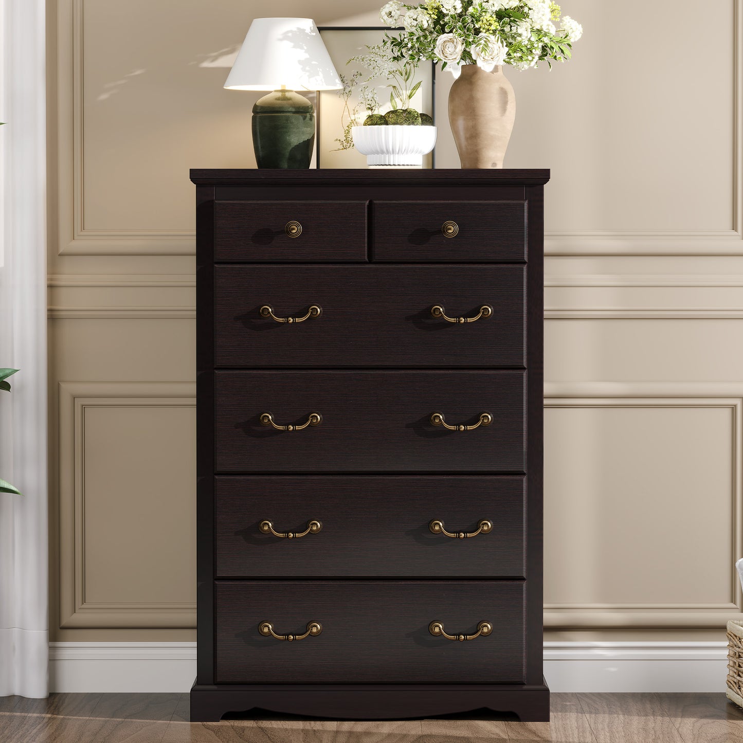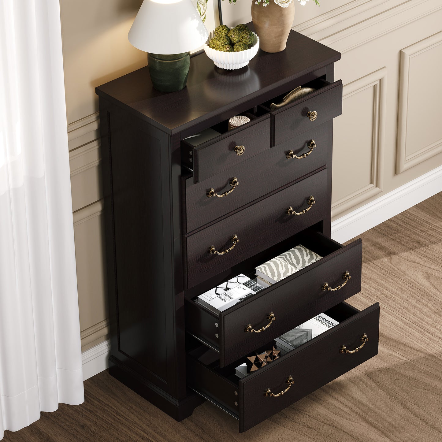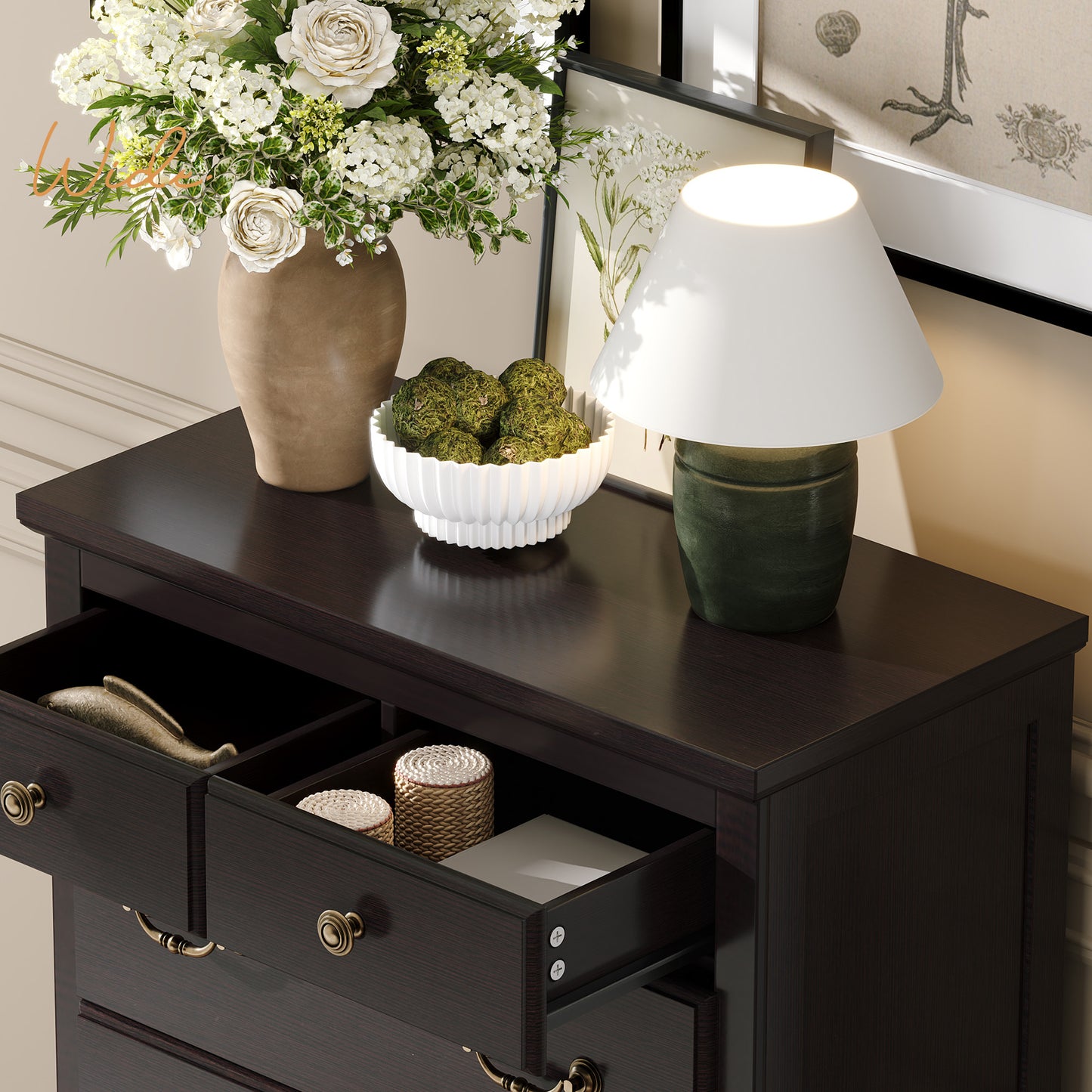 6 Drawer Chest showcases a rustic farmhouse design with 3D raised drawer fronts, beautifully accented by antique bronze handles. With its antique finish, this dresser fits various spaces—whether in the bedroom for clothes, the living room for media storage, or the hallway for extra organization.