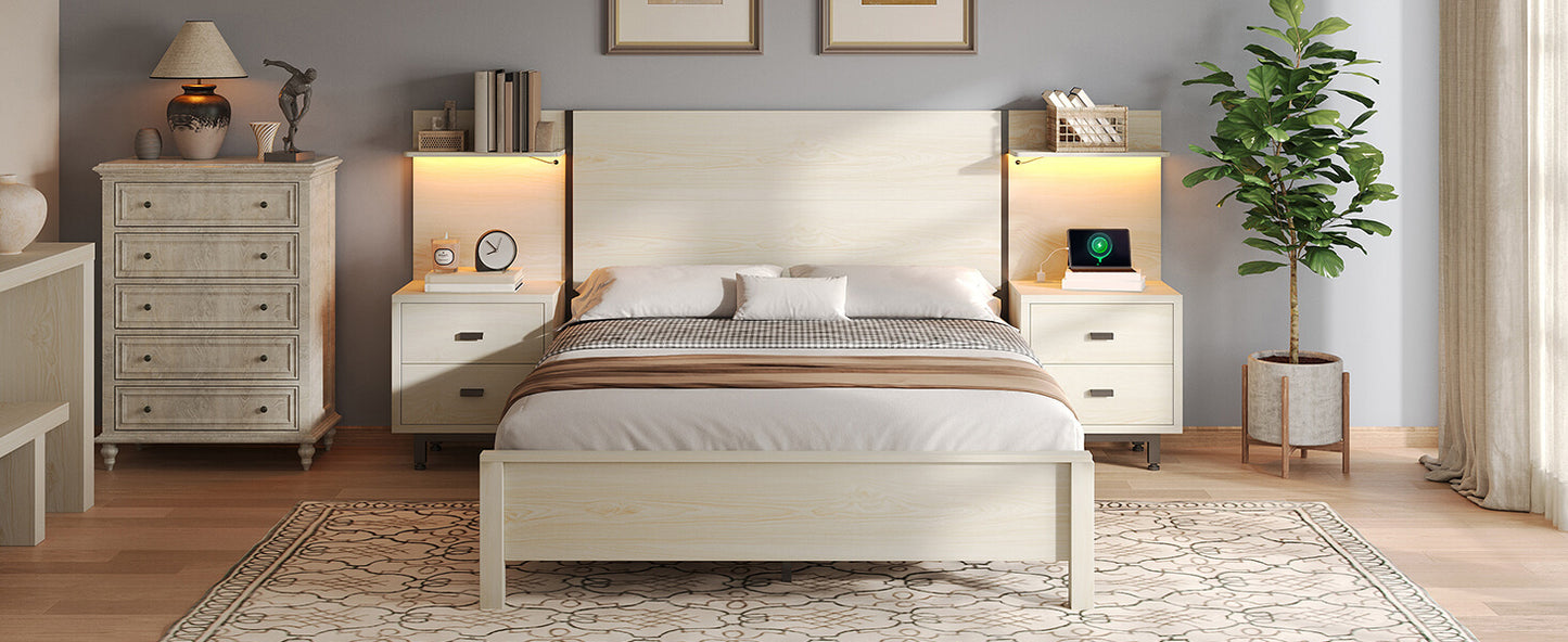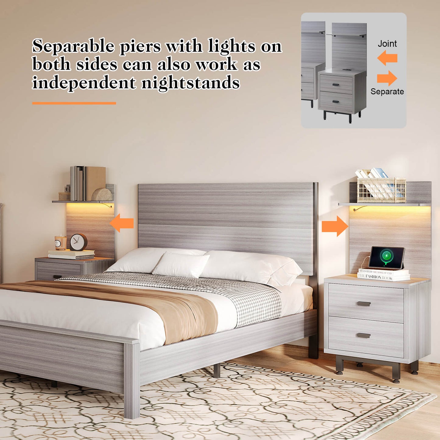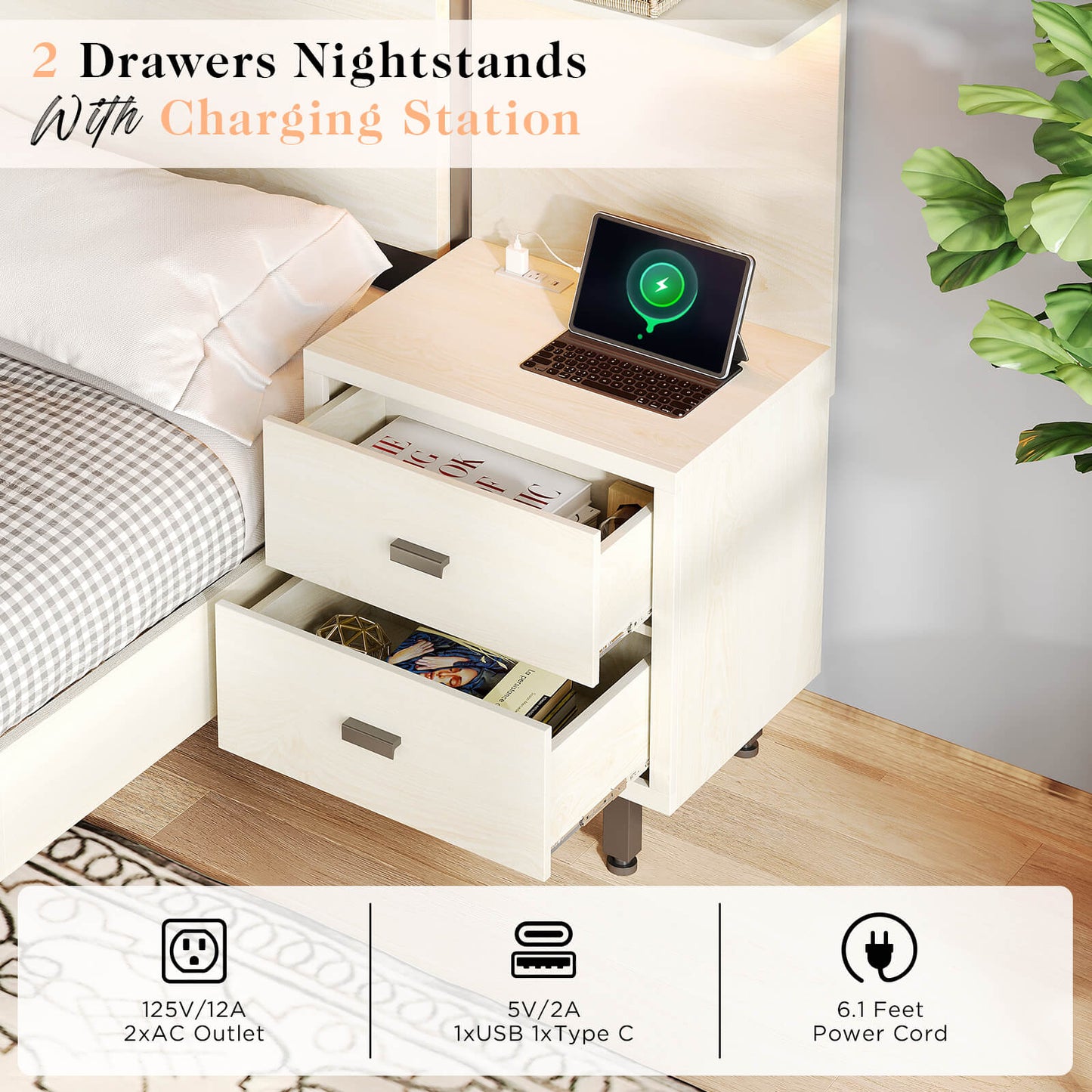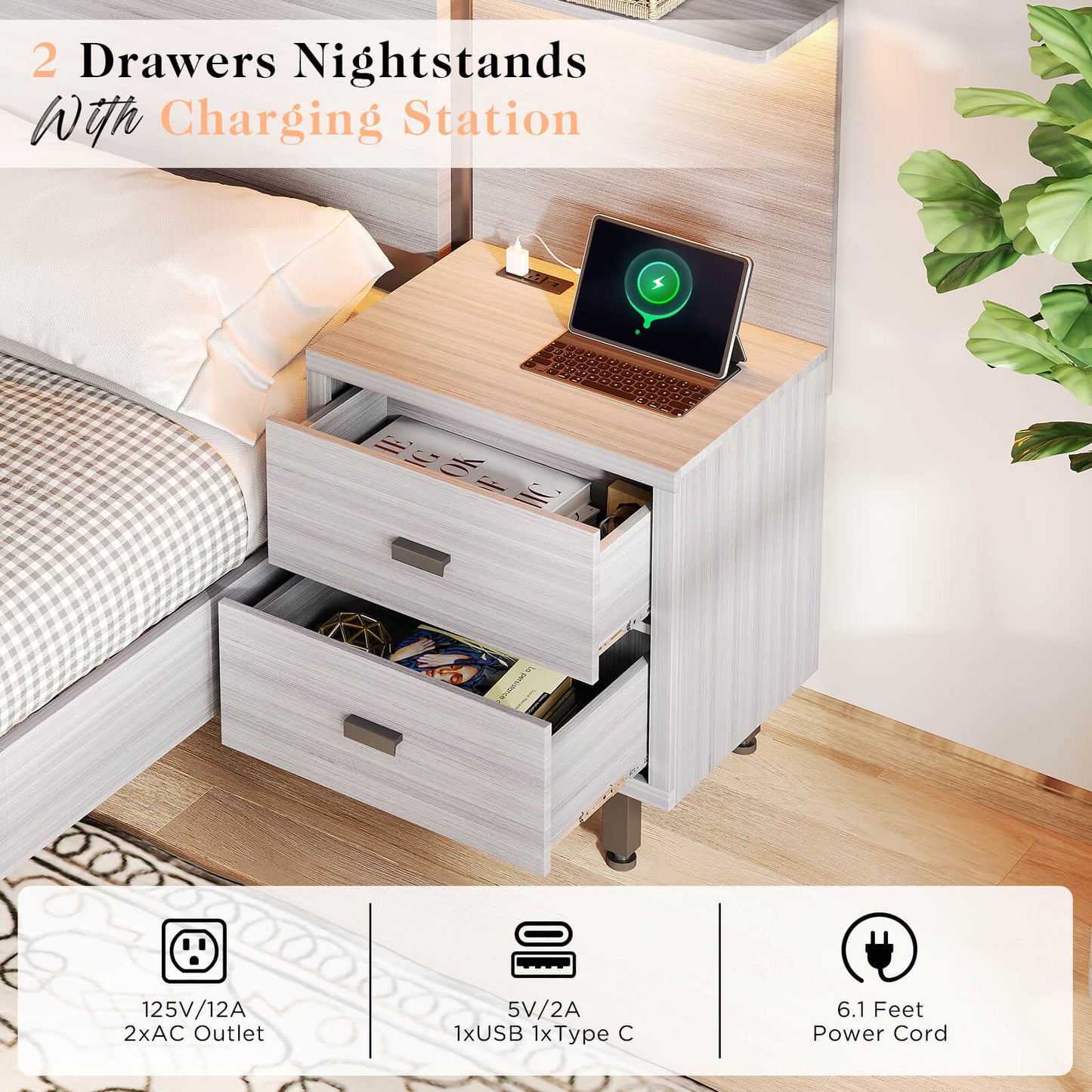 The platform bed each end table feature 2 large drawers, keeping your bedroom organized. Build-in power station including 2xAC outlets, 1xUSB ports, and 1xType C, making your life more convenient