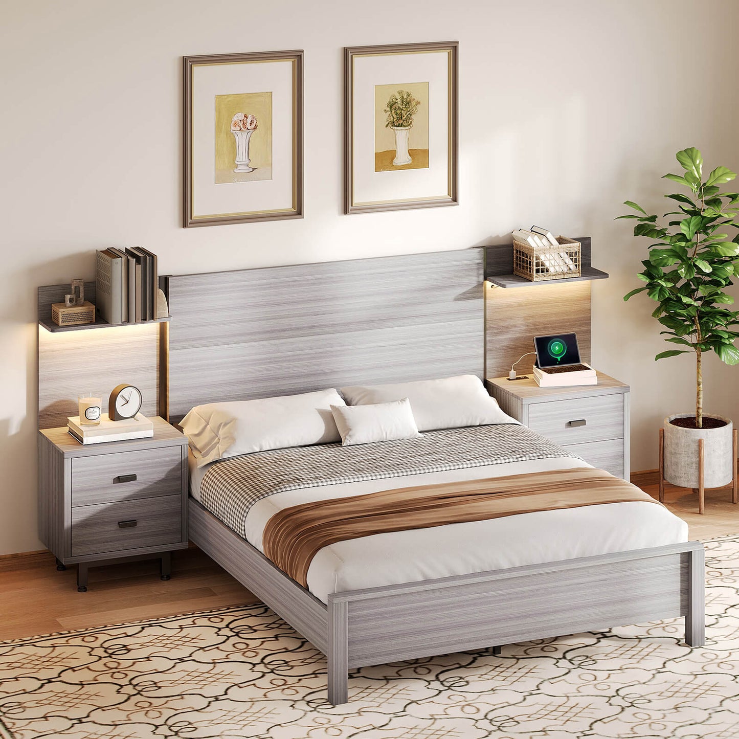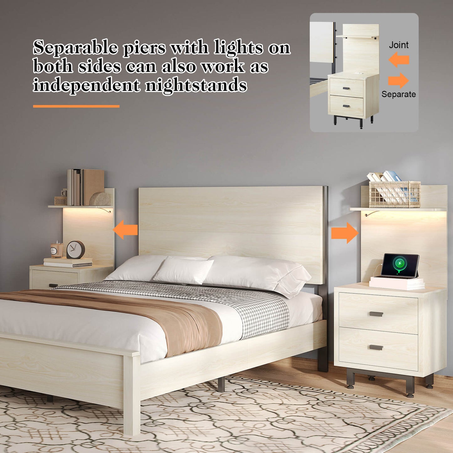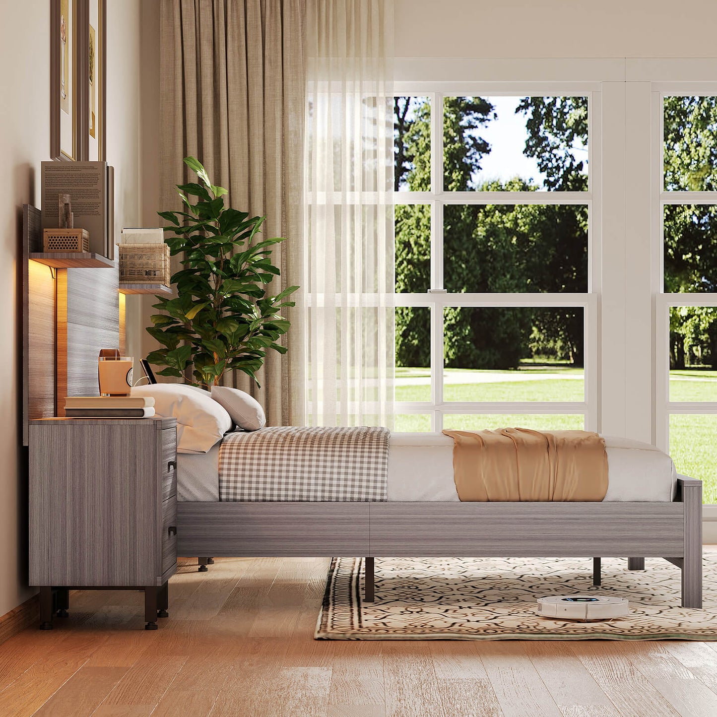 The platform bed each end table feature 2 large drawers, keeping your bedroom organized. Build-in power station including 2xAC outlets, 1xUSB ports, and 1xType C, making your life more convenient