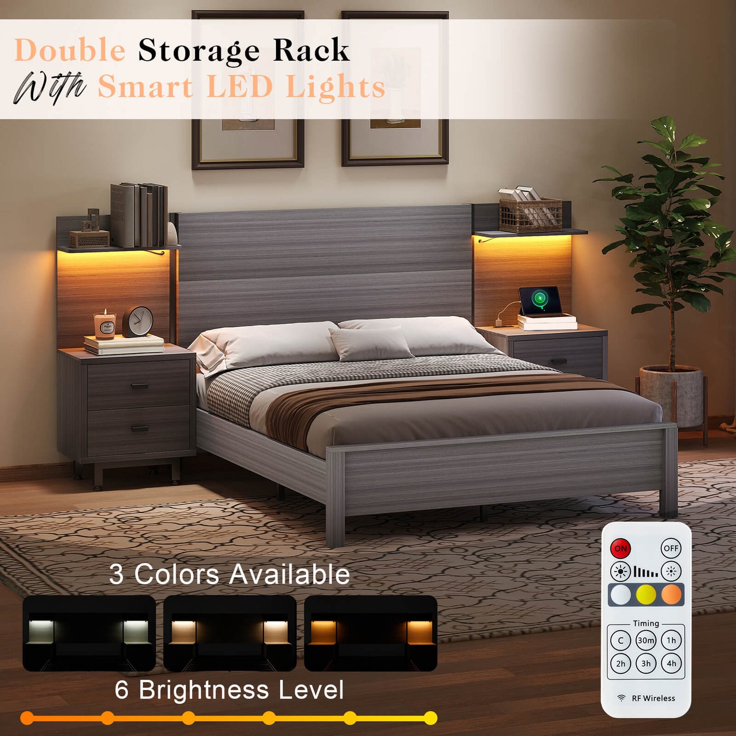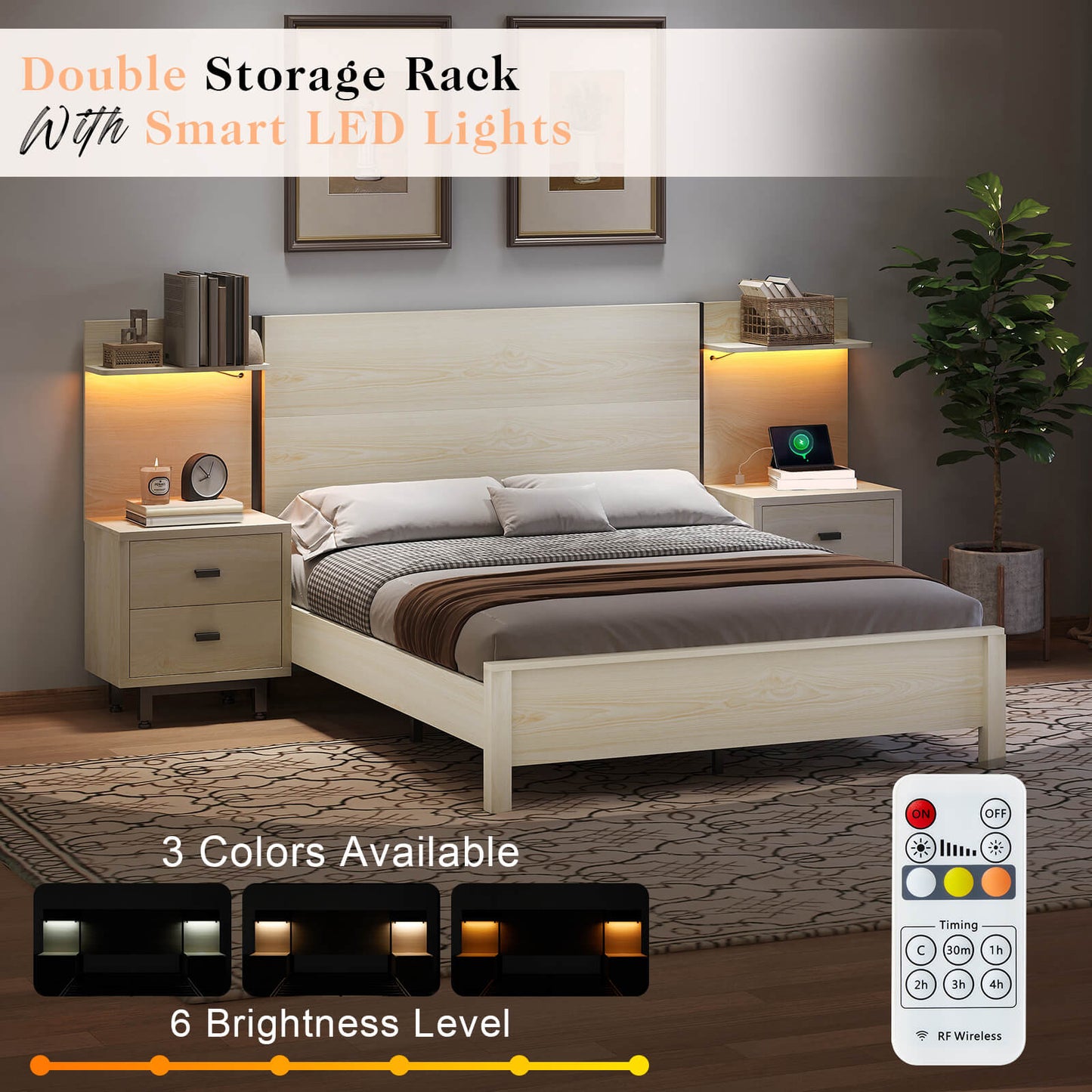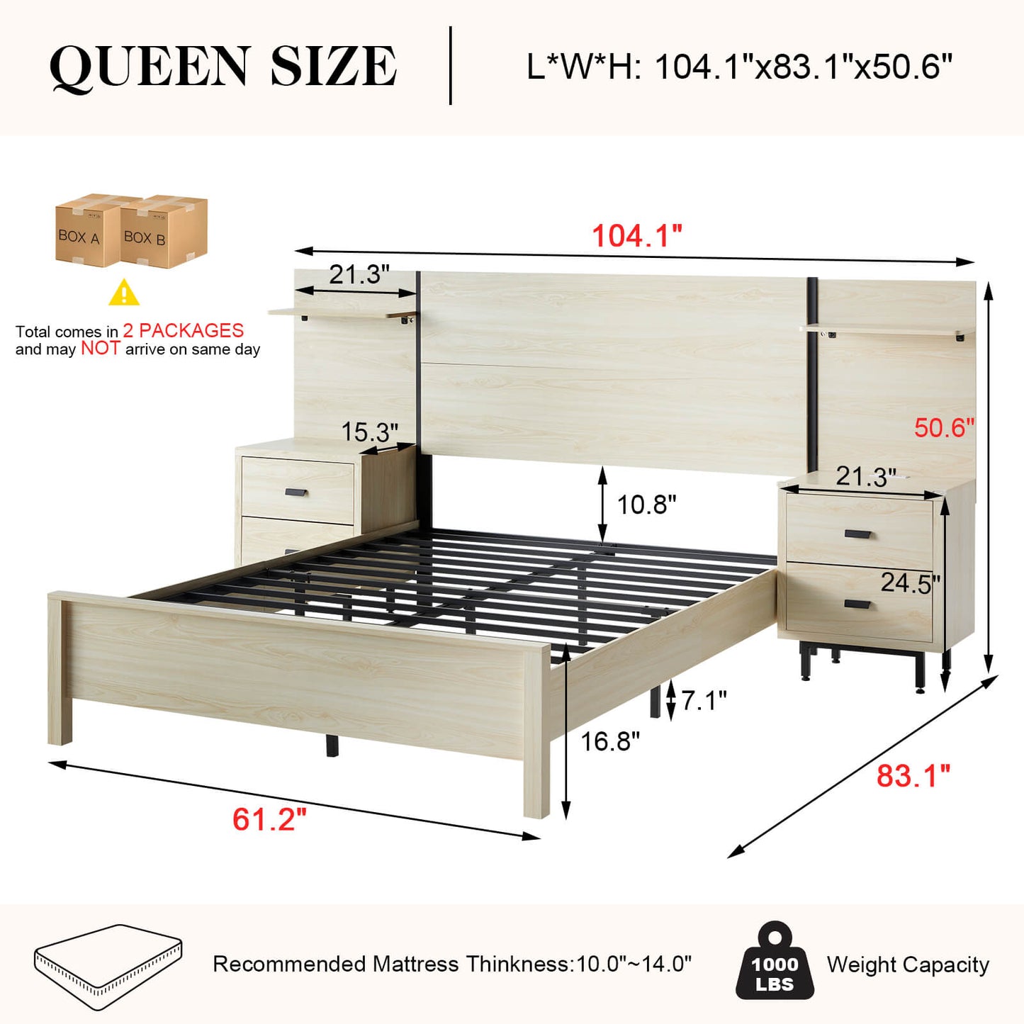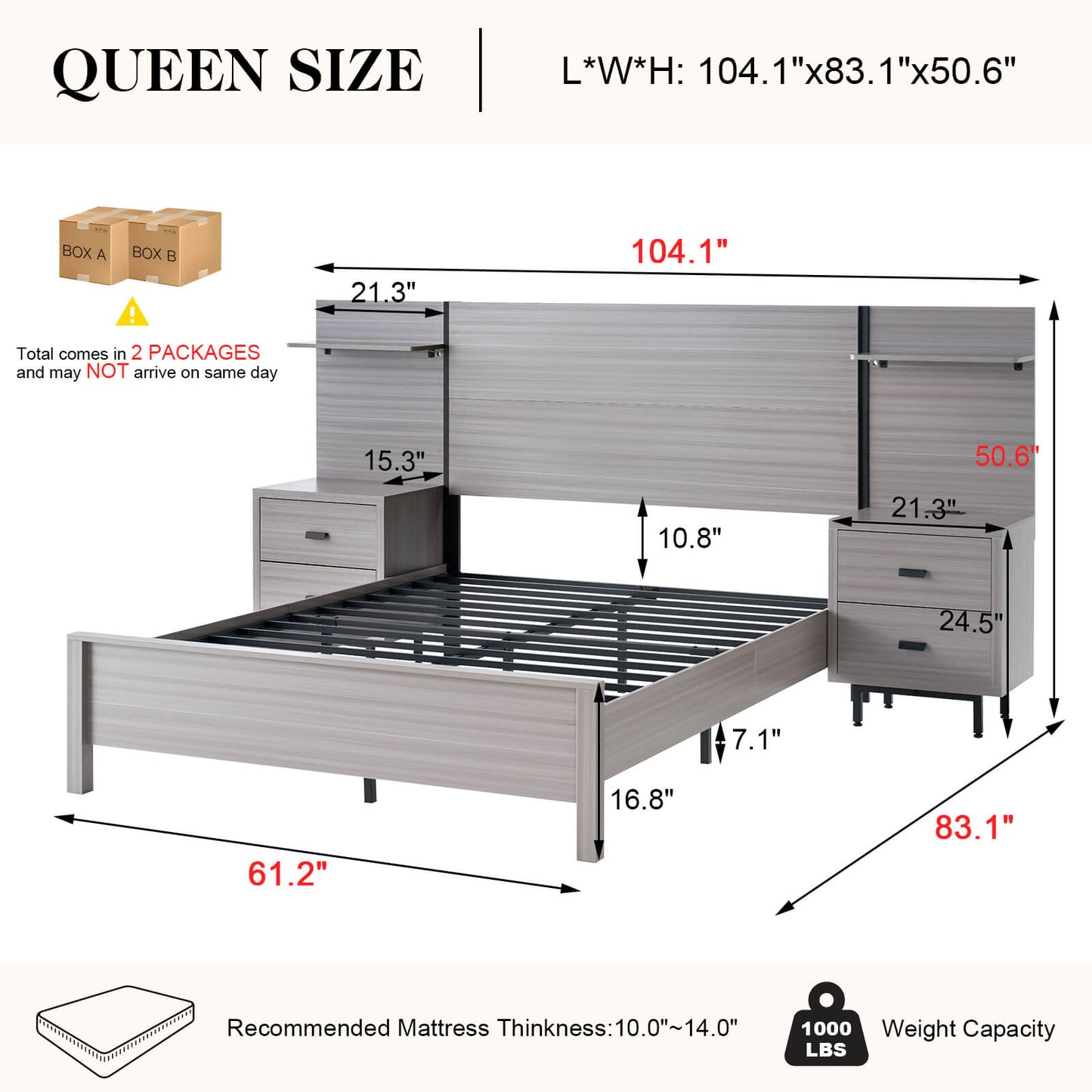 The Evelyn Queen Bed Frame is a modern and functional centerpiece for your bedroom. Featuring an extra-wide 104” headboard with integrated nightstands, it offers both style and space efficiency. The built-in power station includes AC outlets, USB, and Type-C ports, ensuring convenience at your fingertips. Floating shelves with LED lights add ambient lighting with adjustable brightness and colors. Crafted from high-quality MDF and reinforced with 12 metal slats, this bed supports up to 1000 lbs without the need for a box spring. Easy to assemble and designed for comfort, the Evelyn Queen Bed Frame brings a sleek, organized, and high-tech touch to any modern bedroom.
