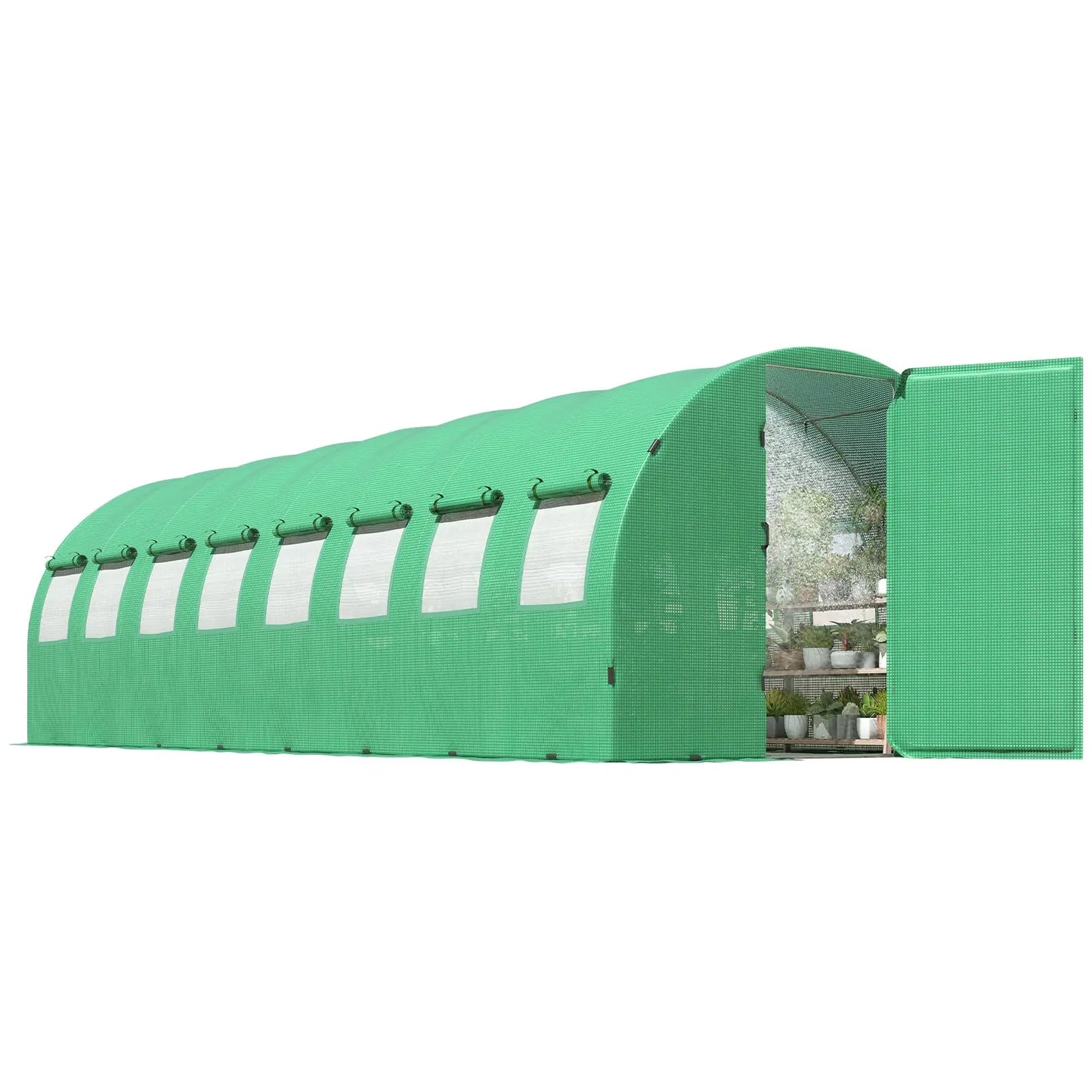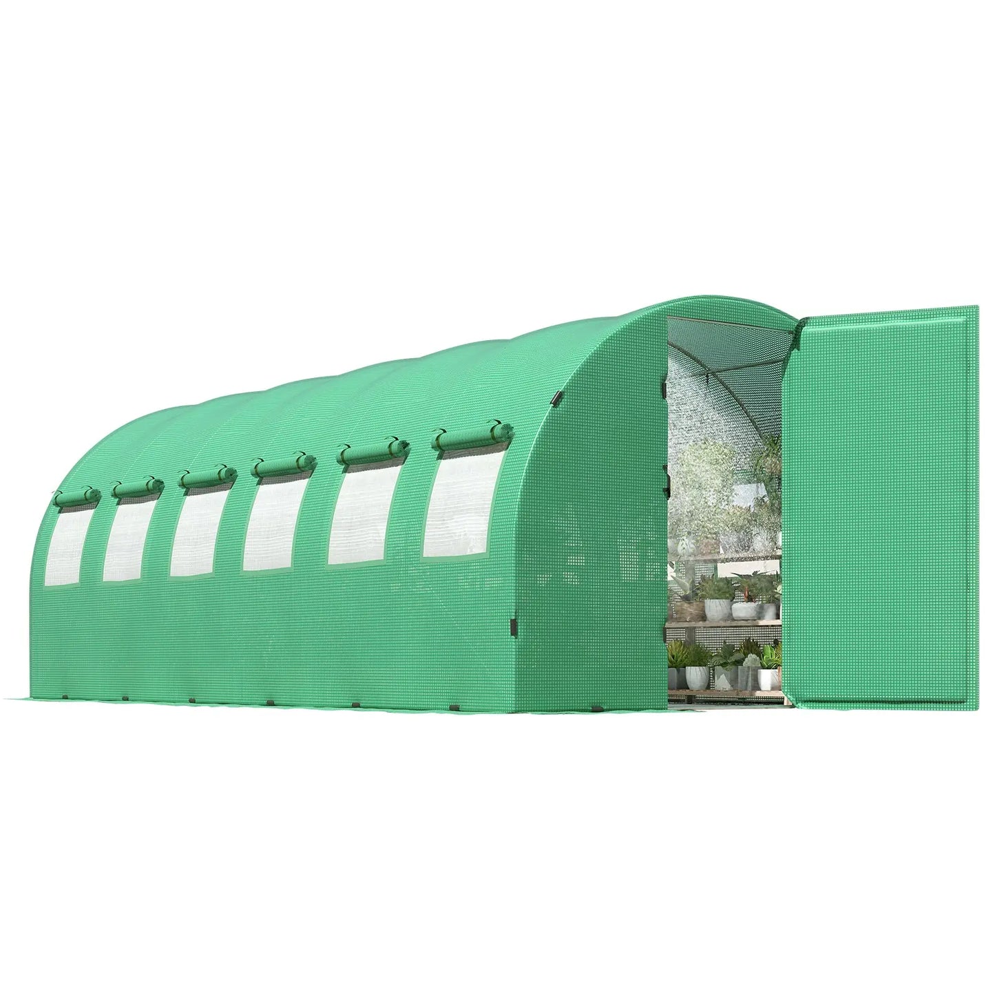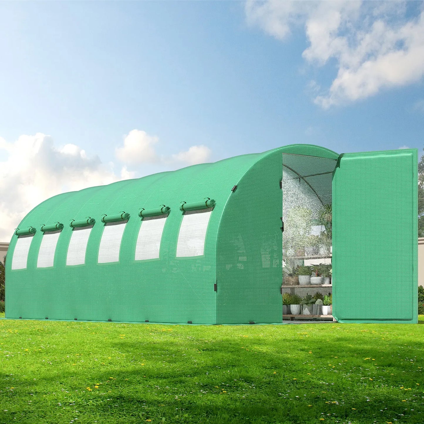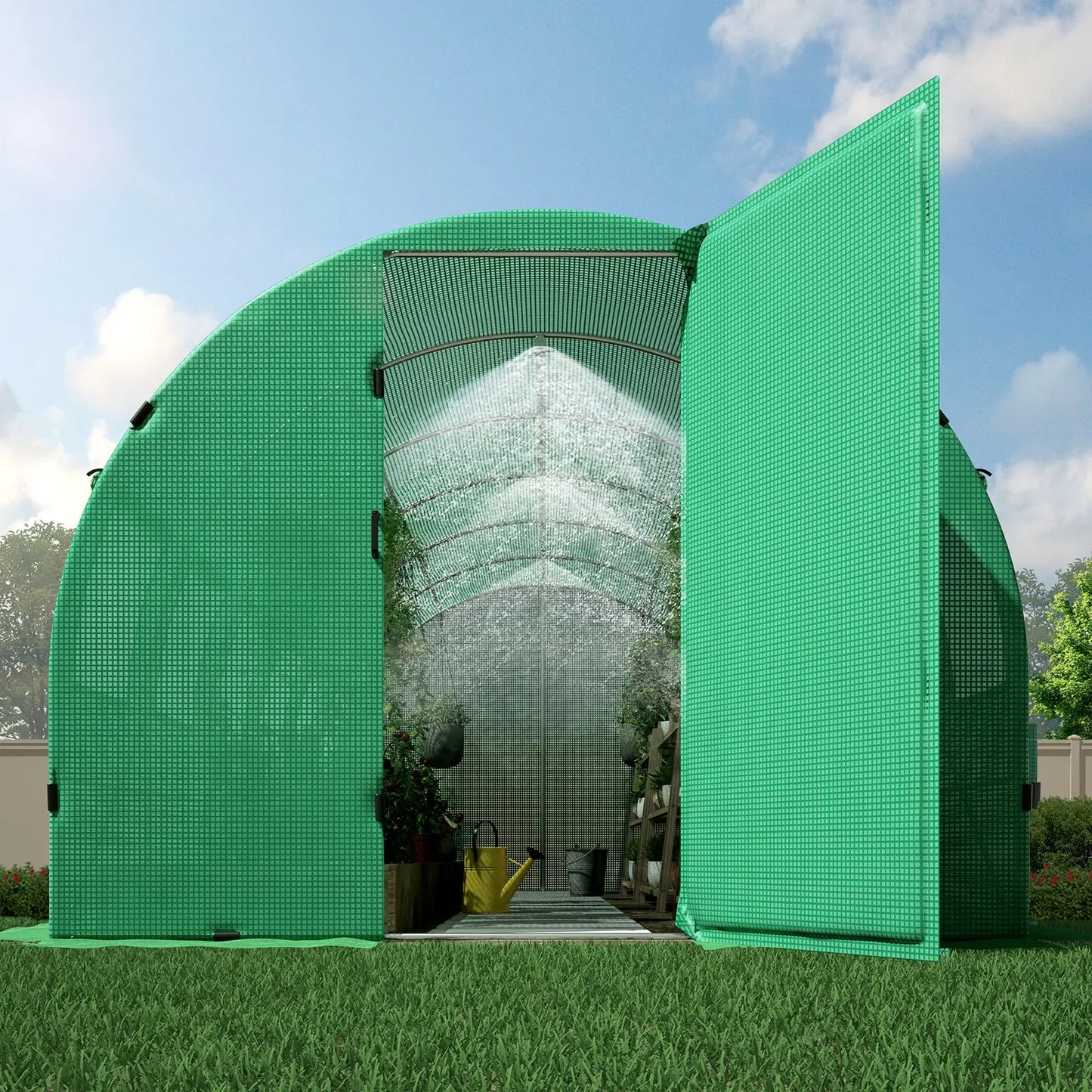 Freely enter and exit the Large greenhouses with the adjustable 180-Degree door frames. Swing doors can be locked by chains, and 12/16 roller mesh screen windows, keep the air flowing and other troublemakers out of your garden greenhouse.