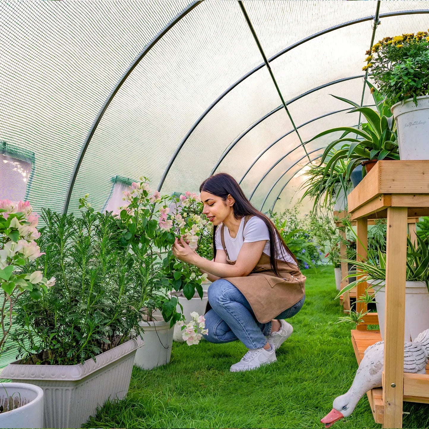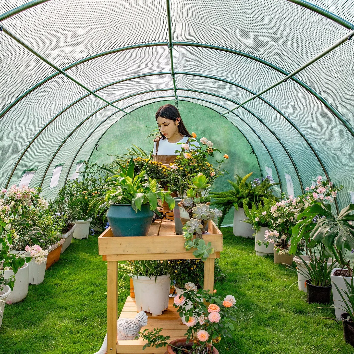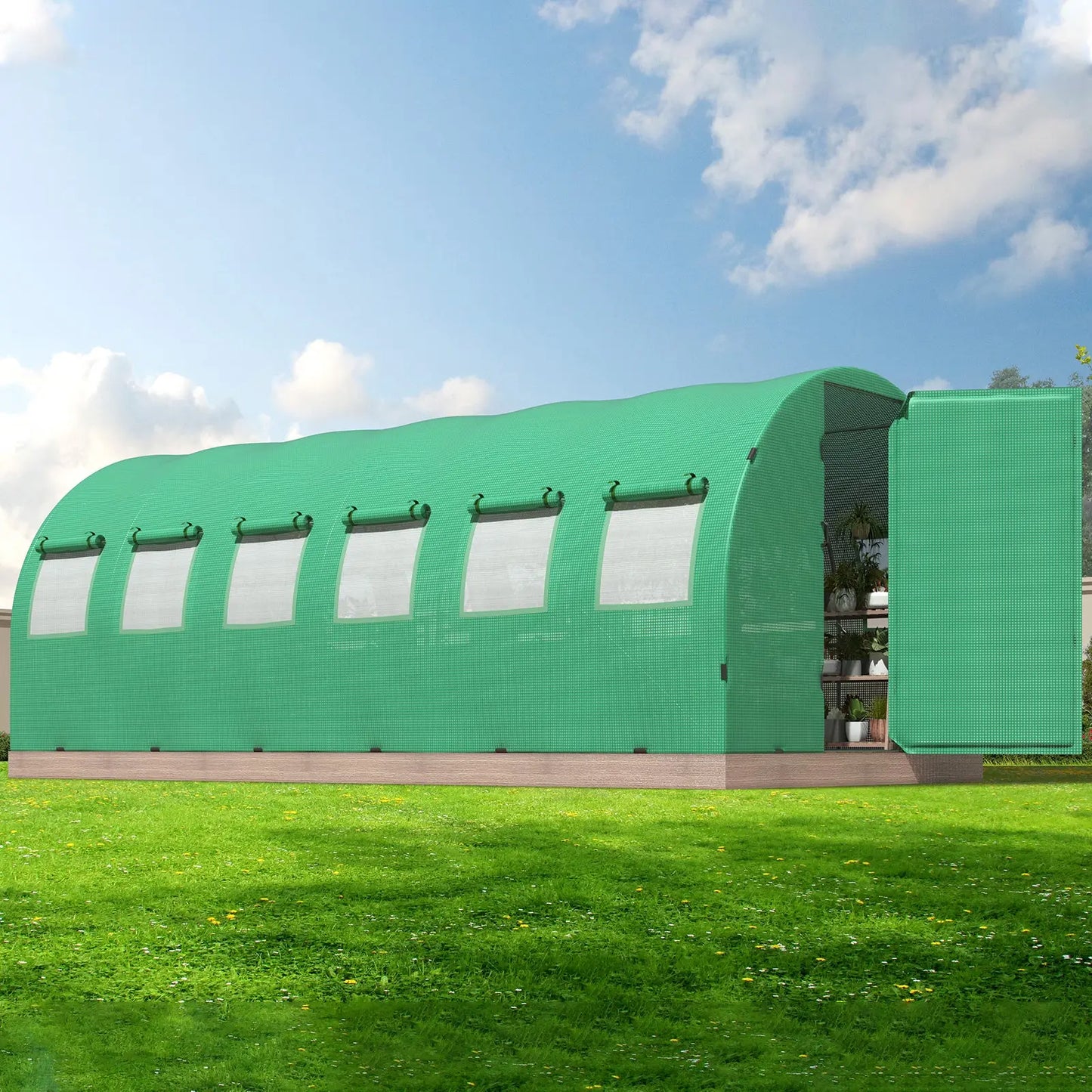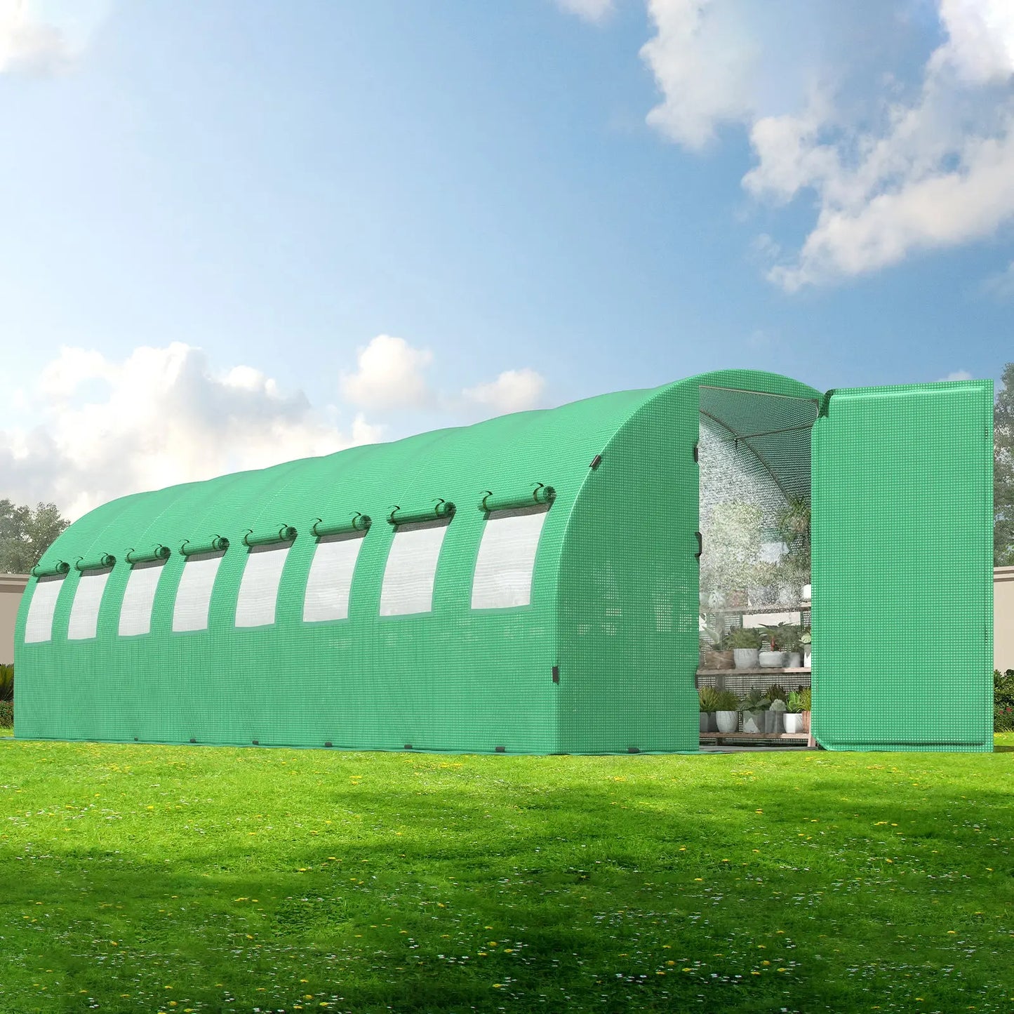 Freely enter and exit the Large greenhouses with the adjustable 180-Degree door frames. Swing doors can be locked by chains, and 12/16 roller mesh screen windows, keep the air flowing and other troublemakers out of your garden greenhouse.