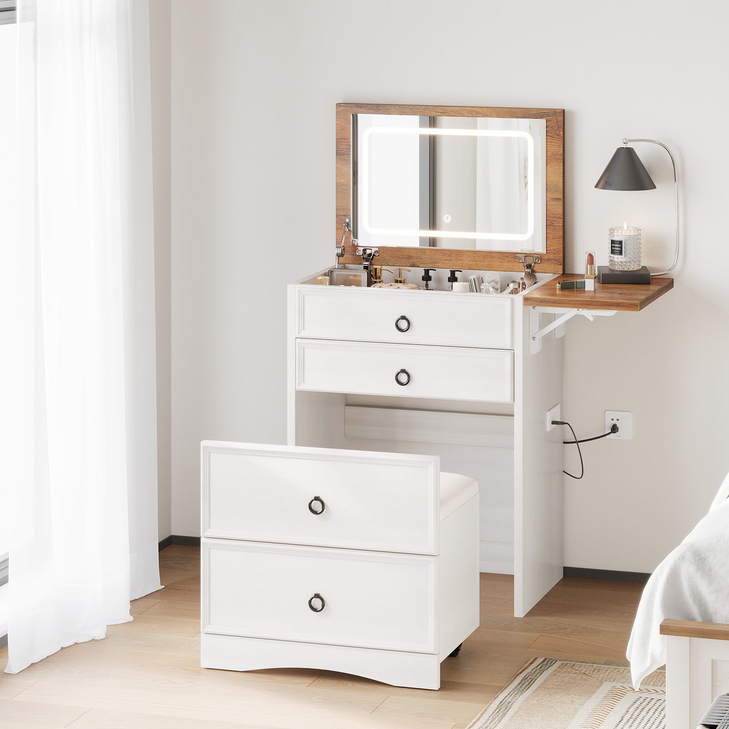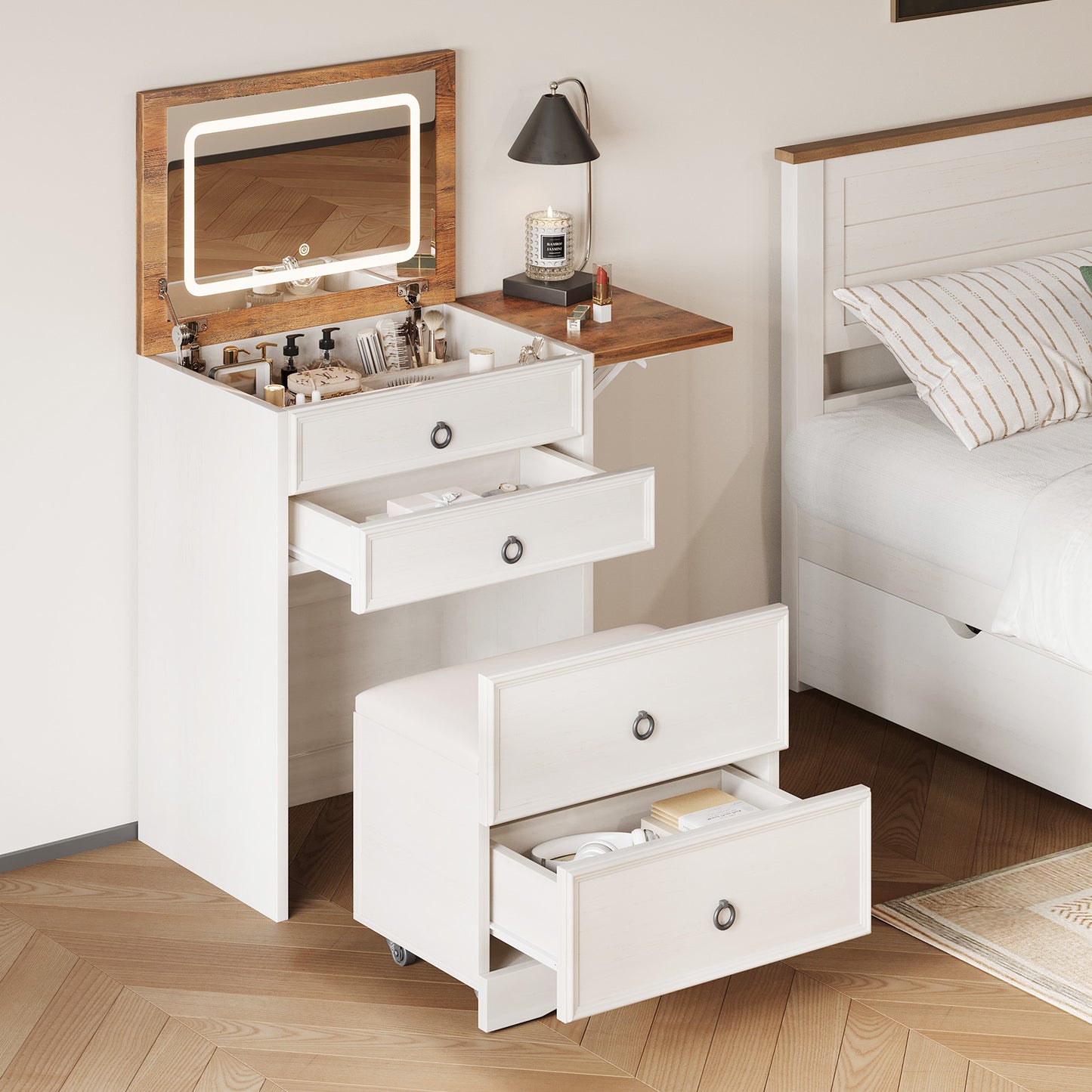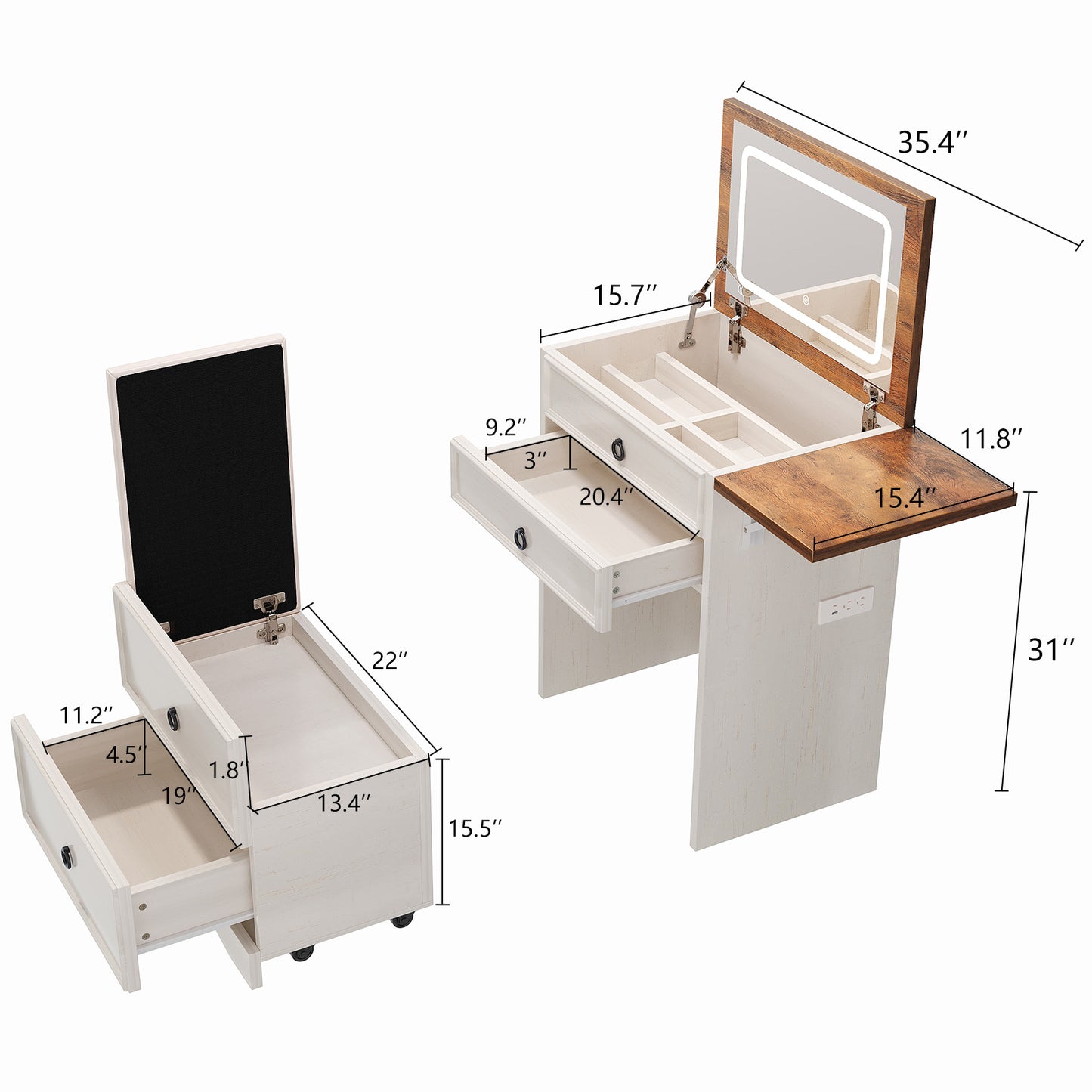 The Eyre 3 in 1 Makeup Vanity redefines versatility, functioning as a makeup vanity, sideboard, and table set to adapt seamlessly to any space. Featuring a sliding HD mirror with adjustable LED lights in cool white, warm white, and natural light, it ensures perfect illumination for your beauty routine. Thoughtfully designed with ample storage, it includes a flip-top jewelry case, a concealed compartment for taller items, a drawer, and a plush bench with an organizer tray to keep your essentials tidy. Built from durable wood with scratch-resistant glass and rust-proof metal, the 1" thick tabletop supports up to 50 lbs. Combining style and practicality, the Eyre vanity is easy to assemble with step-by-step instructions, making it the perfect addition to your home.